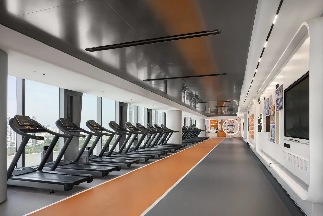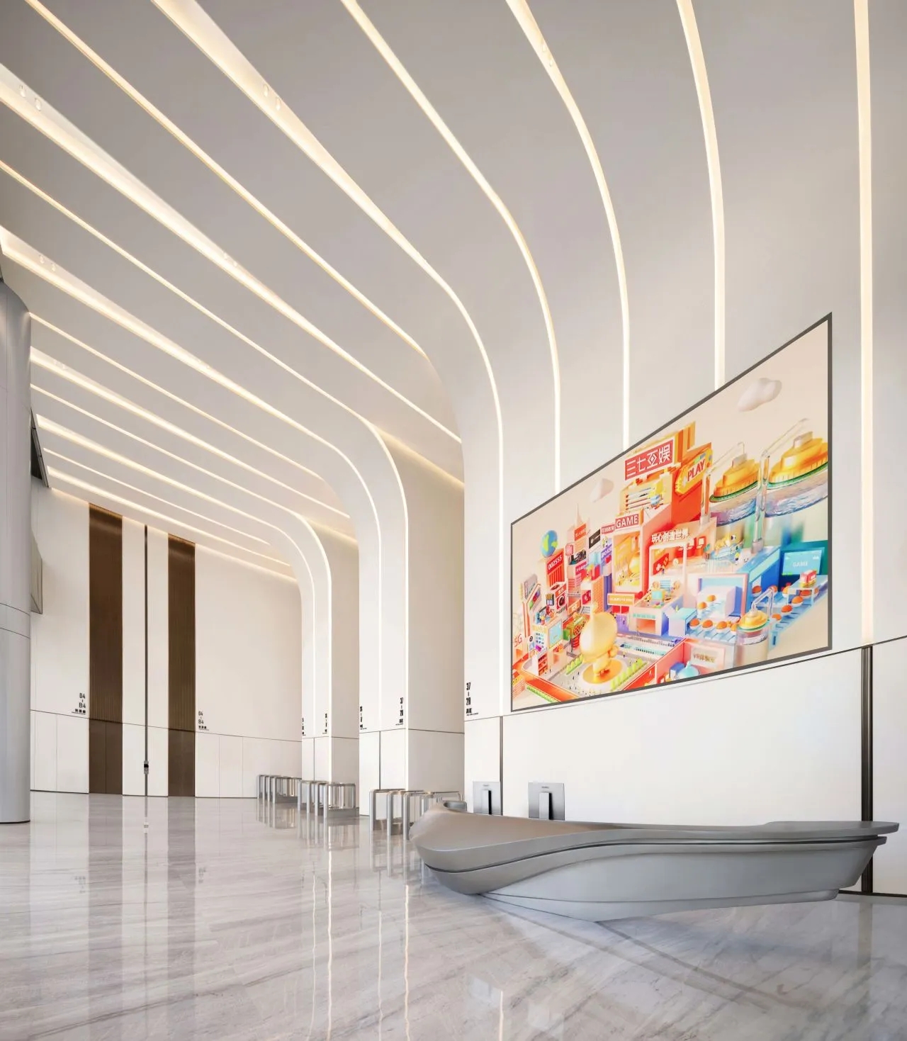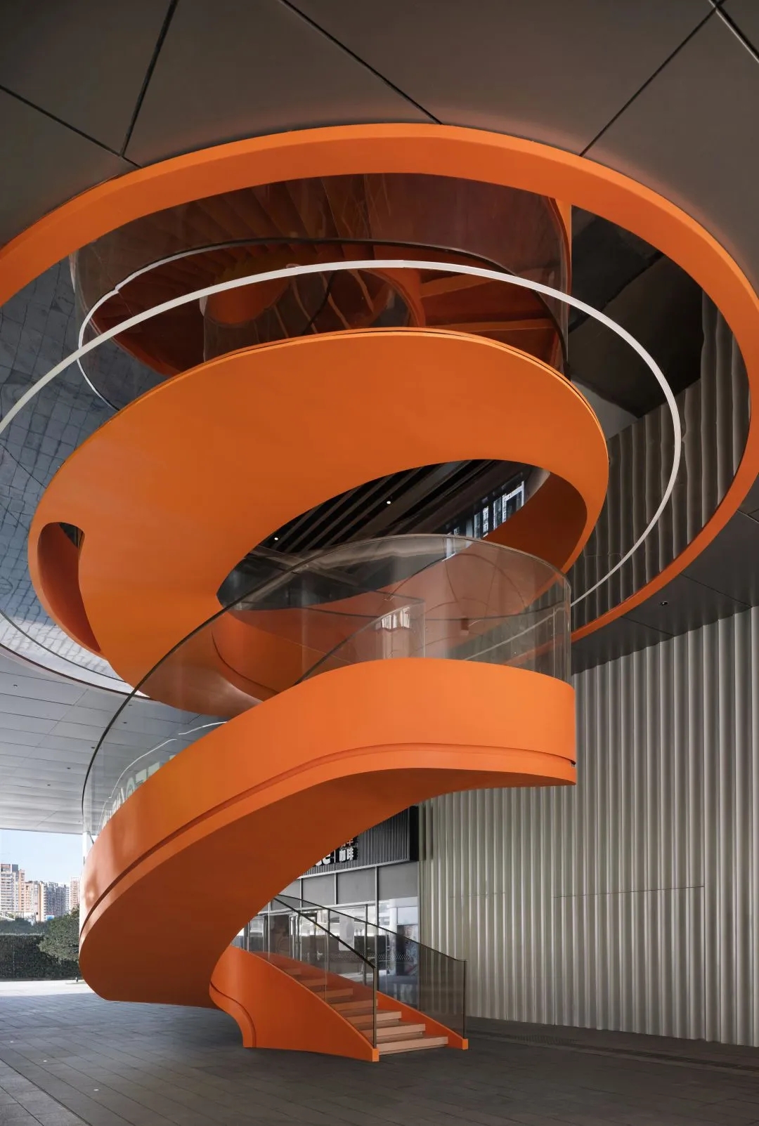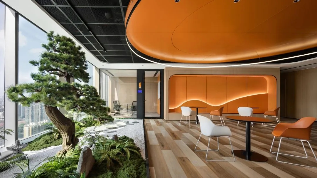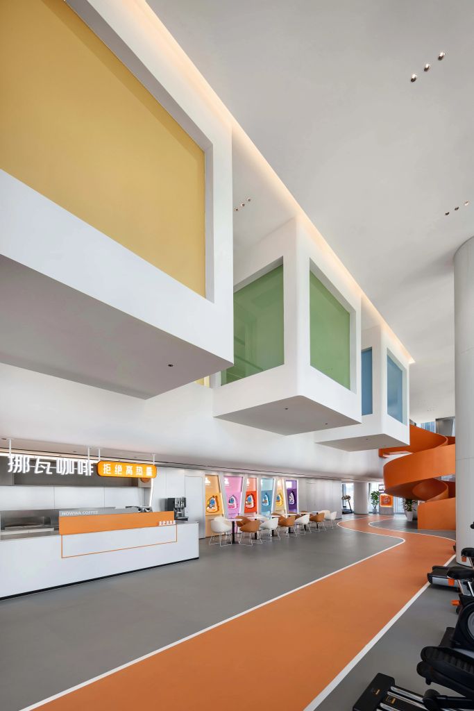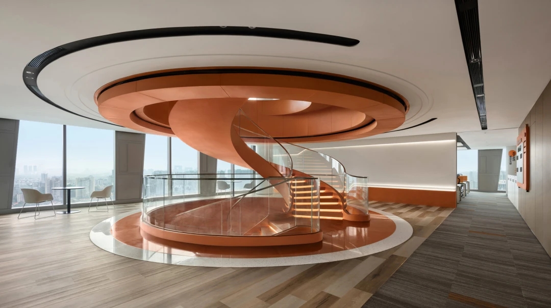 主梯設計靈感來源於三七互娛LOGO,融合了造型與色調,成為一扇通往「玩家」世界的時空之門。旋轉的階梯,拾階而上,昂揚向上的活力橙色。黃綠系傳遞著自然的神秘與探索樂趣,激發創新靈感