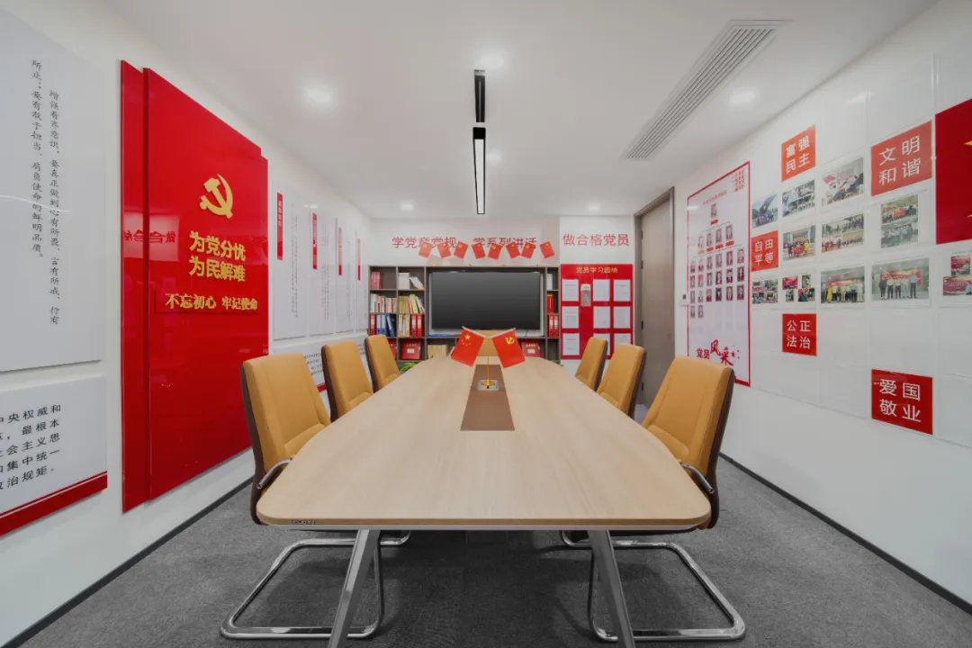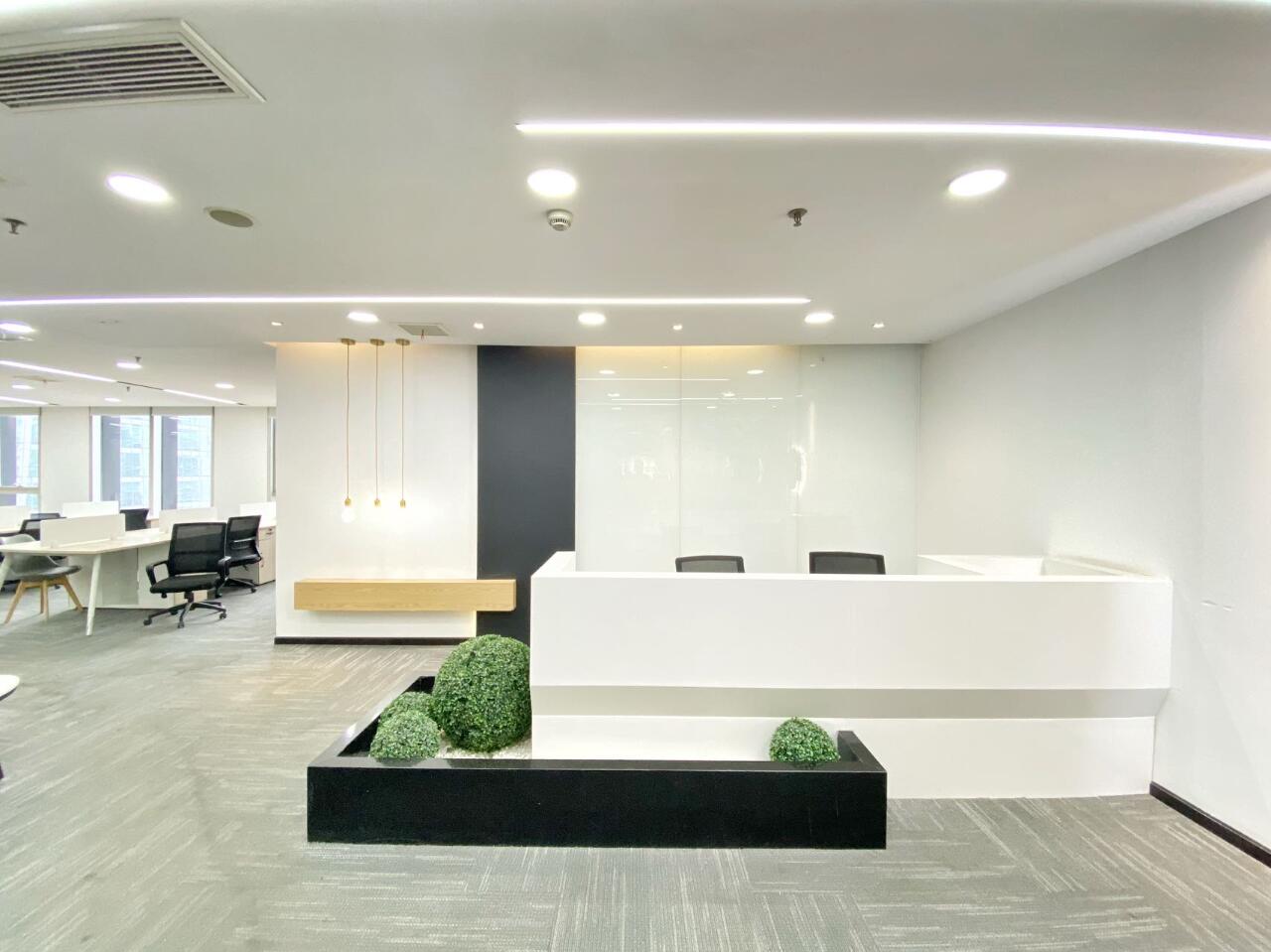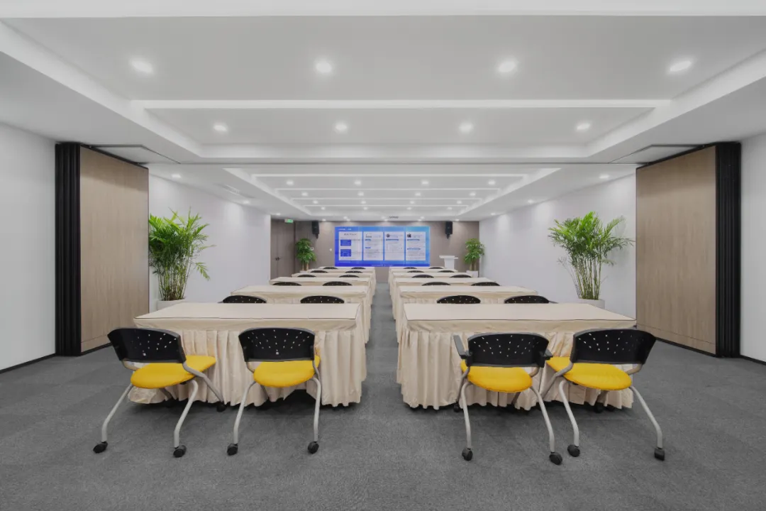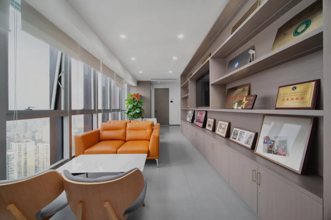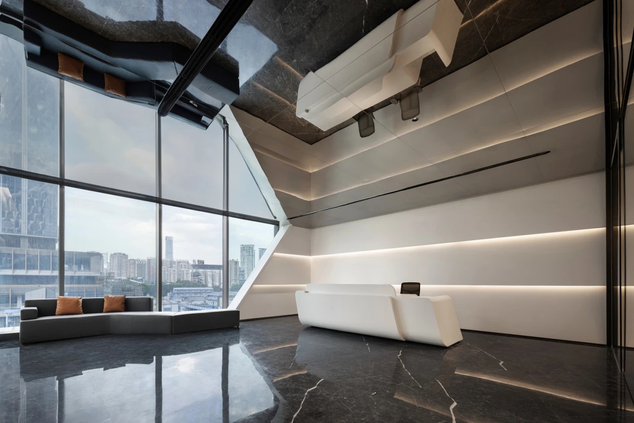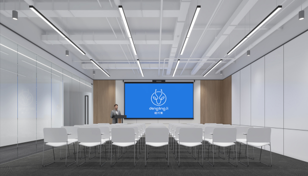 前厅灯光明亮淡雅,并照射在企业Logo上,以增强企业品牌的辨识度、体现企业文化且有艺术氛围 。合理安排有接待台、等候区、会客区、引导标志等设施,确保空间宽敞且功能齐全。