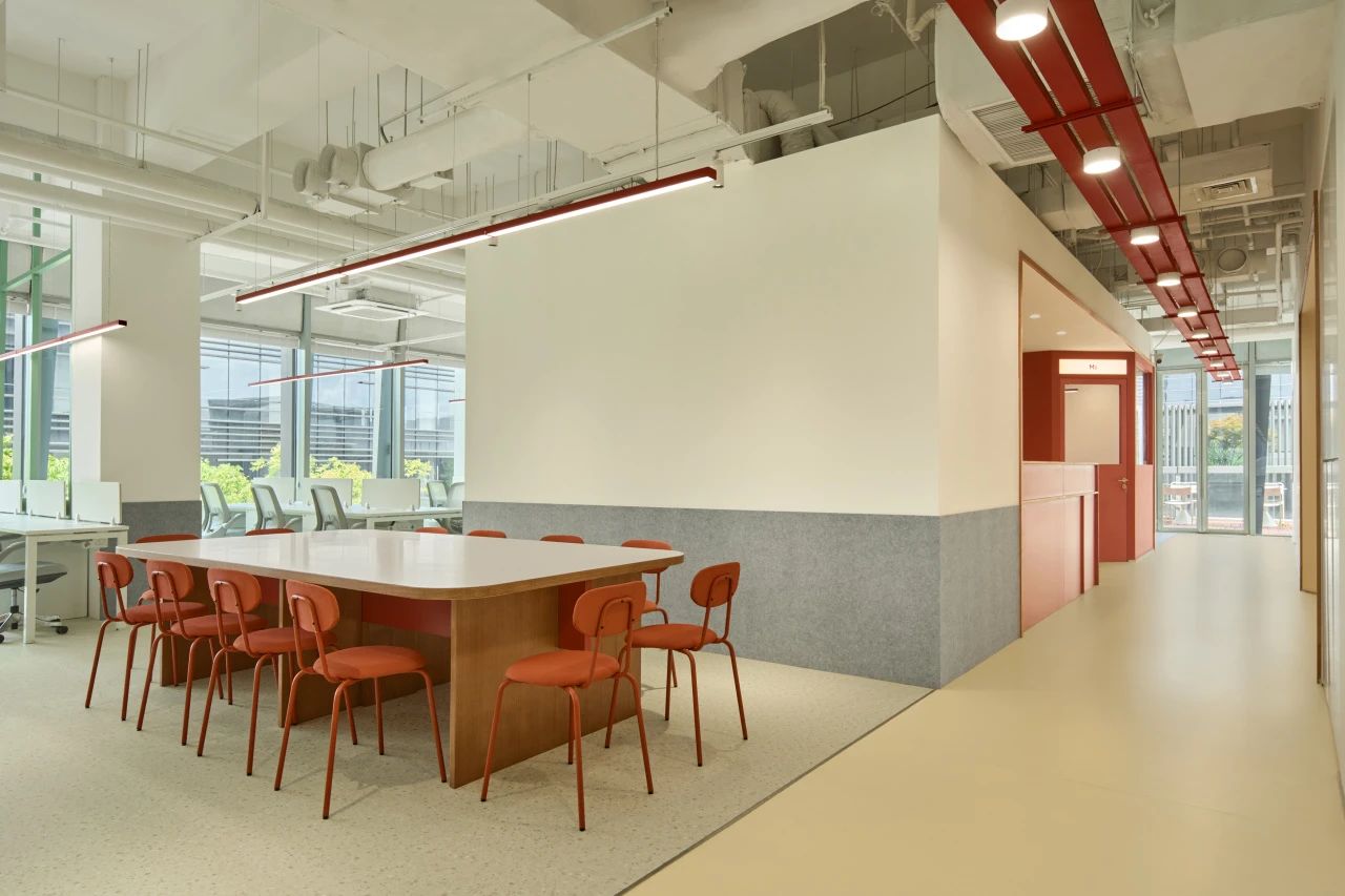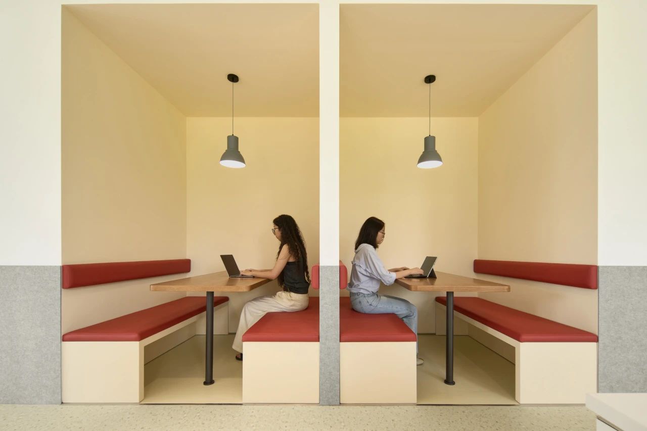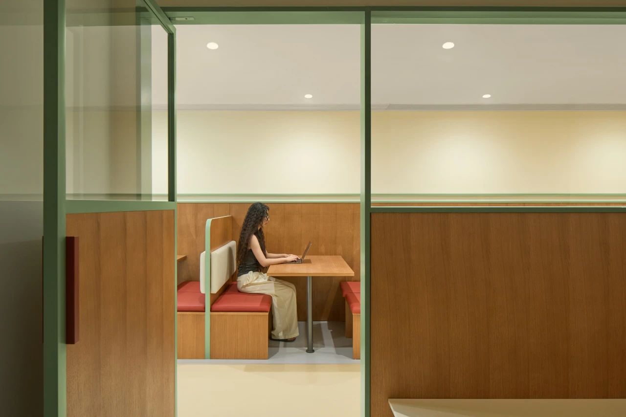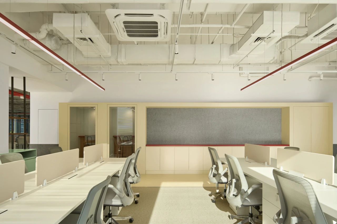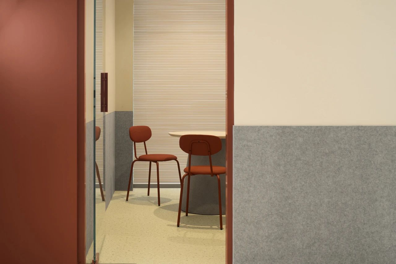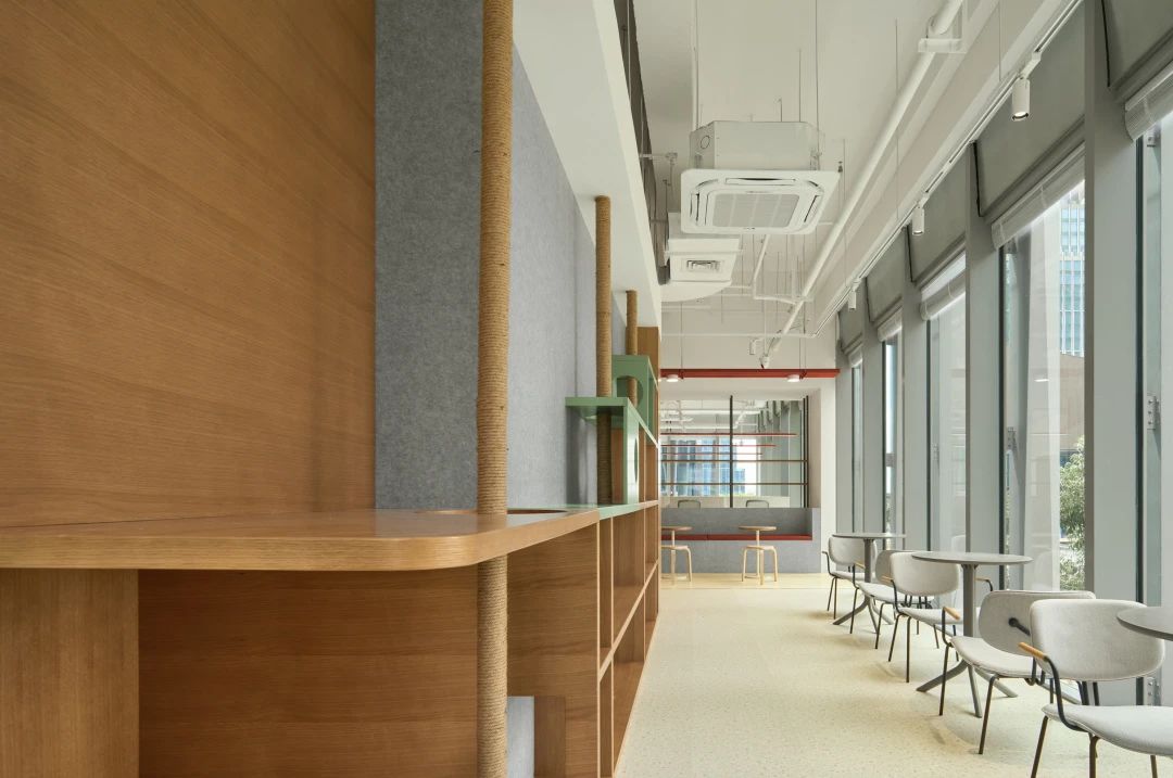 作为入口处的第一个多功能盒,这个区域也布局了封闭的小型会议空间与半开放的会谈空间,以满足不同状态下的办公需求。而多功能盒旁边则设有一个全开放的工作区,不仅可以适应多人的工作状态,还可作为讨论桌,为团队提供便利的协作空间。而另一个以创造为重点的“创作盒”则暗藏了一个全封闭的创作空间(拥有未知的入口,只有内部人员和设计师才能开启),在其外部则是配备了沙发卡座,为员工提供短暂交流或阅读的场所。同时这里也考虑到了公司的特殊员工——猫咪,我们在墙面采用灰色毛毡,并将书架和猫爬架相融合作为它们的活动区域。作为以创意作为核心的咖啡品牌,办公区域预留了充足的毛毡背板和白板,促进创作与讨论。这里也可以让员工自由发散灵感,满足兴趣爱好的追求。