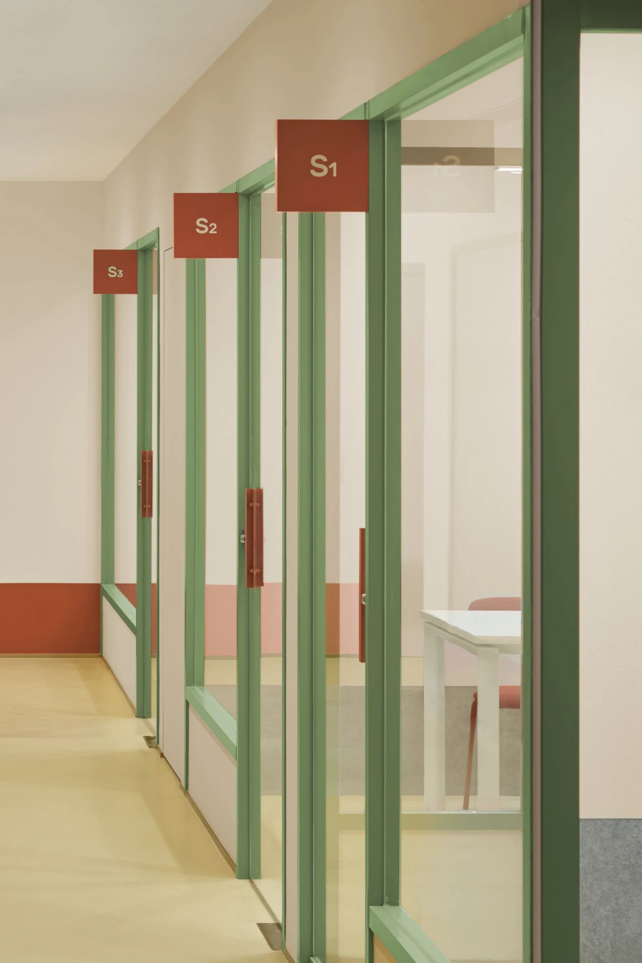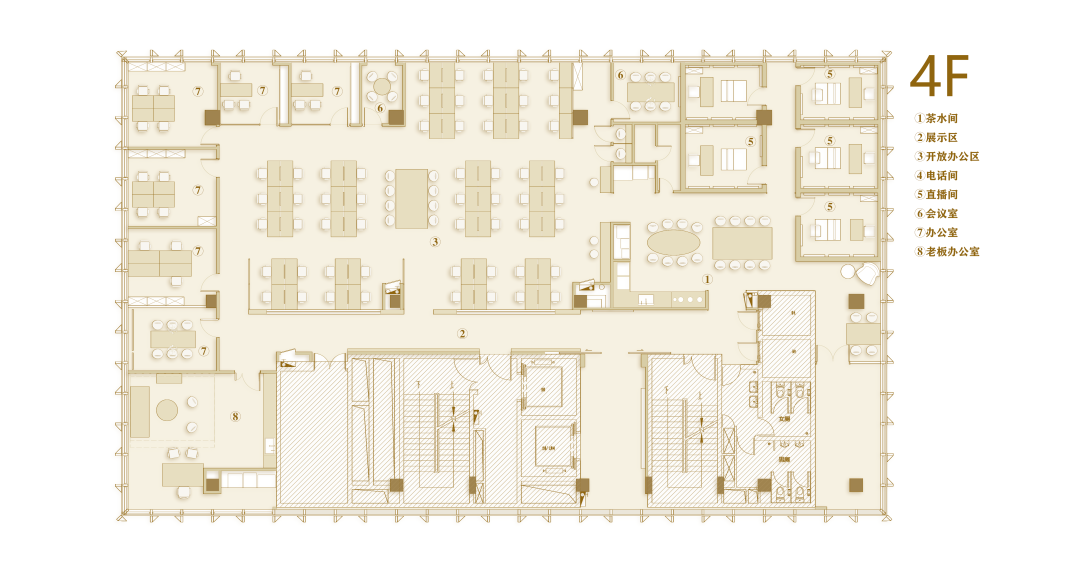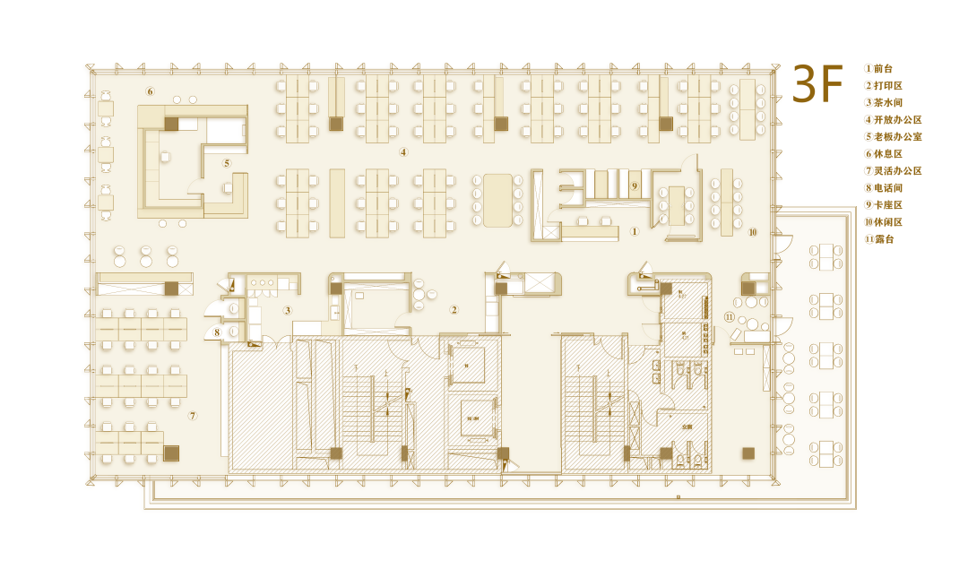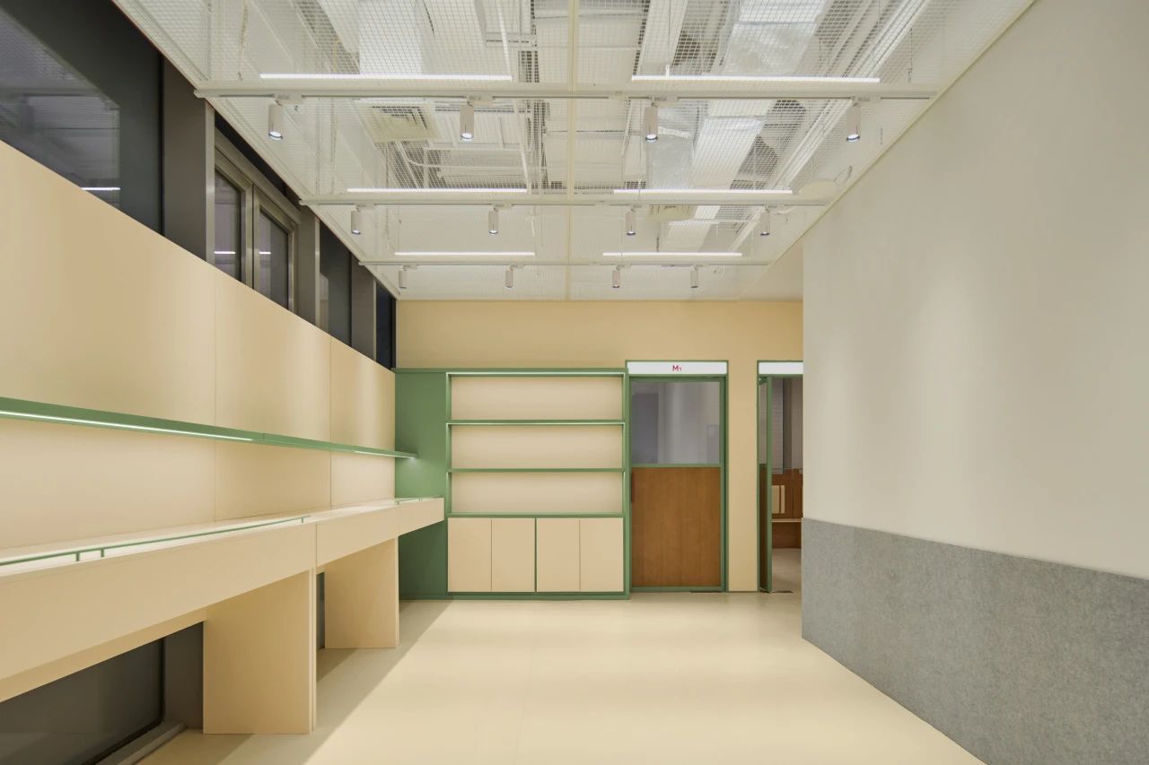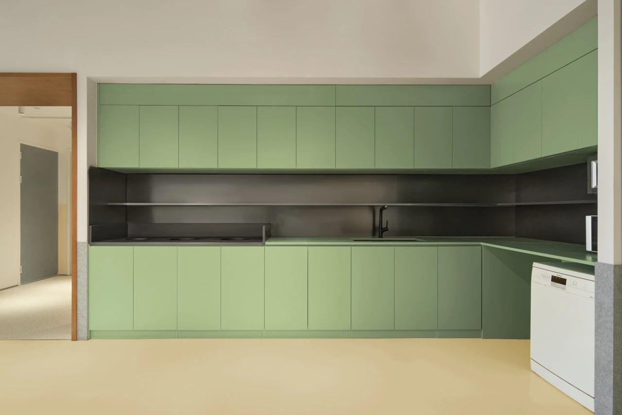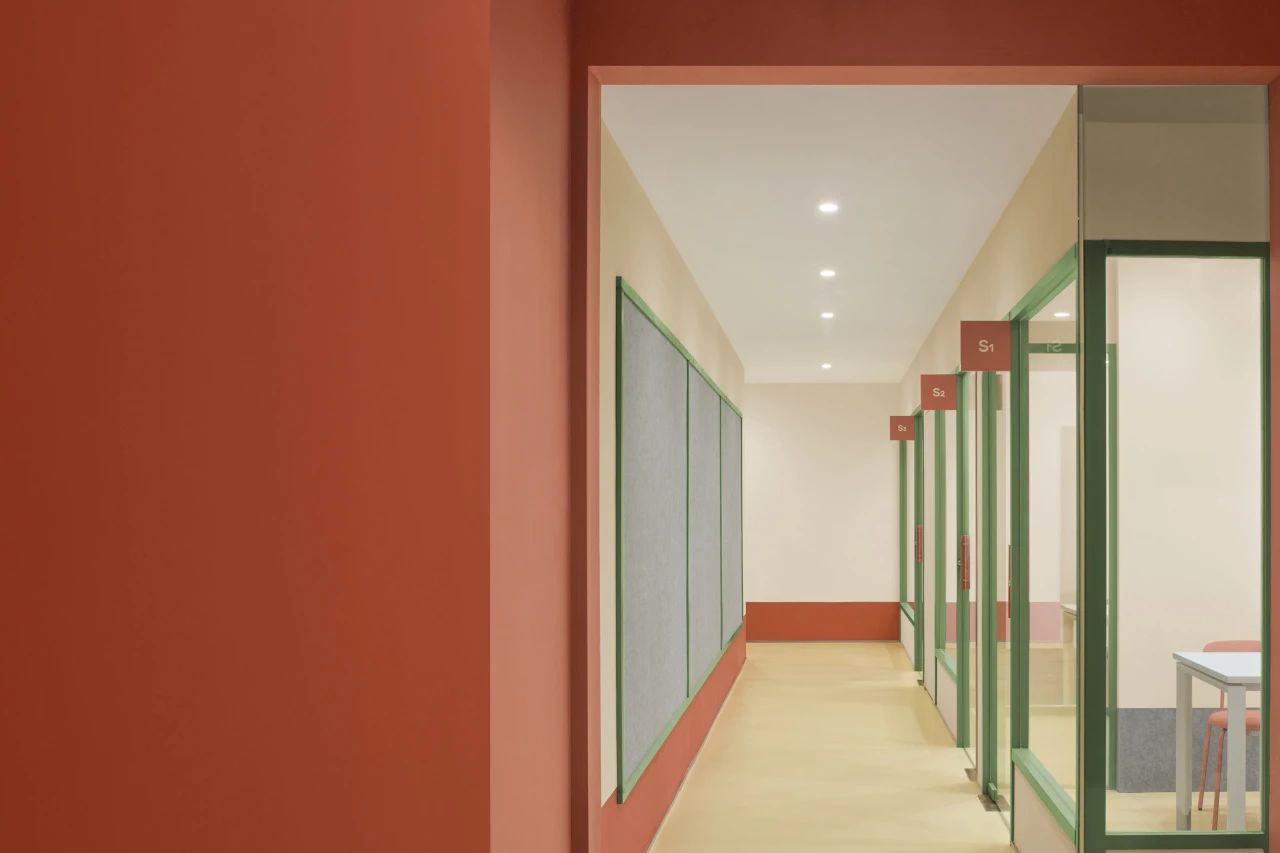 作为入口处的第一个多功能盒,这个区域也布局了封闭的小型会议空间与半开放的会谈空间,以满足不同状态下的办公需求。而多功能盒旁边则设有一个全开放的工作区,不仅可以适应多人的工作状态,还可作为讨论桌,为团队提供便利的协作空间。而另一个以创造为重点的“创作盒”则暗藏了一个全封闭的创作空间(拥有未知的入口,只有内部人员和设计师才能开启),在其外部则是配备了沙发卡座,为员工提供短暂交流或阅读的场所。同时这里也考虑到了公司的特殊员工——猫咪,我们在墙面采用灰色毛毡,并将书架和猫爬架相融合作为它们的活动区域。作为以创意作为核心的咖啡品牌,办公区域预留了充足的毛毡背板和白板,促进创作与讨论。这里也可以让员工自由发散灵感,满足兴趣爱好的追求。