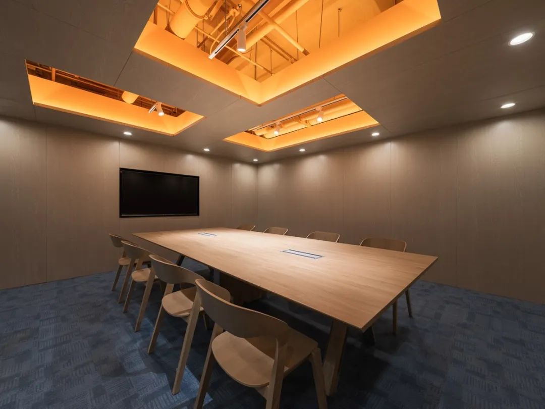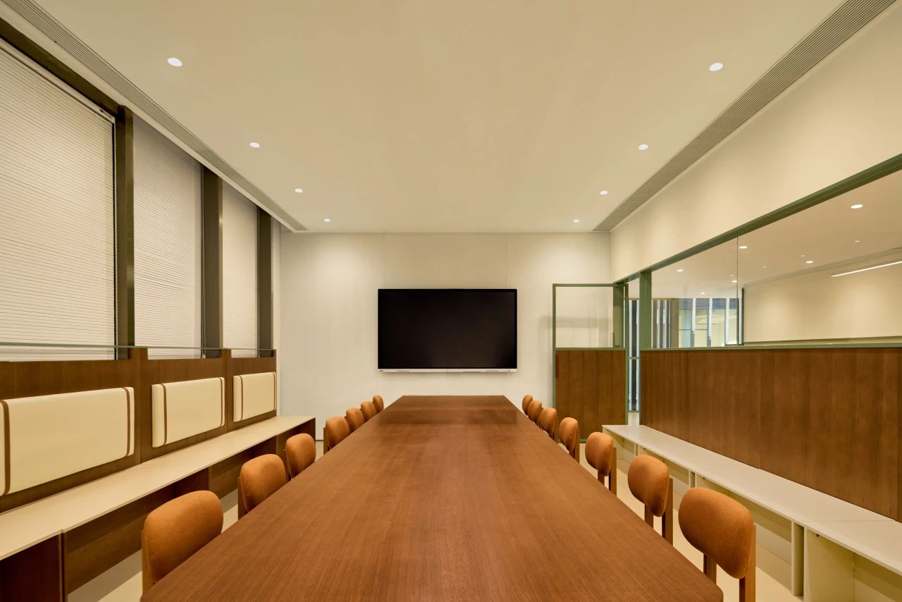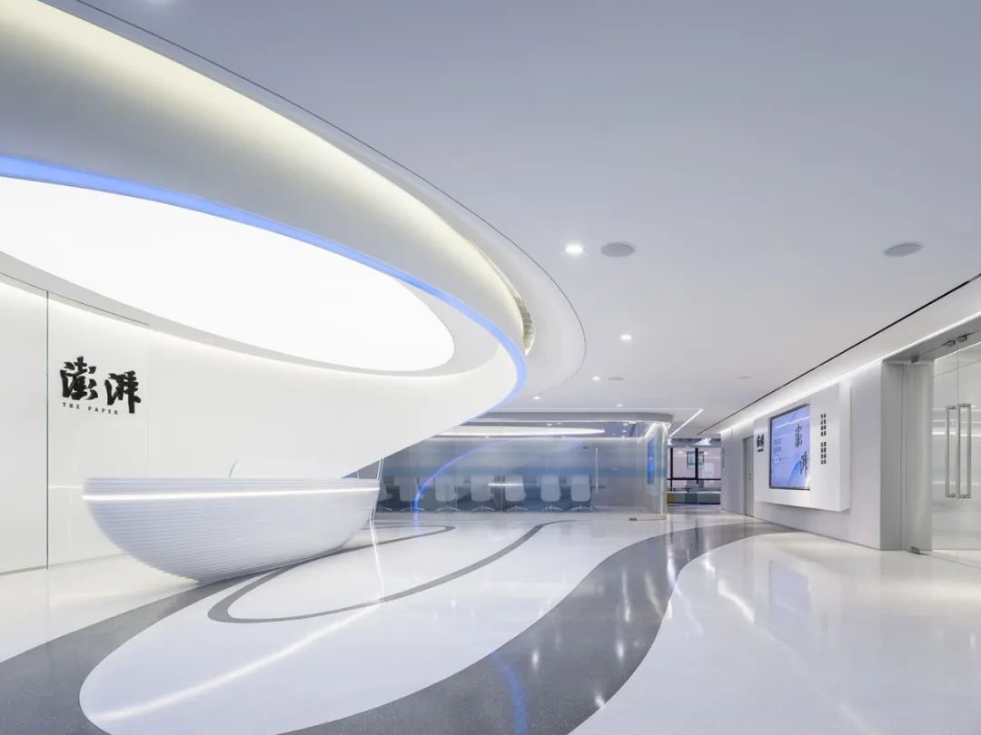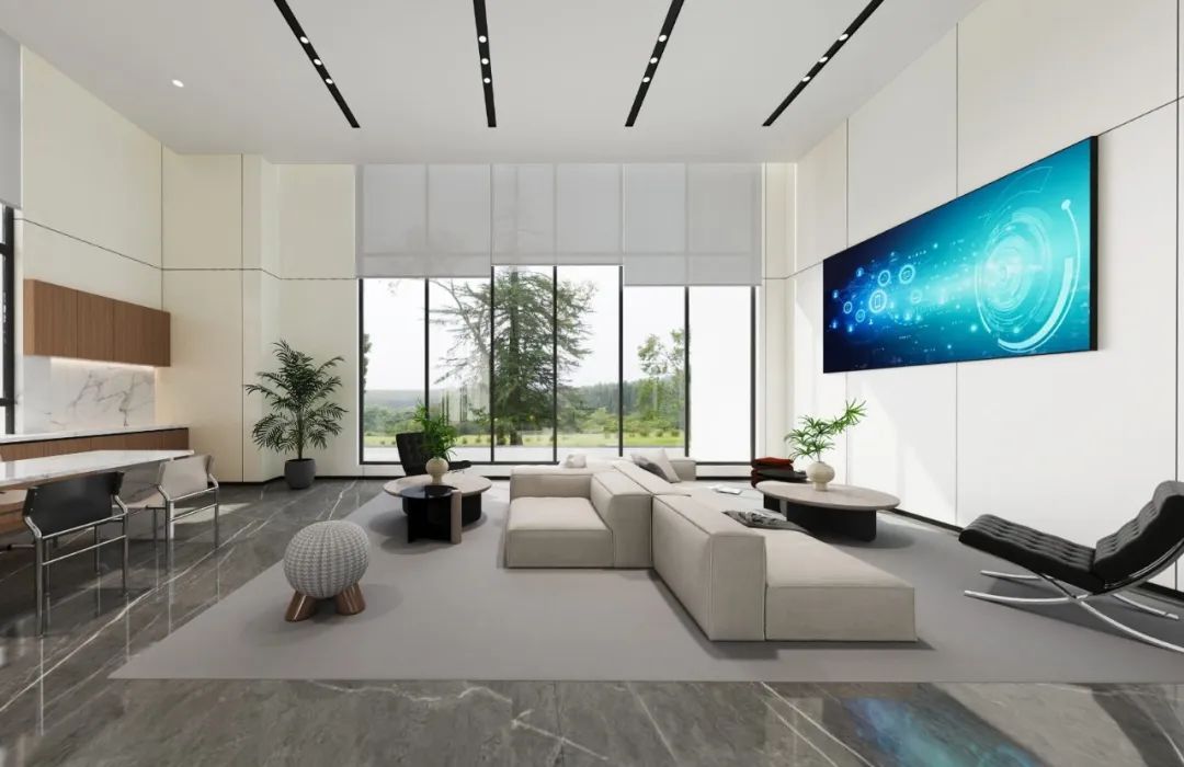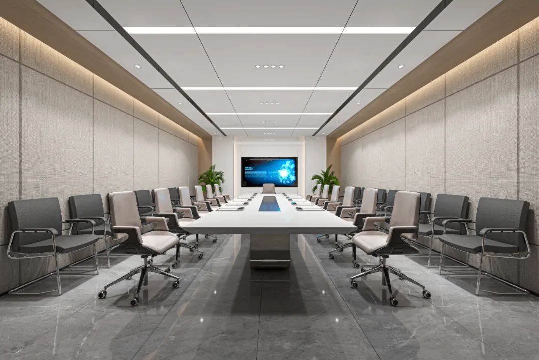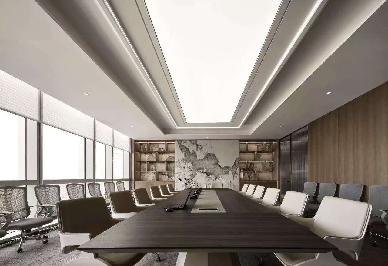 前厅设计采用经典的黑白灰为主色,使整个空间显得更加明亮和高档。白色天花和灰色地面的视觉对比增强了空间层次感,灰白墙面进一步呼应了顶面与地面的关系。黑色线性灯带在白色的天花板上形成鲜明的对比,让进入空间的用户惊觉宏伟大气。企业品牌标志位于前台上方的墙面上并正对着主入口,耀眼伫立,先声夺人。会议室宽敞明亮,原木色的墙面、白色的顶与与灰色的地面,层层递进,增强视觉层次感,灰白相间的办公家具提升了空间品位,暗装灯带使空间面板立体突出,吊顶的多重灯光体现了空间的现代科技。整体接待等个区采用了开放式设计,没有明显的隔断,宽敞的空间和合理的布局确保了接待区的功能性,方便来访者和工作人员的互动。大面积的玻璃窗引入了大量自然光,使空间更加明亮和开阔。定制的家具软装置于其中,为来访者打造一个轻松闲适、茶香憩意的空间。