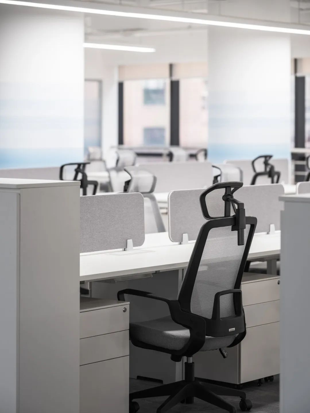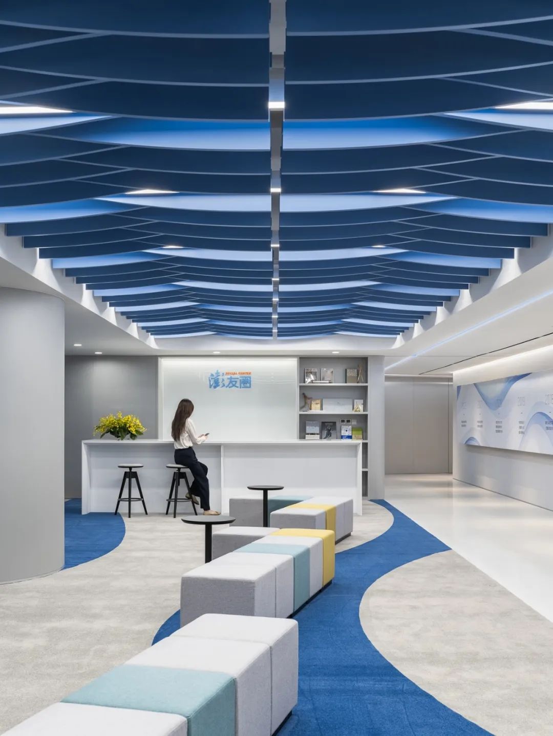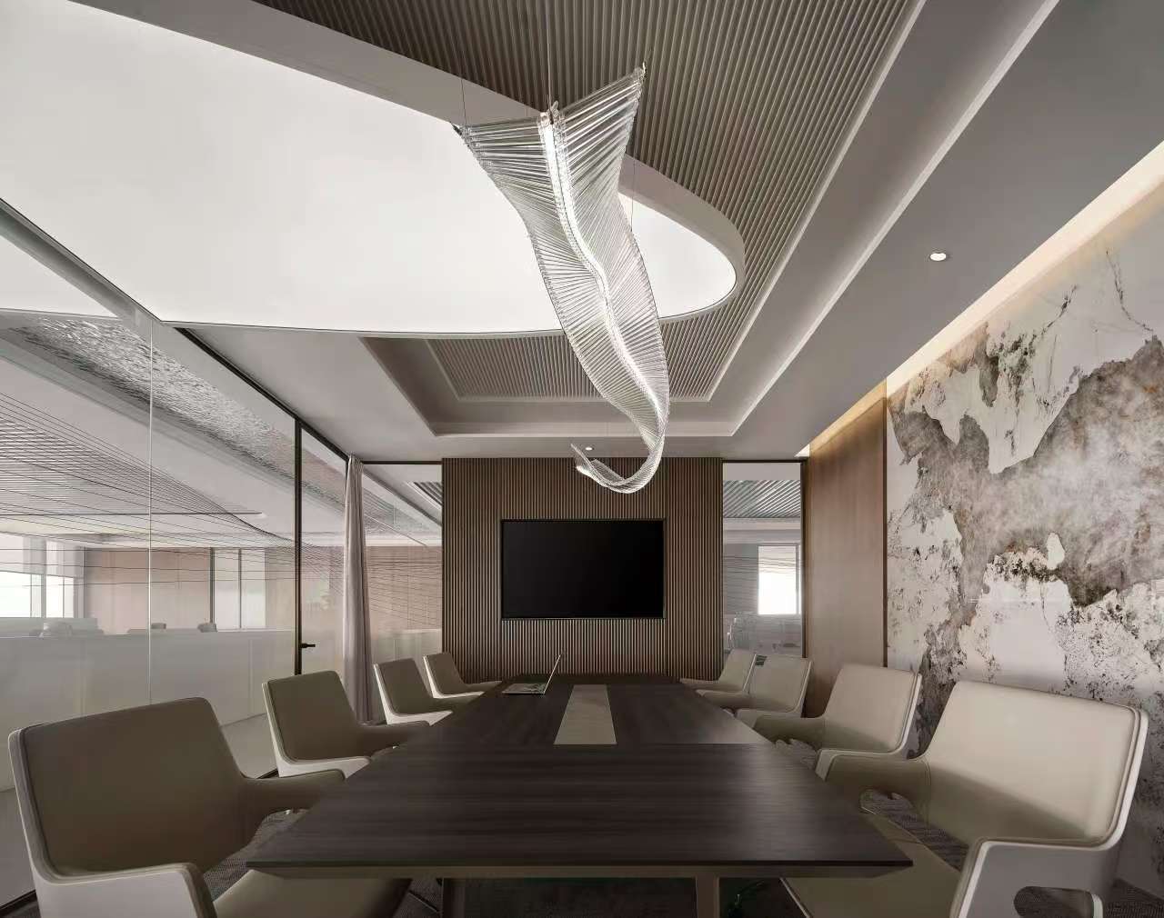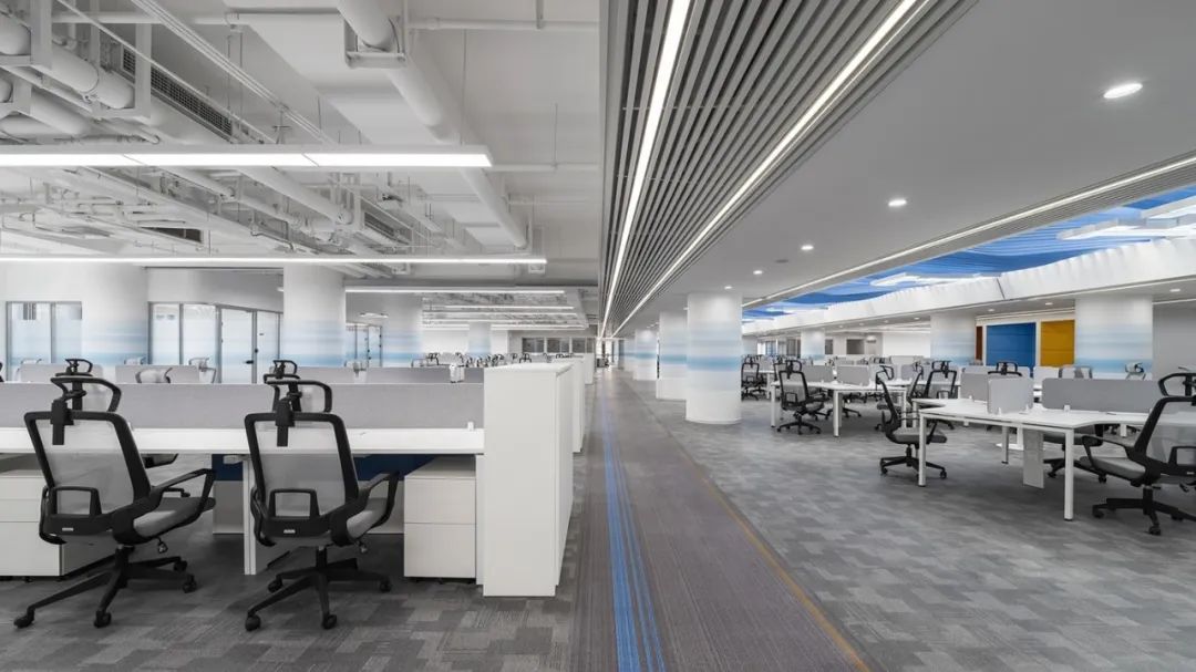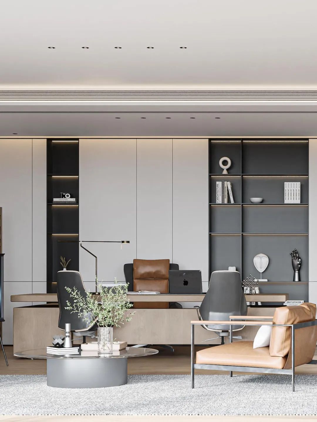 前厅设计采用经典的黑白灰为主色,使整个空间显得更加明亮和高档。白色天花和灰色地面的视觉对比增强了空间层次感,灰白墙面进一步呼应了顶面与地面的关系。黑色线性灯带在白色的天花板上形成鲜明的对比,让进入空间的用户惊觉宏伟大气。企业品牌标志位于前台上方的墙面上并正对着主入口,耀眼伫立,先声夺人。会议室宽敞明亮,原木色的墙面、白色的顶与与灰色的地面,层层递进,增强视觉层次感,灰白相间的办公家具提升了空间品位,暗装灯带使空间面板立体突出,吊顶的多重灯光体现了空间的现代科技。整体接待等个区采用了开放式设计,没有明显的隔断,宽敞的空间和合理的布局确保了接待区的功能性,方便来访者和工作人员的互动。大面积的玻璃窗引入了大量自然光,使空间更加明亮和开阔。定制的家具软装置于其中,为来访者打造一个轻松闲适、茶香憩意的空间。