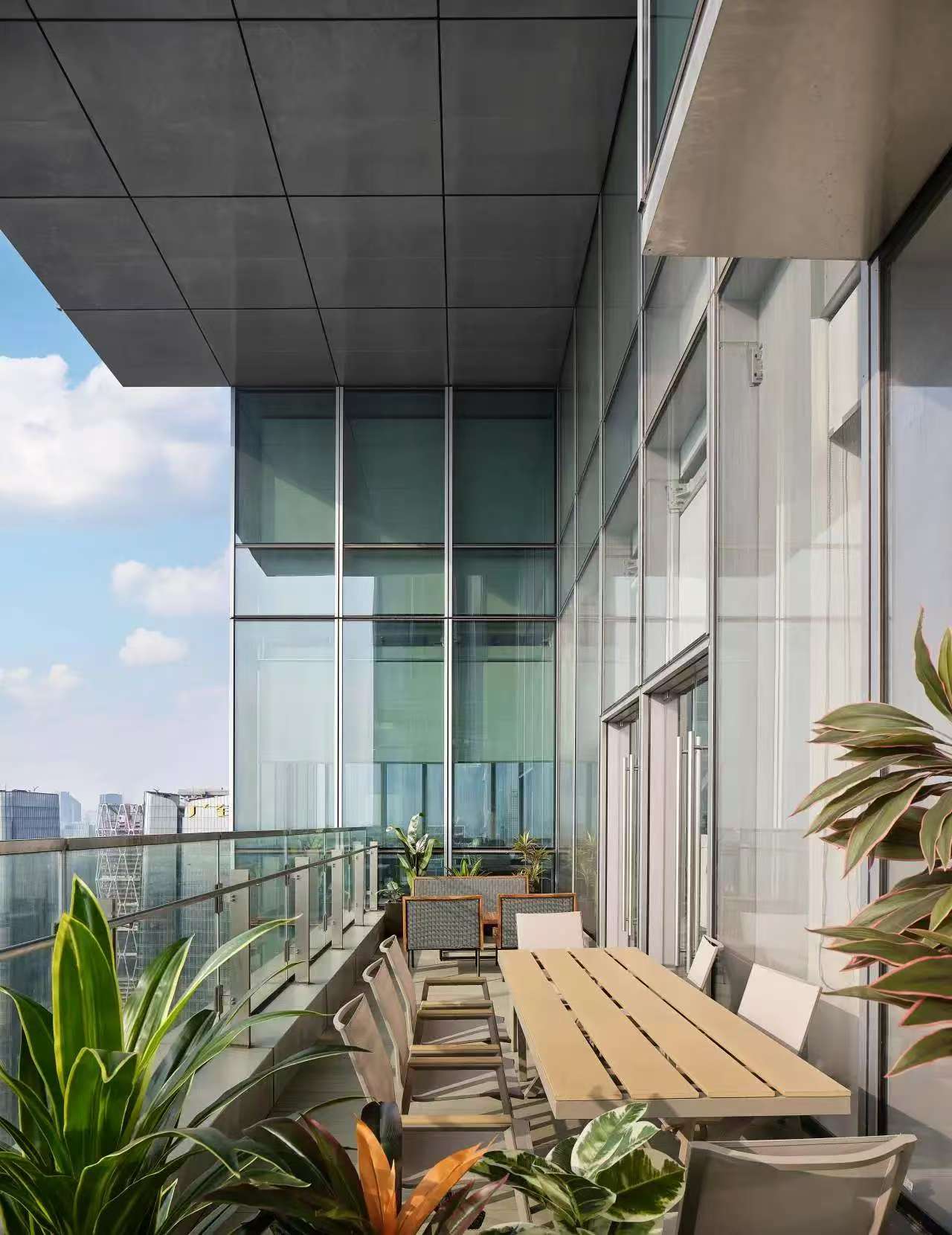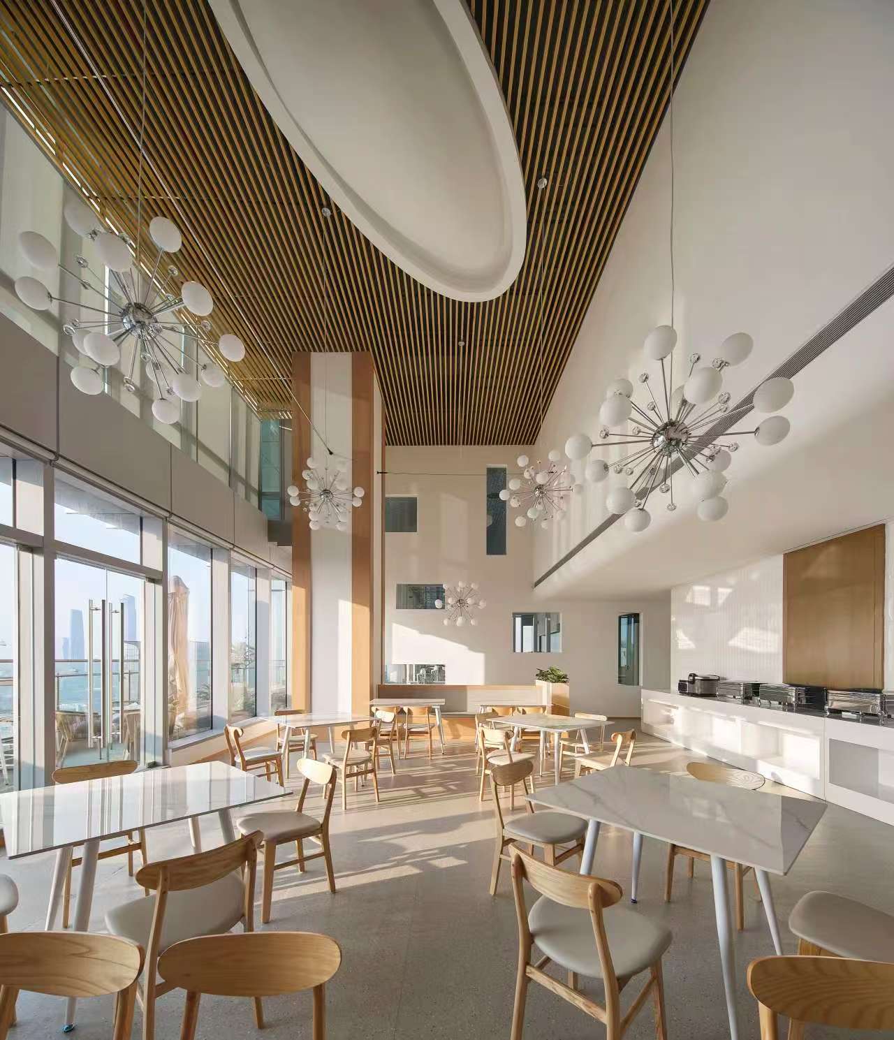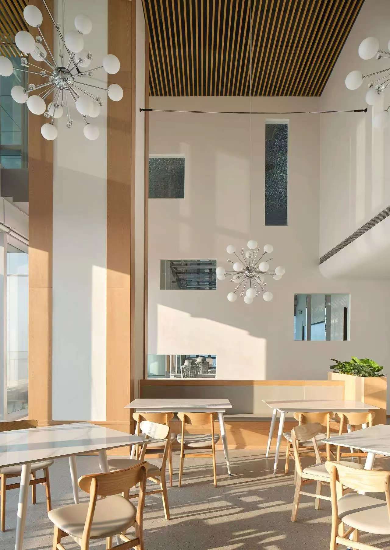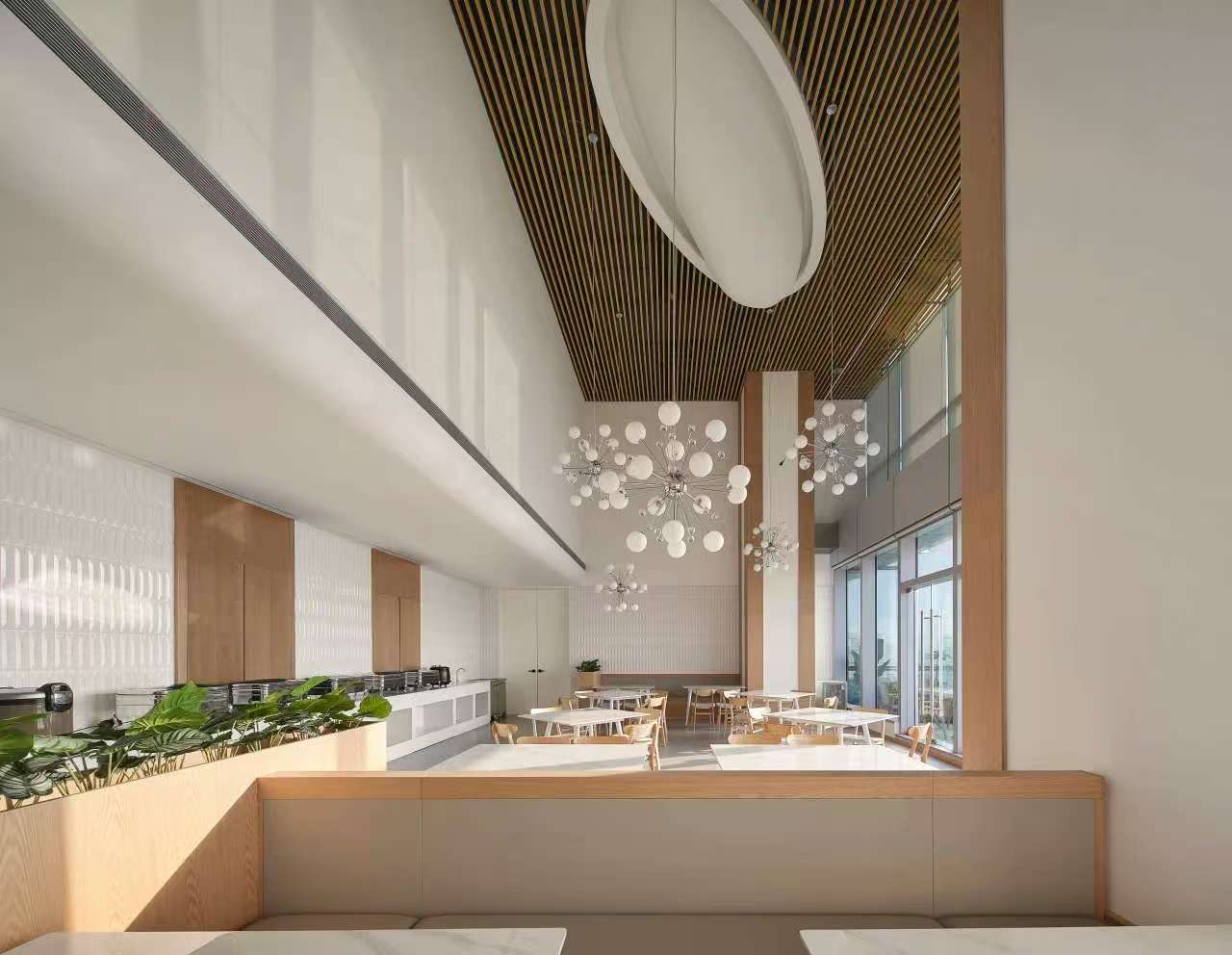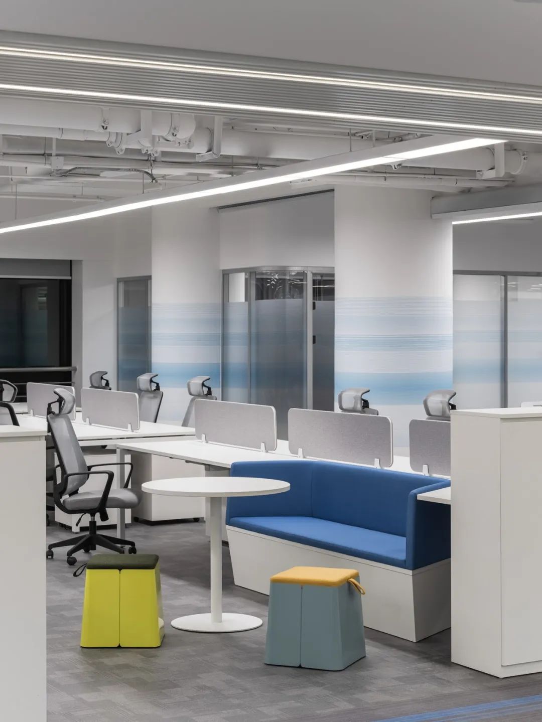 前厅设计采用经典的黑白灰为主色,使整个空间显得更加明亮和高档。白色天花和灰色地面的视觉对比增强了空间层次感,灰白墙面进一步呼应了顶面与地面的关系。黑色线性灯带在白色的天花板上形成鲜明的对比,让进入空间的用户惊觉宏伟大气。企业品牌标志位于前台上方的墙面上并正对着主入口,耀眼伫立,先声夺人。会议室宽敞明亮,原木色的墙面、白色的顶与与灰色的地面,层层递进,增强视觉层次感,灰白相间的办公家具提升了空间品位,暗装灯带使空间面板立体突出,吊顶的多重灯光体现了空间的现代科技。整体接待等个区采用了开放式设计,没有明显的隔断,宽敞的空间和合理的布局确保了接待区的功能性,方便来访者和工作人员的互动。大面积的玻璃窗引入了大量自然光,使空间更加明亮和开阔。定制的家具软装置于其中,为来访者打造一个轻松闲适、茶香憩意的空间。