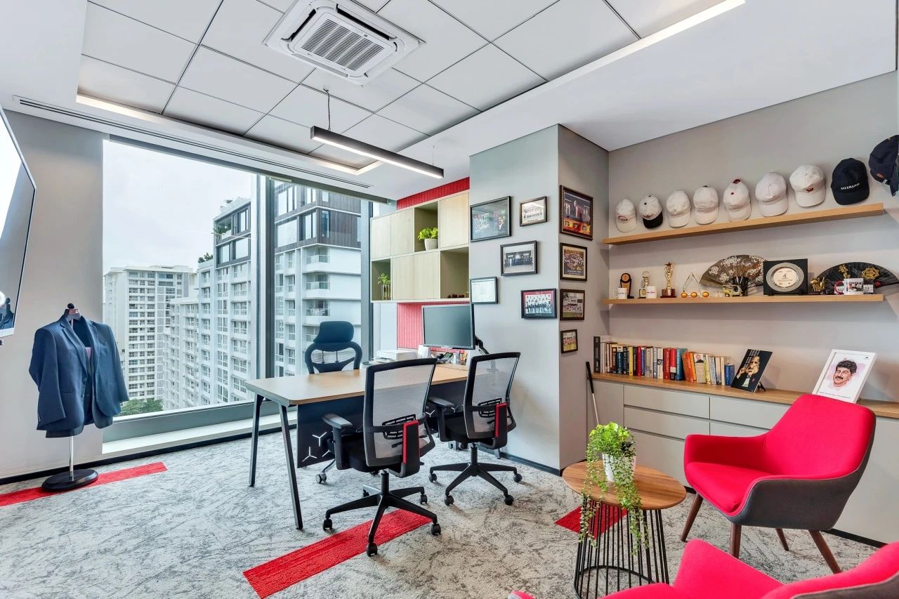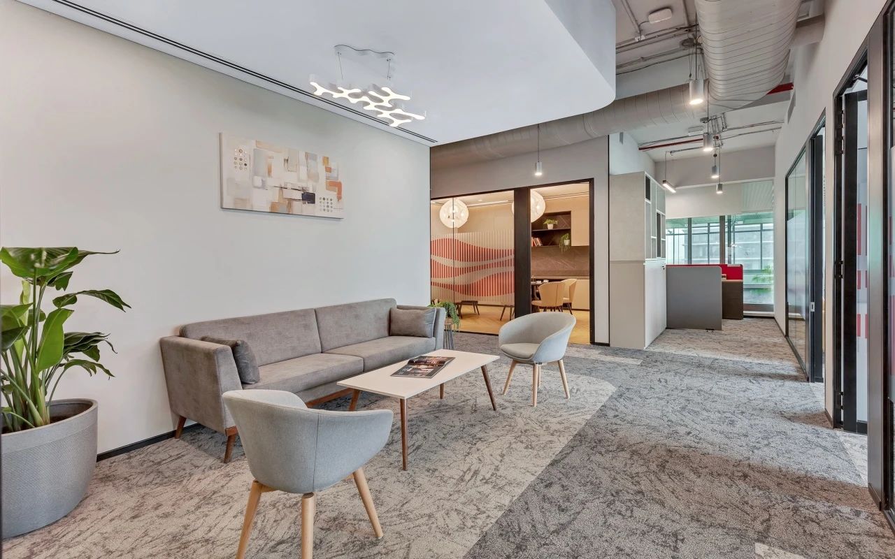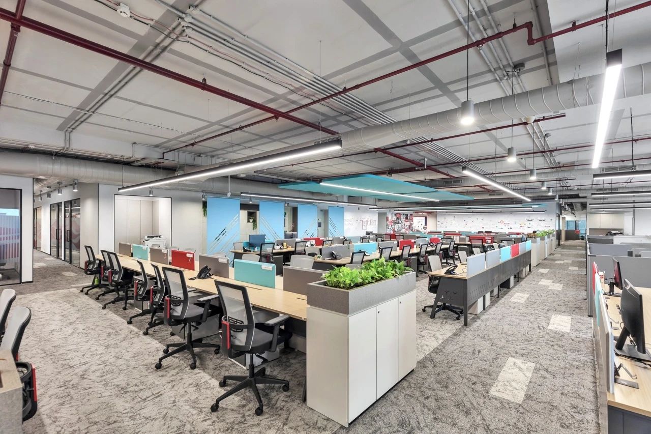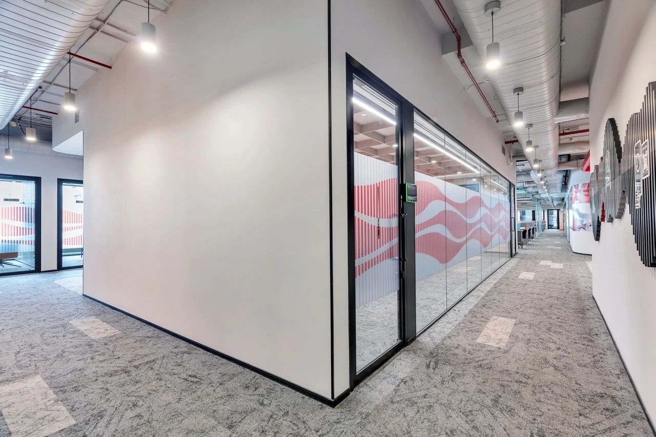 办公室空间的设计更加活泼,地面在灰色调的基础上点缀以企业色红色,让整体空间更加灵动,激发员工的创造力和工作热情。