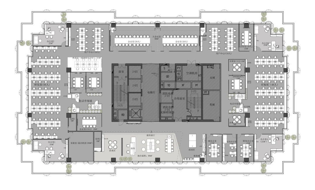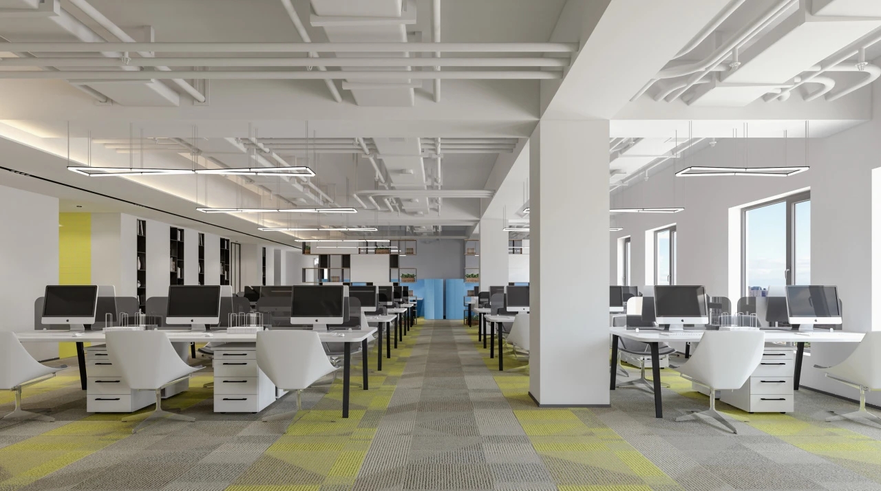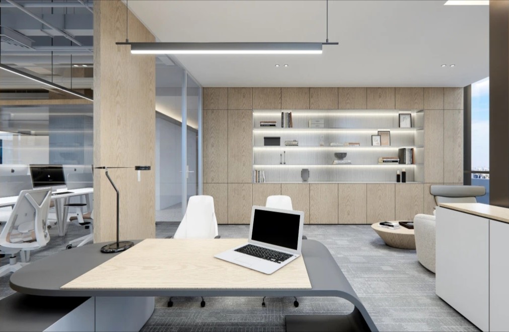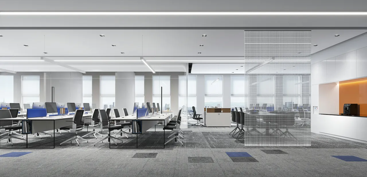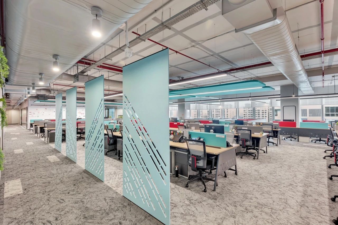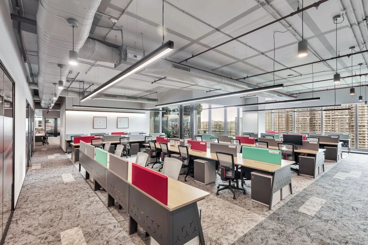 办公室空间的设计更加活泼,地面在灰色调的基础上点缀以企业色红色,让整体空间更加灵动,激发员工的创造力和工作热情。