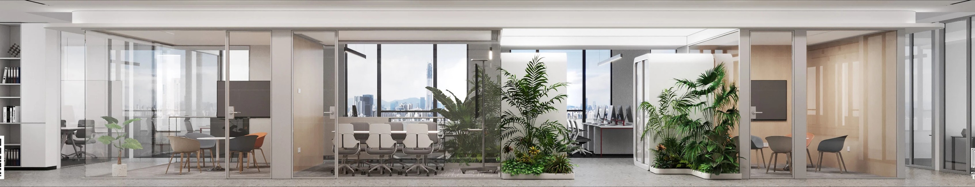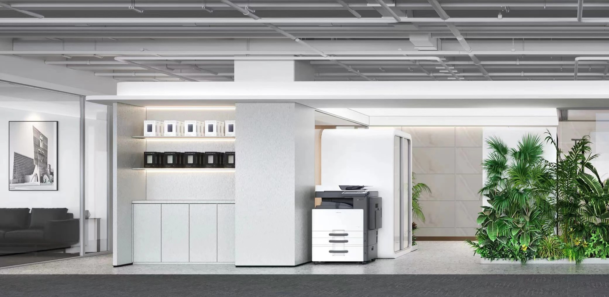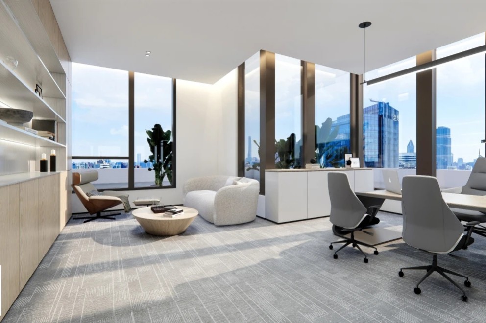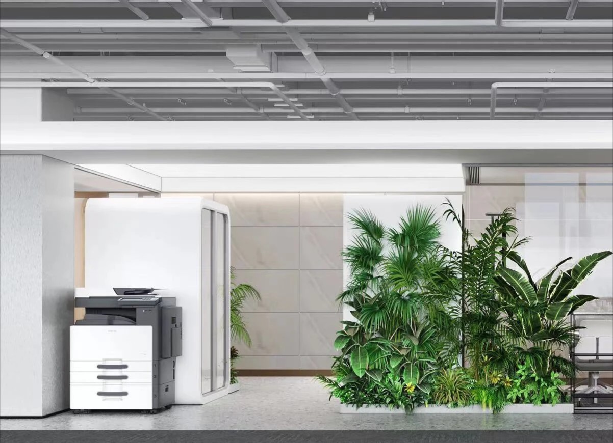 干净细腻的灰白颜色肌理、木质和绿植相互交合,结合空间现代风格的理性将自然的本真投射其中。转角聚合处,加入地台设计,融入落地窗照射进来的光影艺术,变化万千,灵动莫测,以一种“空旷贯通”的姿态容纳无限可能的未来。休闲区用最简单的方式抒写空间的形态自有与动线节奏,同时满足办公环境下轻松舒适的沟通需求,打造兼具“场景性、现代化”的新型未来办公休闲娱乐空间,在办公中营构自然,增添一份舒适感。