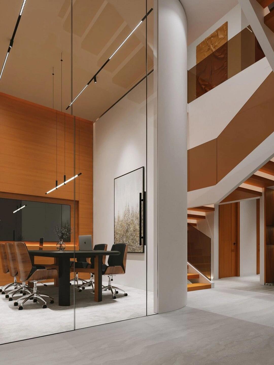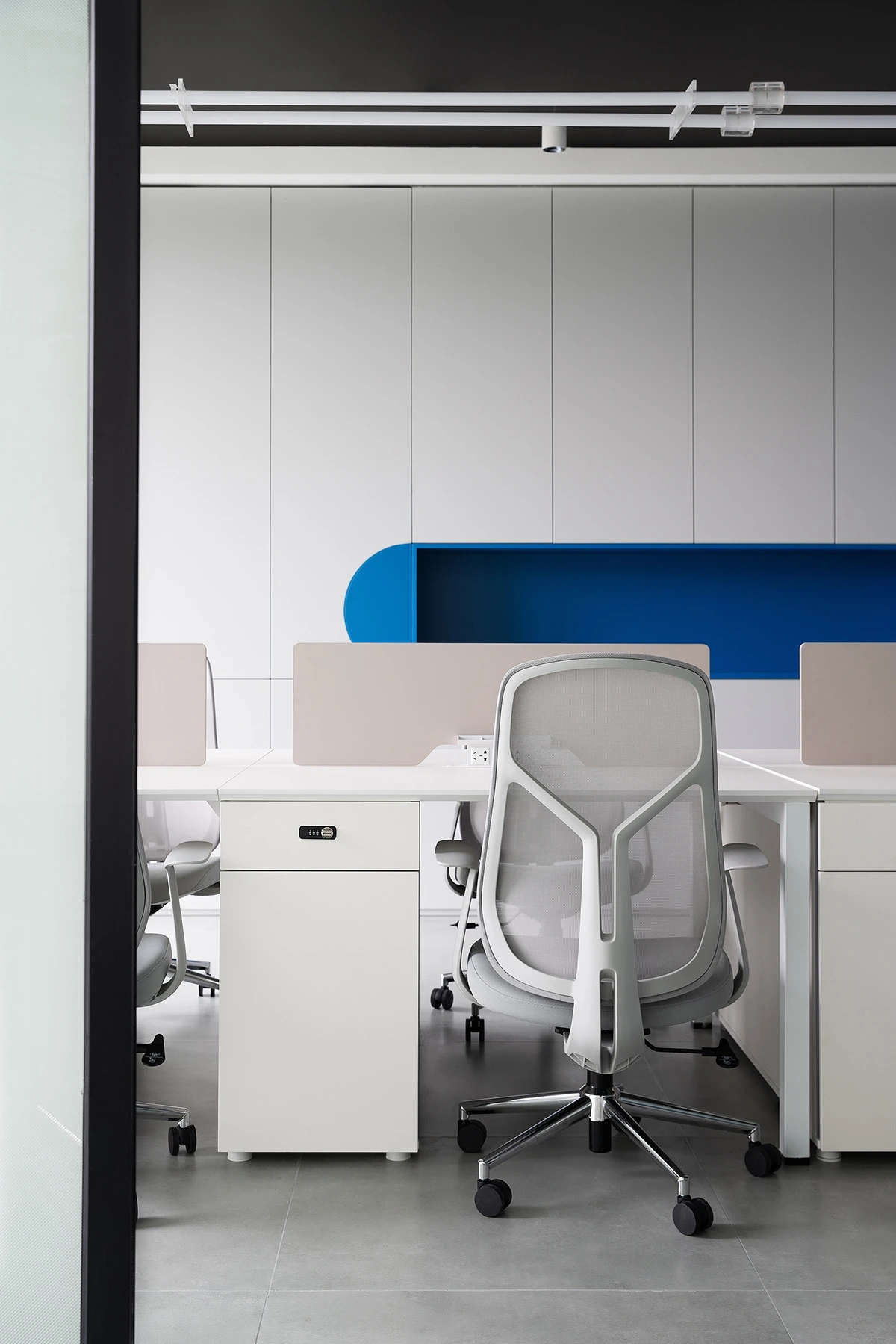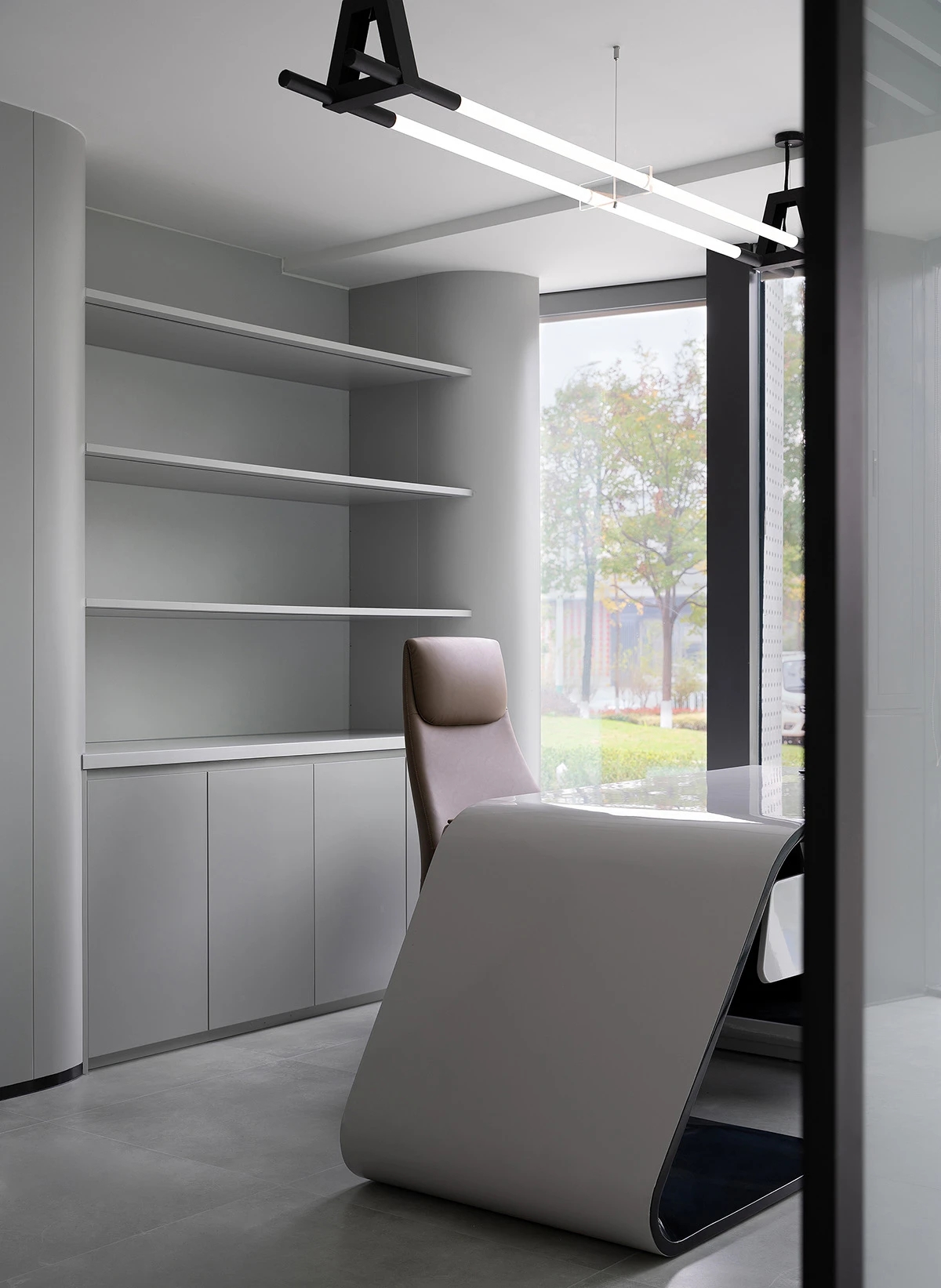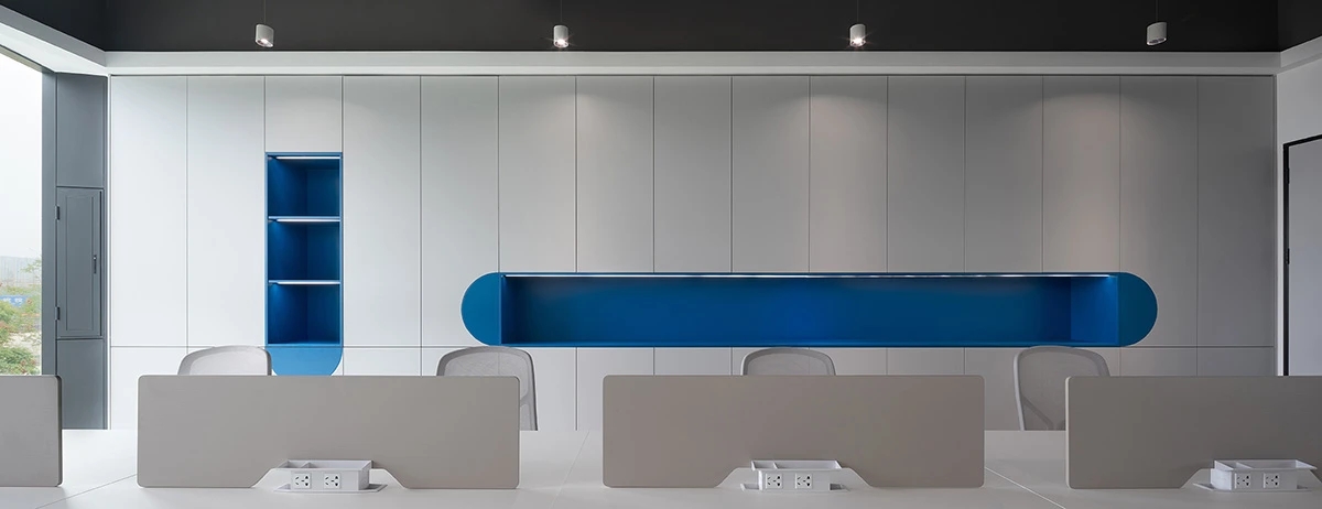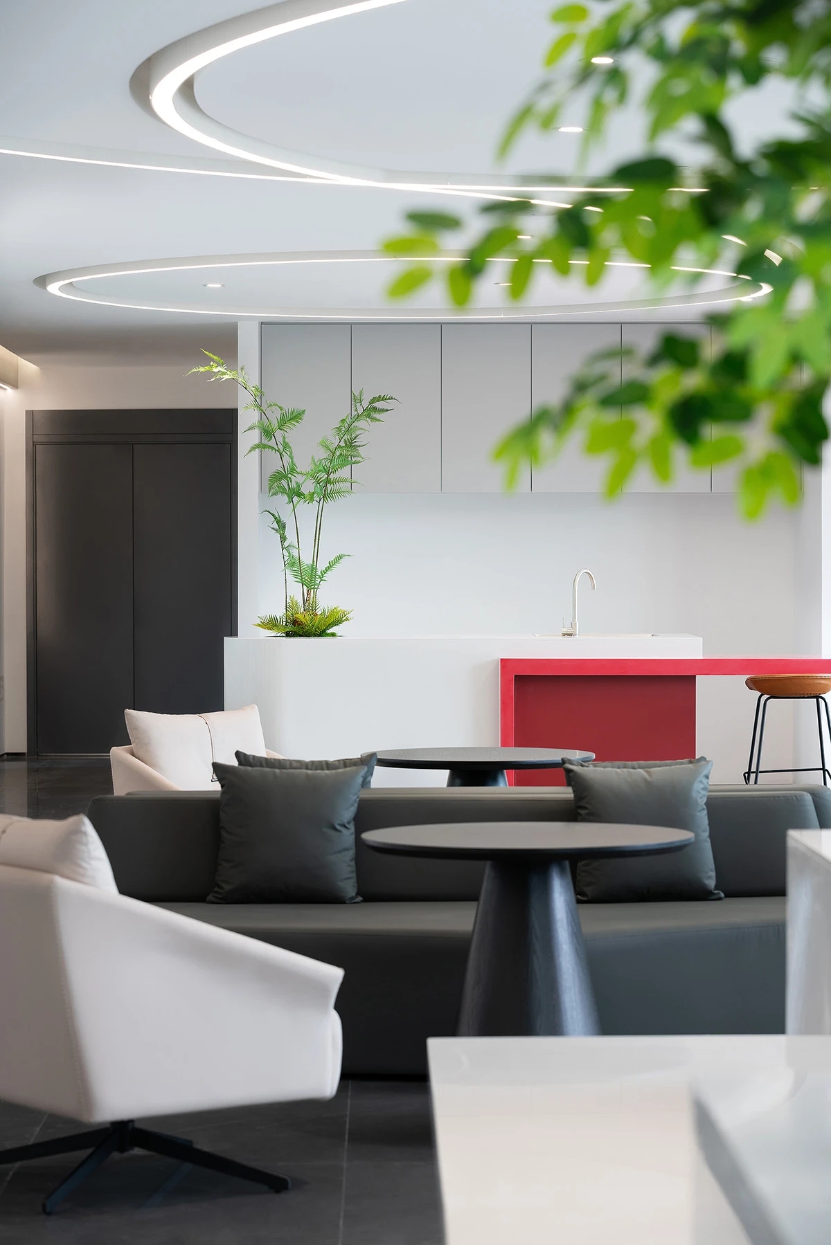 办公区的设计融合了现代办公理念和人性化元素。通过纯净、高效的线条和大面积留白来构造清晰的空间层次。红、蓝颜色的跳跃,将空间的纵深强调极致,使看似没有界定的空间中,蕴含着多元与活力。培训室以“科技、未来感”为核心理念,挖掘和探索空间的可能性,开启未来办公空间新模式。简洁的线条和流畅的弧度,让整个空间看起来既宽敞又舒适。作为专家级独立办公室,深灰的沉稳、白色的纯净、黑色的高级相互融合,营造出独特的沉稳感。沐浴在时间光泽下,超越简洁安静中的质朴之美,更为璞真深邃。