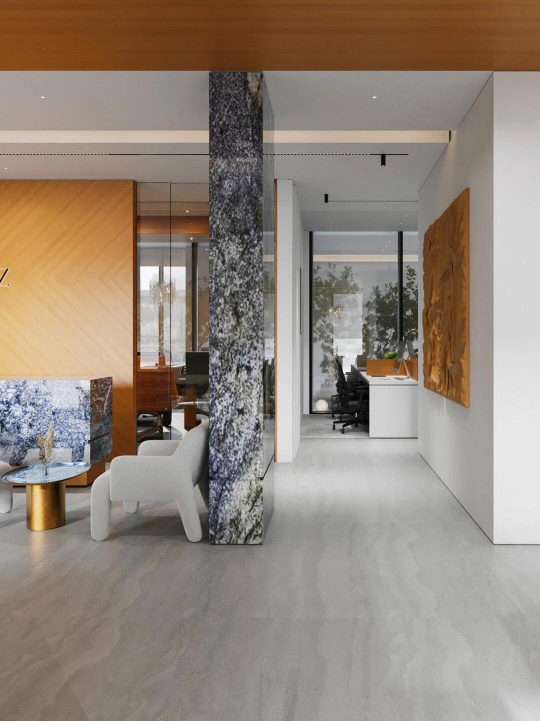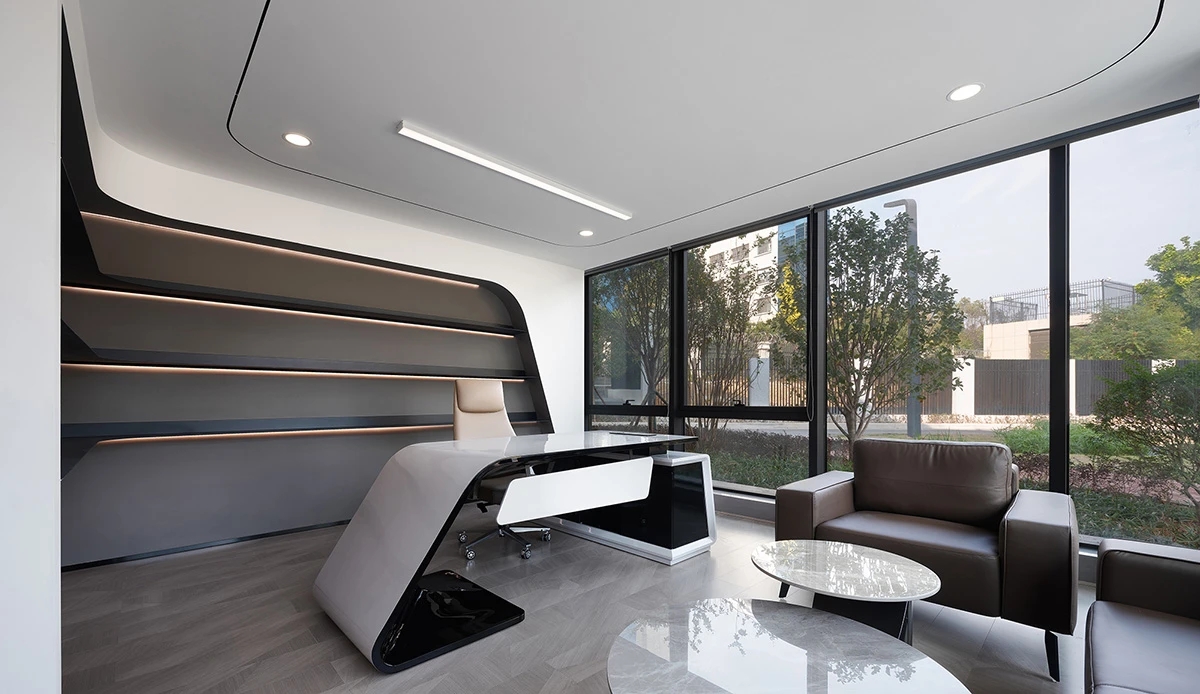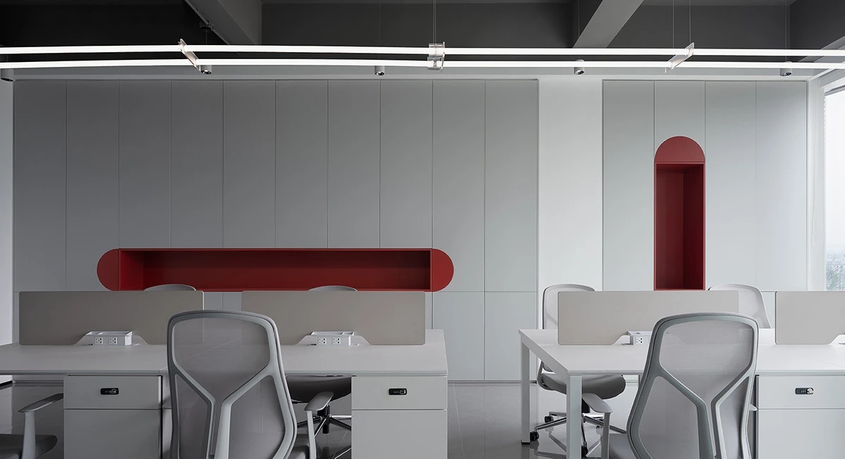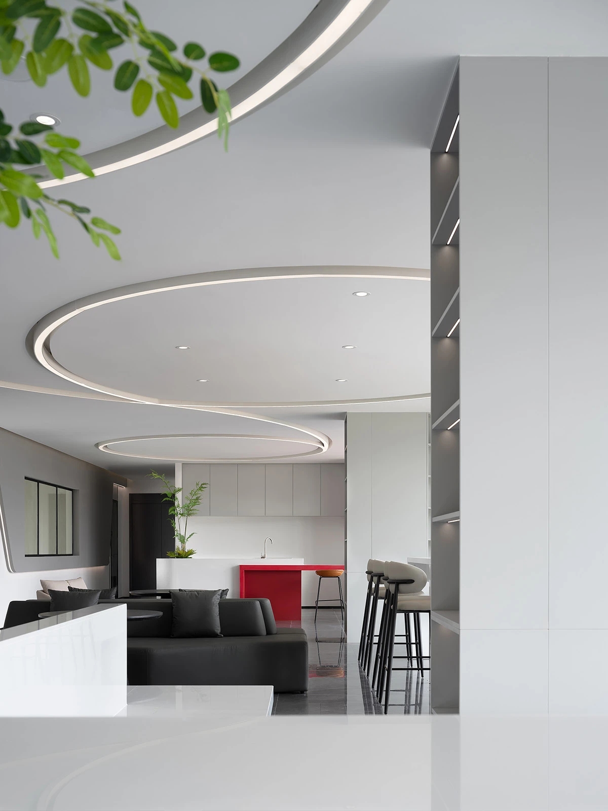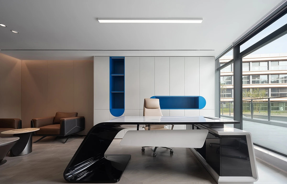 办公区的设计融合了现代办公理念和人性化元素。通过纯净、高效的线条和大面积留白来构造清晰的空间层次。红、蓝颜色的跳跃,将空间的纵深强调极致,使看似没有界定的空间中,蕴含着多元与活力。培训室以“科技、未来感”为核心理念,挖掘和探索空间的可能性,开启未来办公空间新模式。简洁的线条和流畅的弧度,让整个空间看起来既宽敞又舒适。作为专家级独立办公室,深灰的沉稳、白色的纯净、黑色的高级相互融合,营造出独特的沉稳感。沐浴在时间光泽下,超越简洁安静中的质朴之美,更为璞真深邃。
