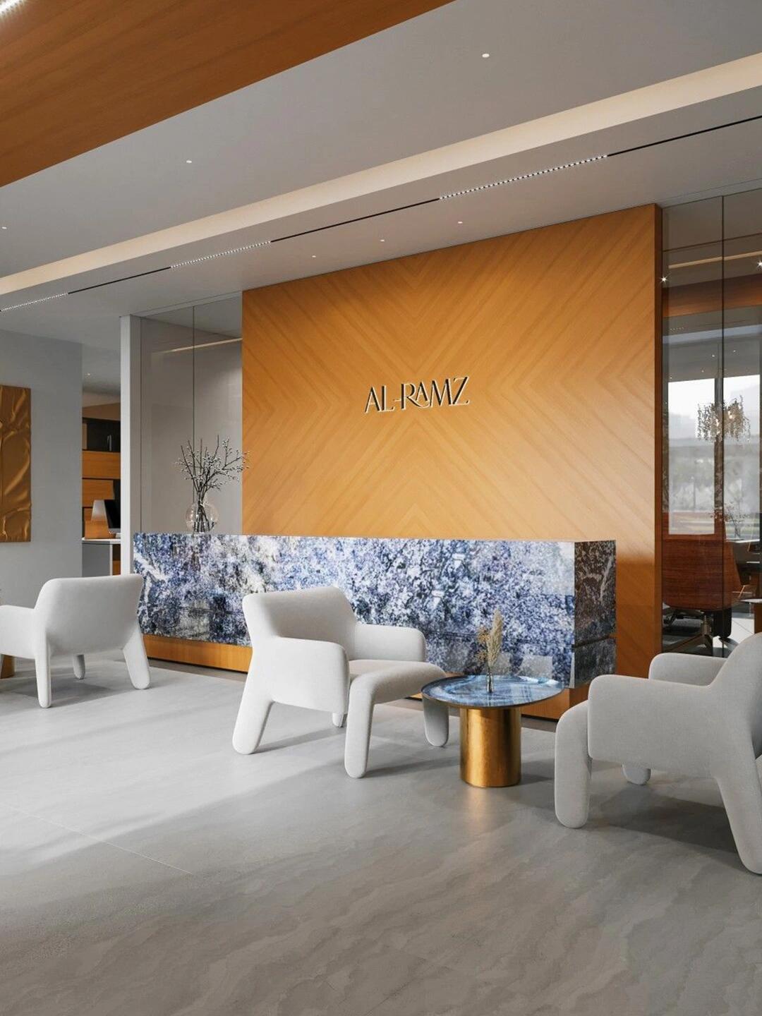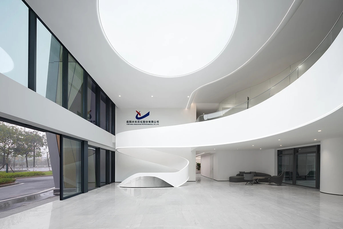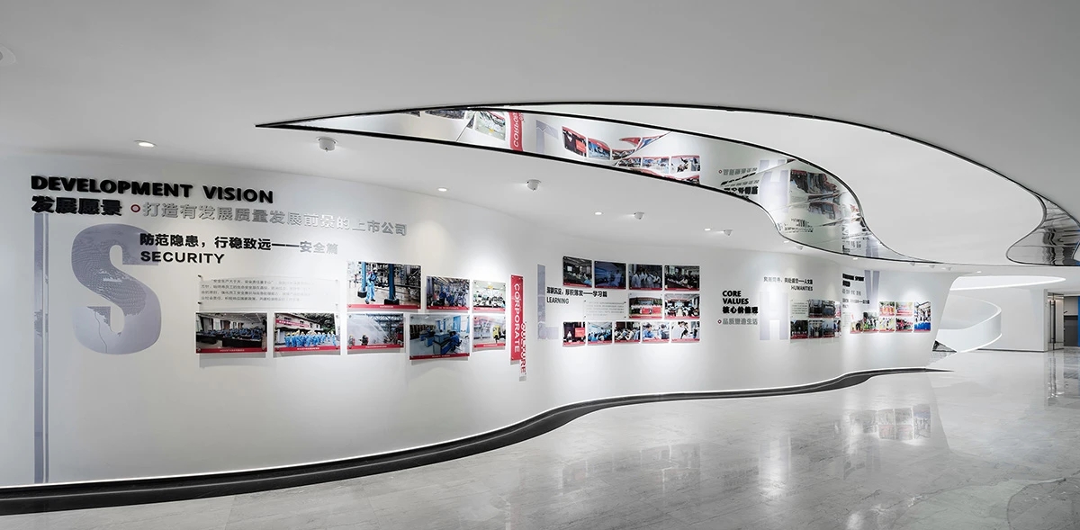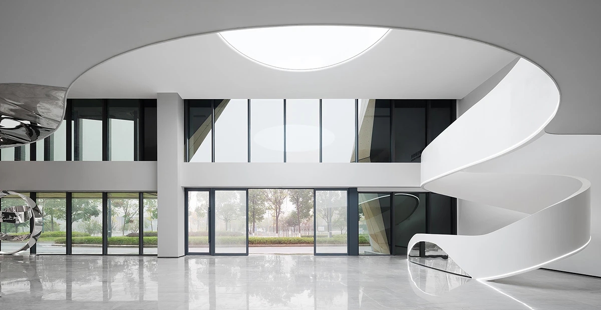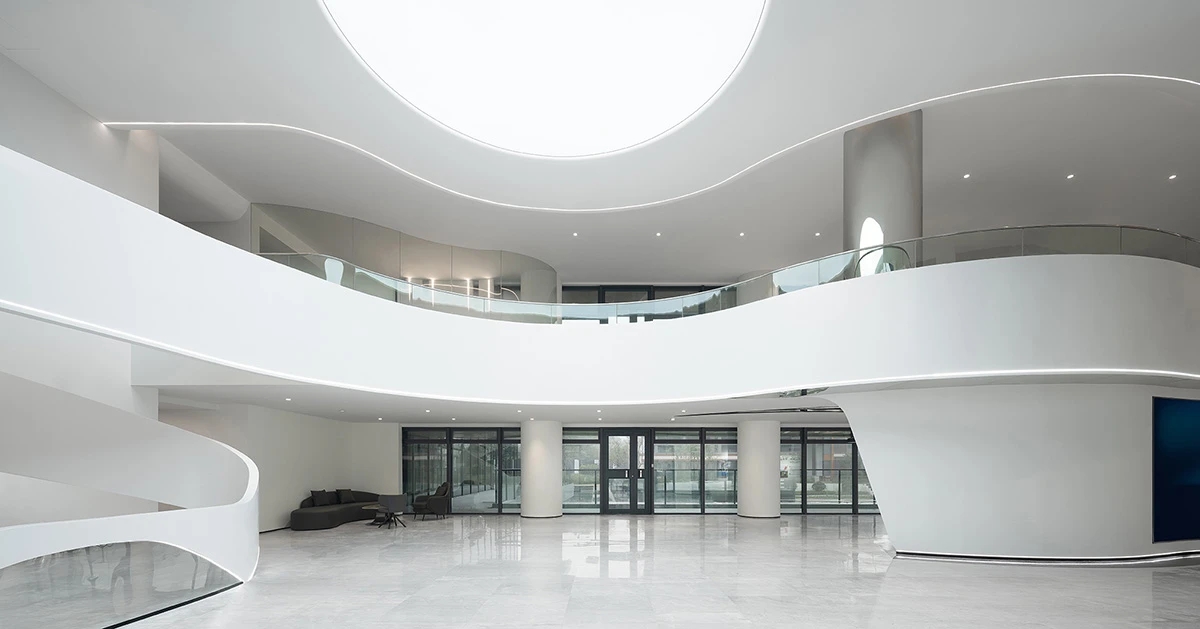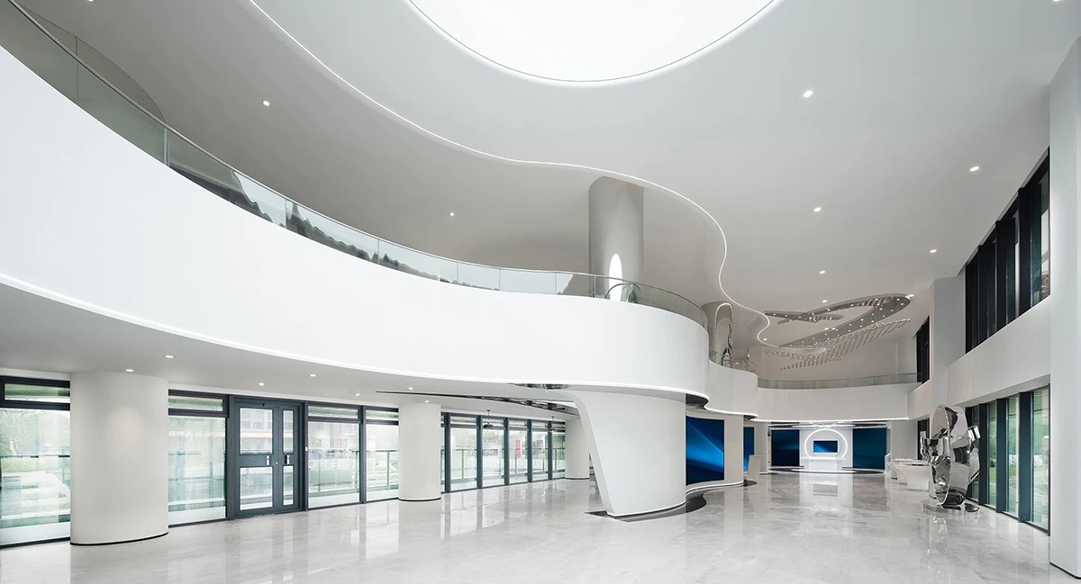 空间以水波纹为原型,将“水之动,水之静、水之樂水之形”融入室内空间,以飘带的形式呈现,融入在整个空间中,勾勒出接待大堂大气朗阔和俊逸之美。象征博大的流动曲线,从接待处开始延伸出地面,呈卷轴形态,如同拥有生命力般从空间中生长出来穿插于空间中,为观者提供了一种缓慢流淌的体验方式,孕育无限创新的兴长。