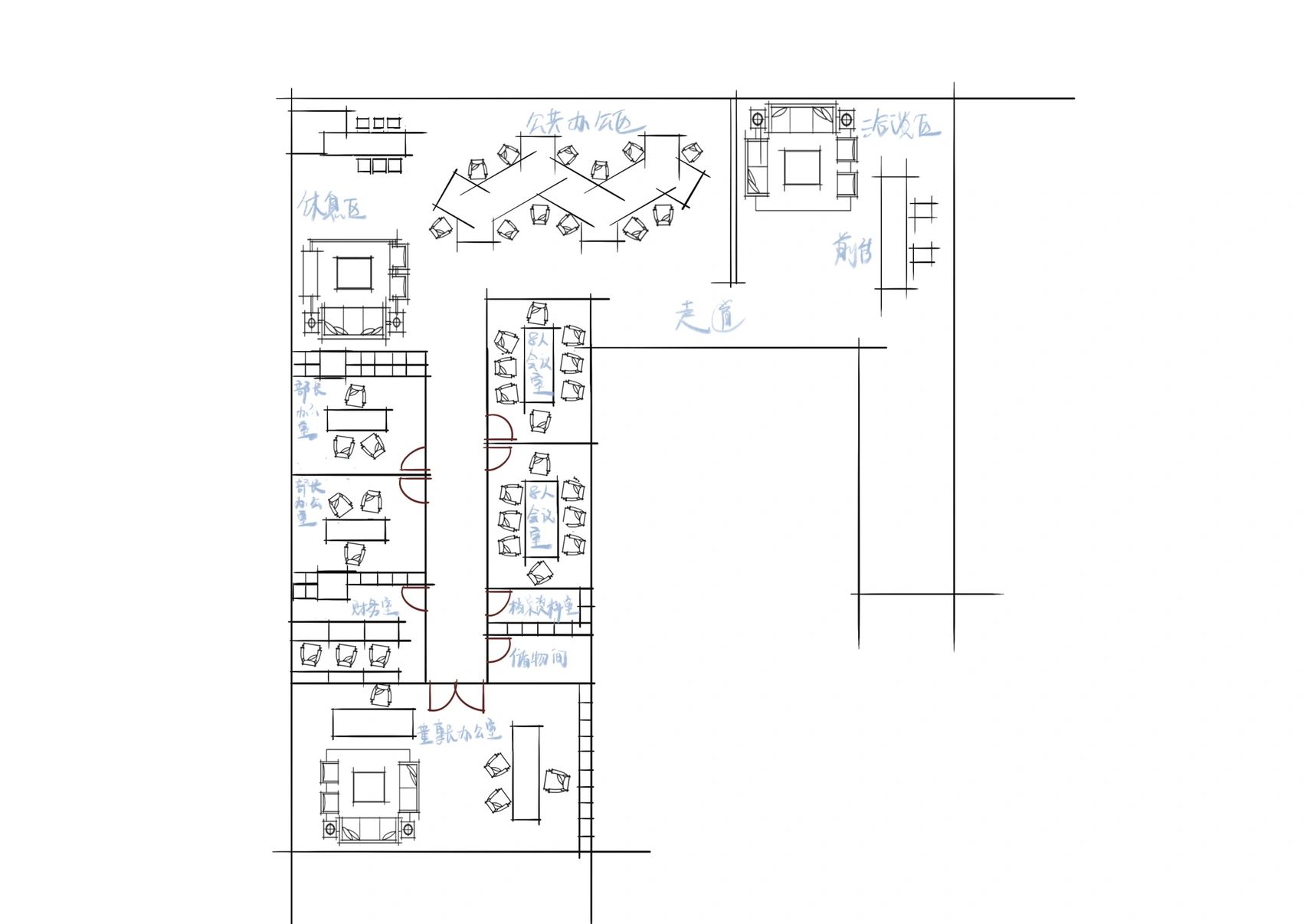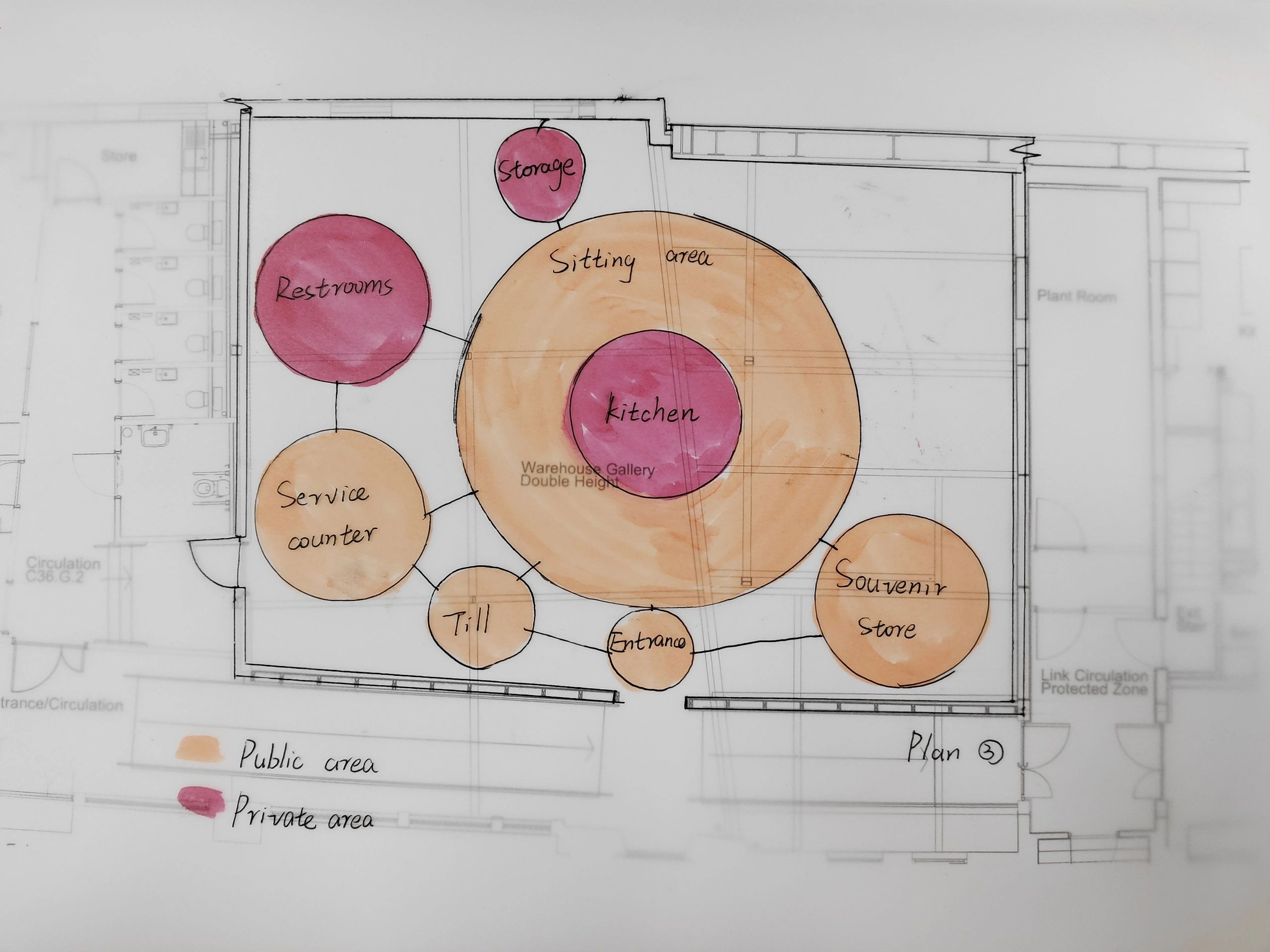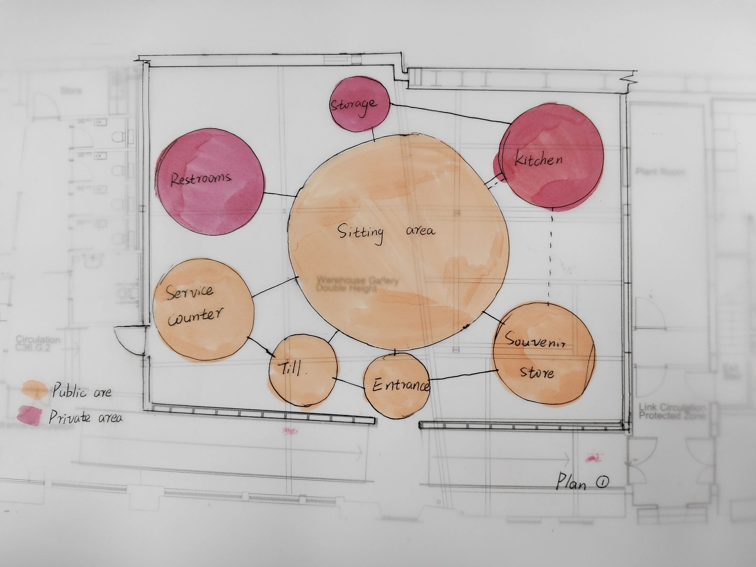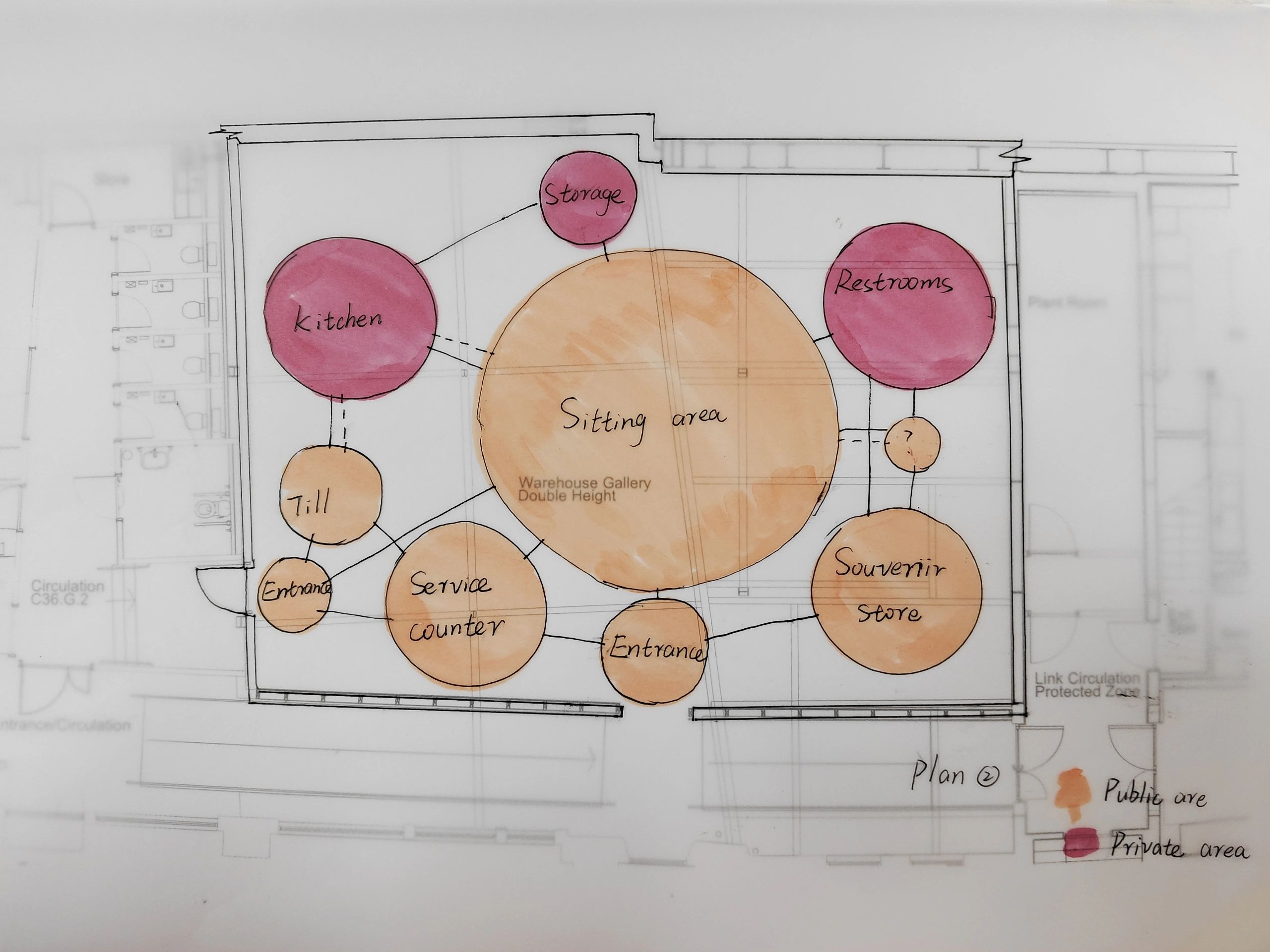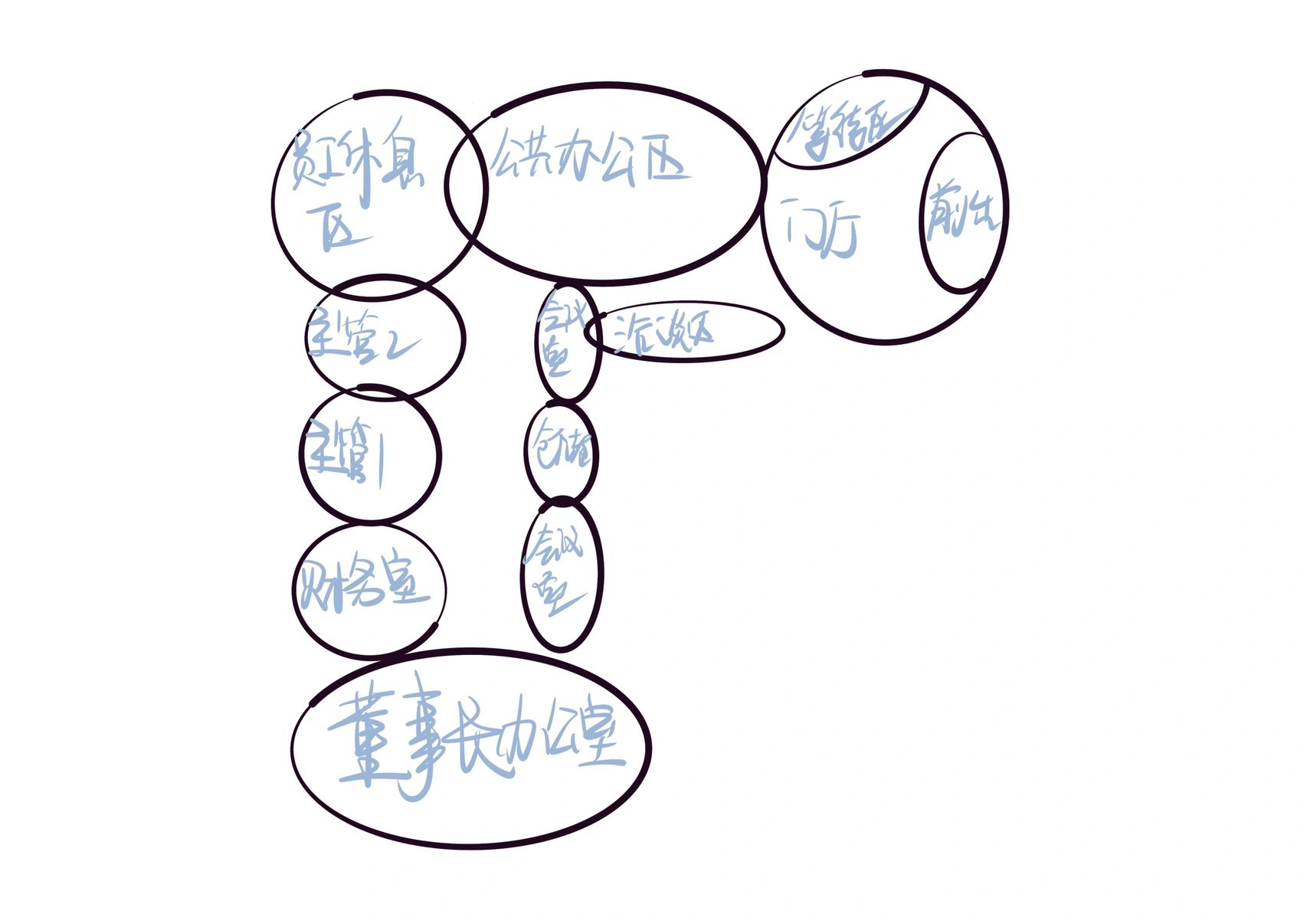 首先,先在整体大空间中画出两个大的泡泡,先区分出最大的两个功能区,再从大的泡泡里分出小的泡泡,更细化每个分区。