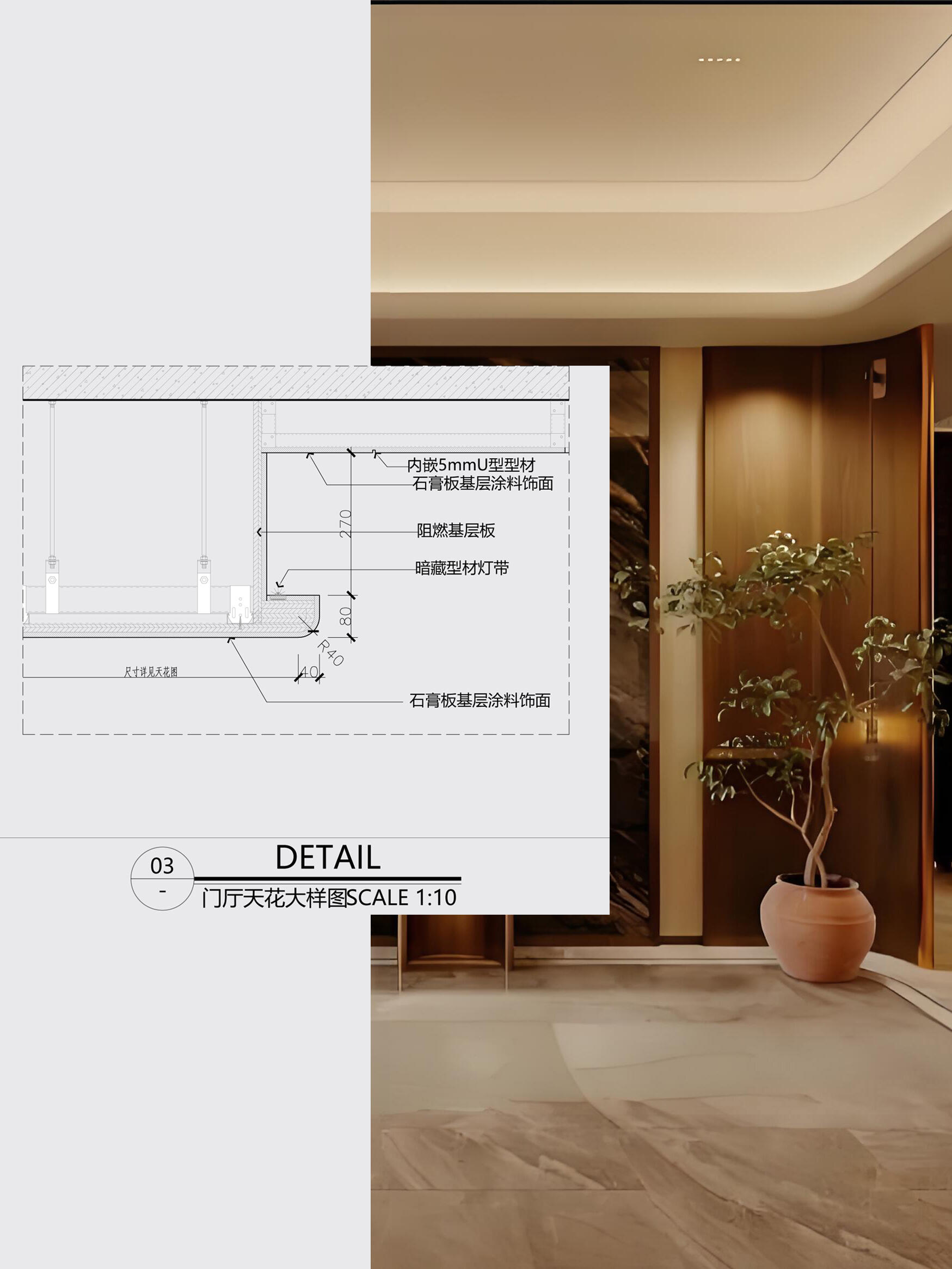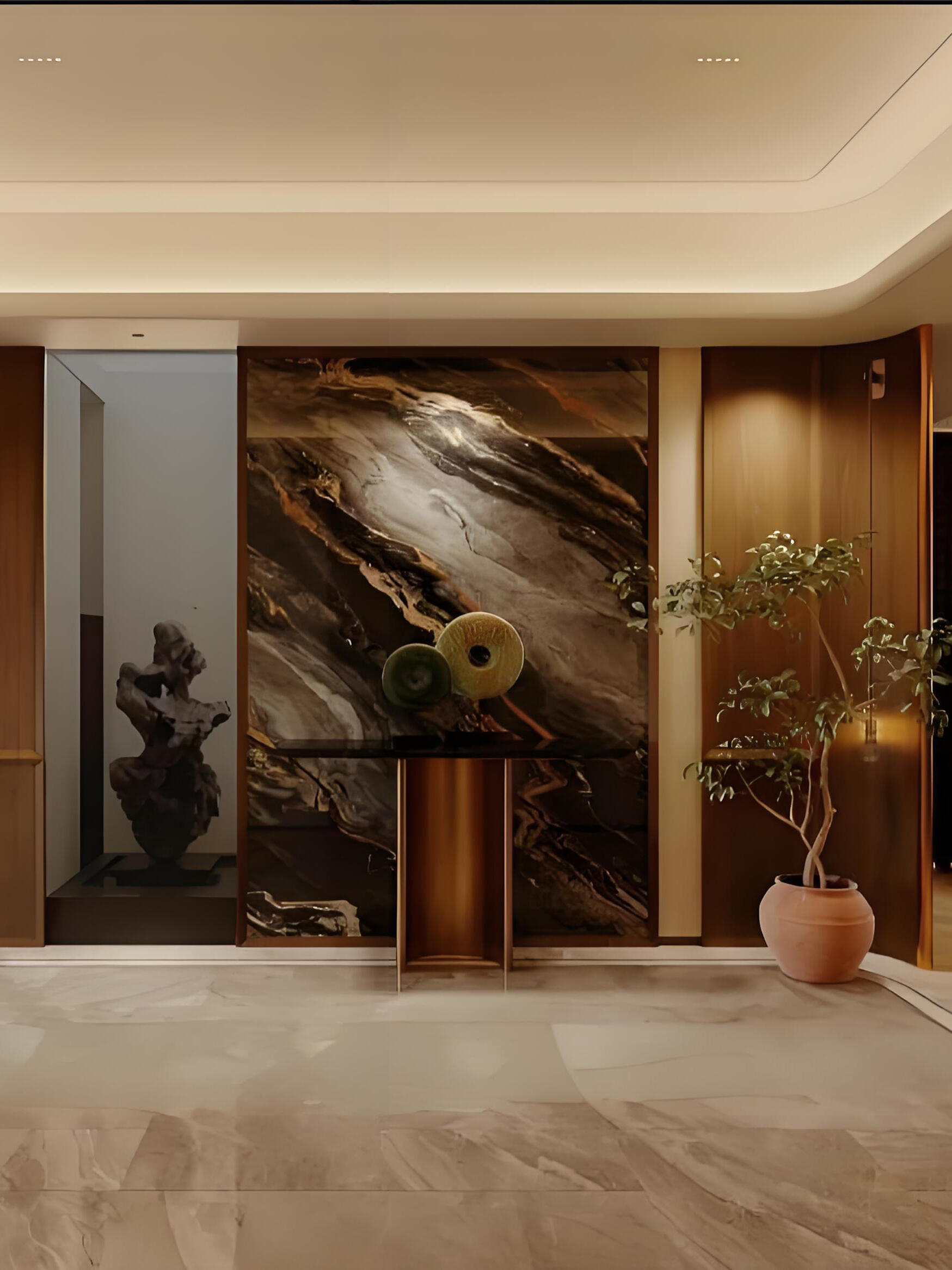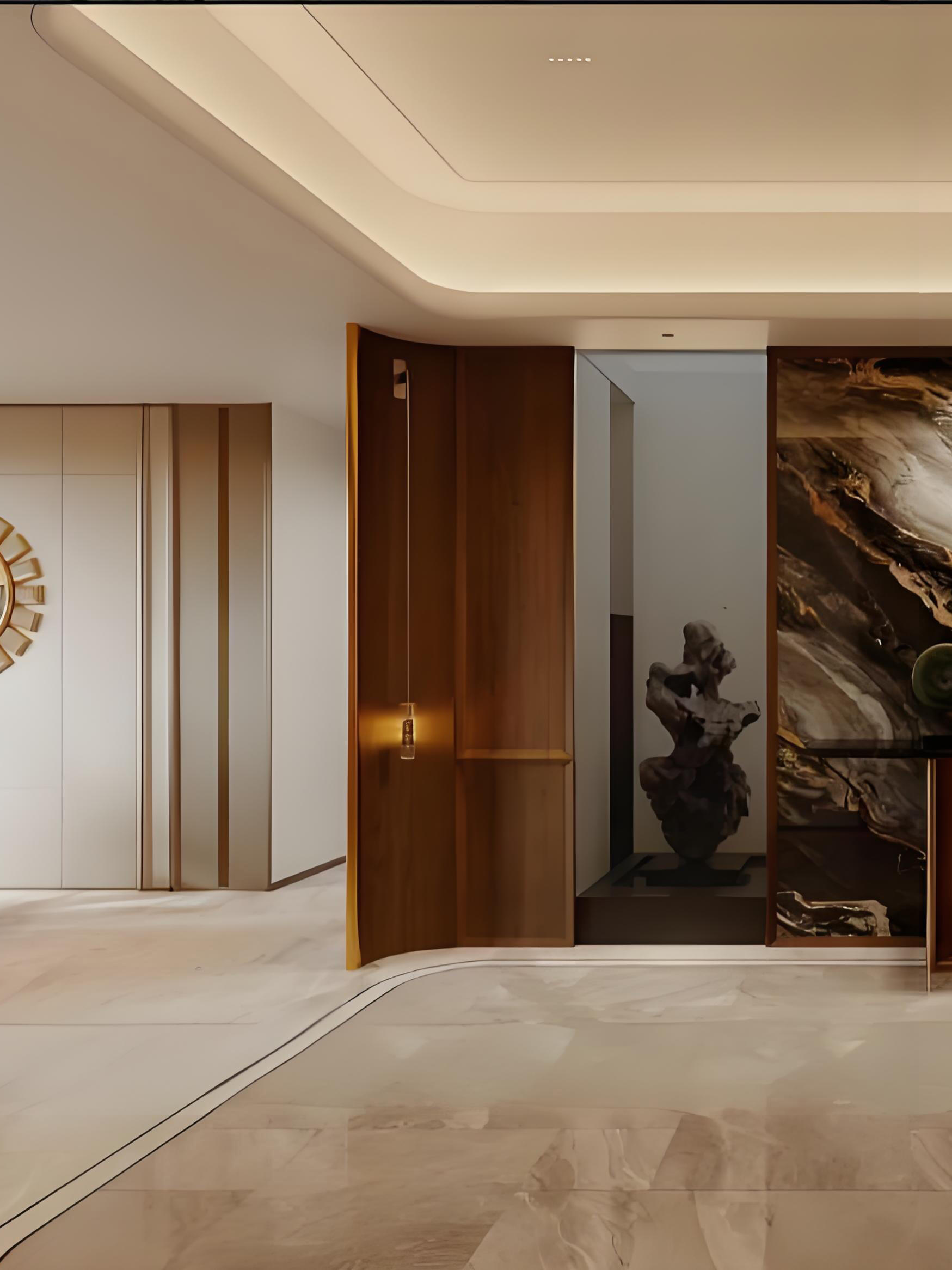 哇!一踏入这个门厅,目光瞬间就被玄关吊顶牢牢锁住,美滴很呐!这完全是古典韵味的一次华丽绽放!设计师大胆采用精致的木饰面护墙板作为基底,温润的木质纹理与沉稳的色调,瞬间奠定了高贵典雅的基调。而最令人拍案叫绝的,是那一道优雅的弧形吊顶,流畅的曲线宛若天穹,柔化了空间界限。但惊喜远不止于此!在古典主义的雕花与线条之中,竟巧妙地融入了简洁利落的现代手法,让奢华感褪去厚重,变得轻盈、摩登。这哪里是简单的复古?这分明是古典风骨与现代灵魂的惊艳碰撞,成就了一处让人流连忘返的古典轻奢艺境!太震撼了!