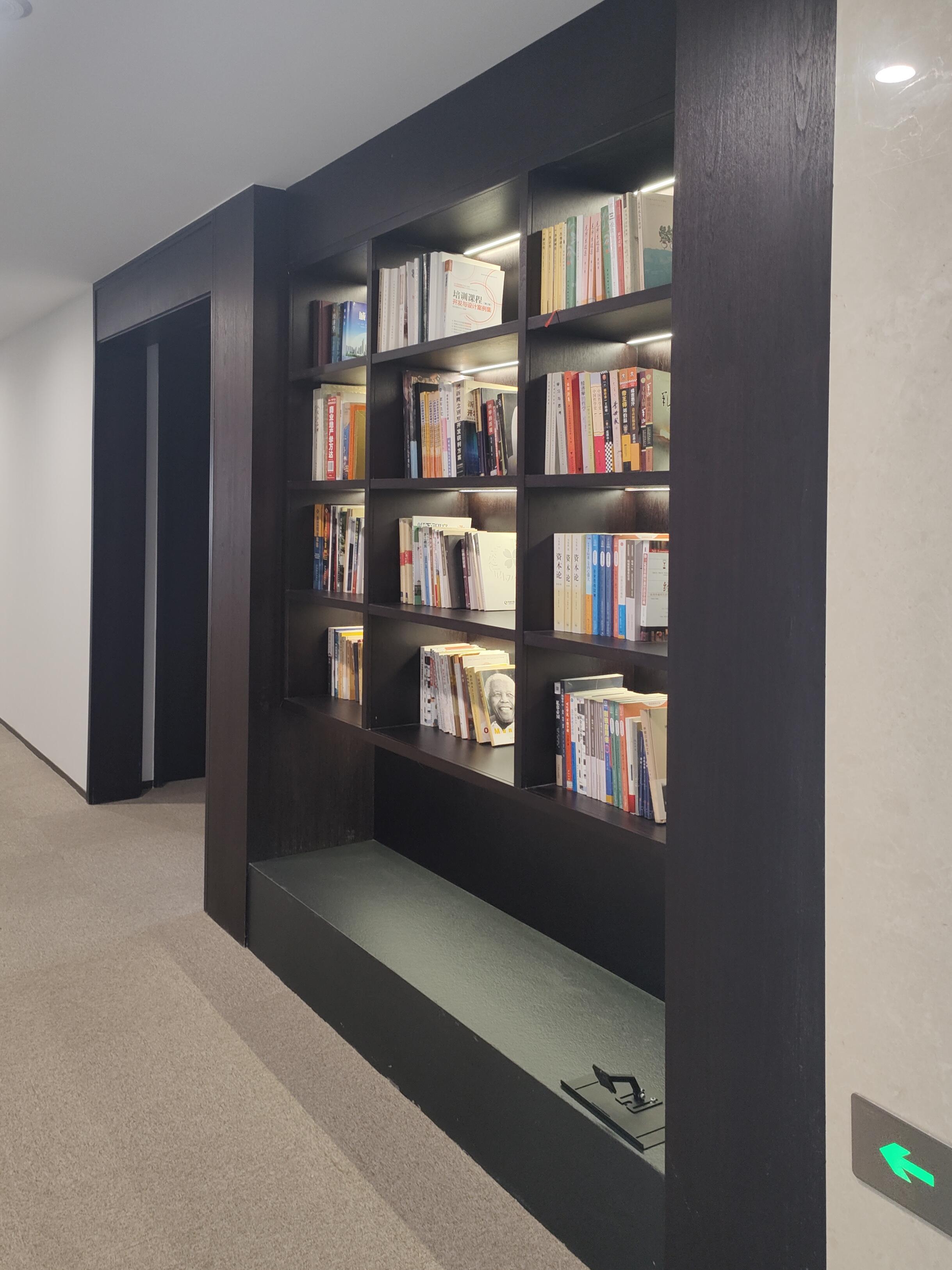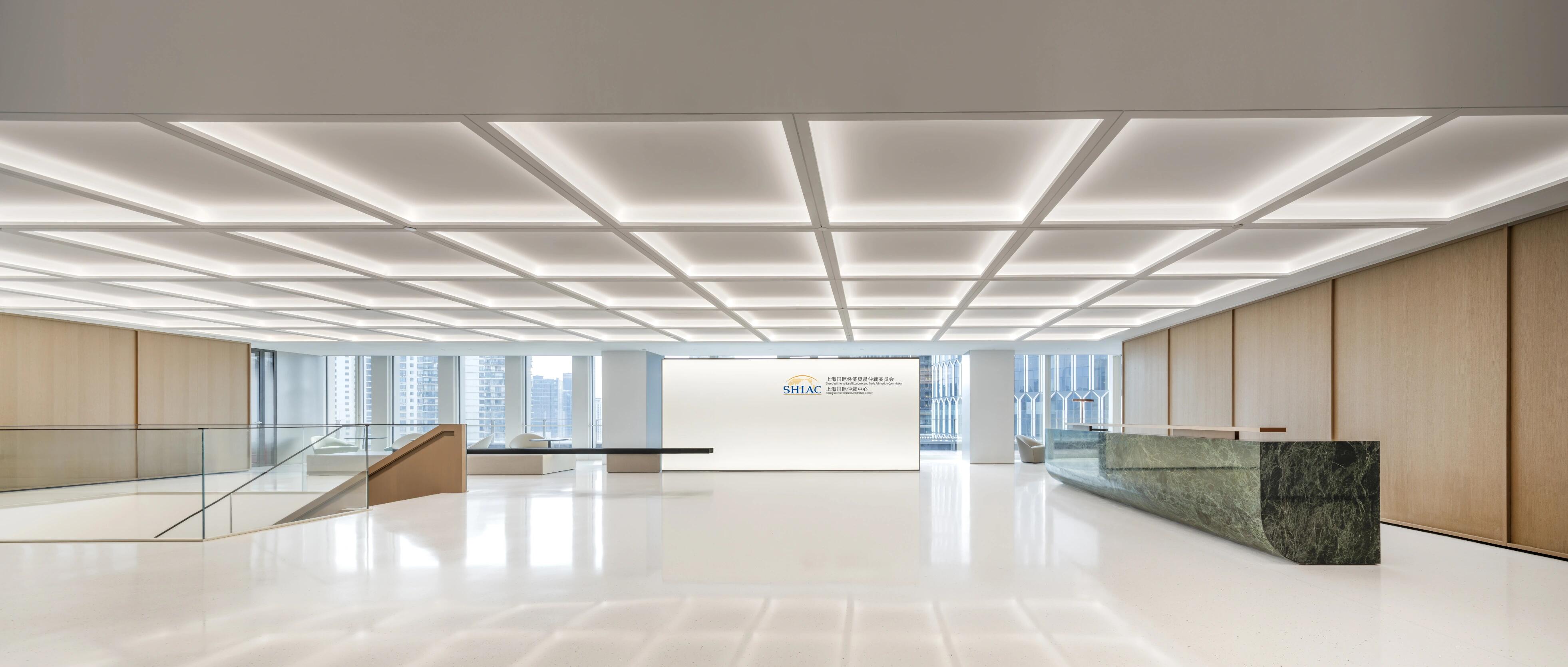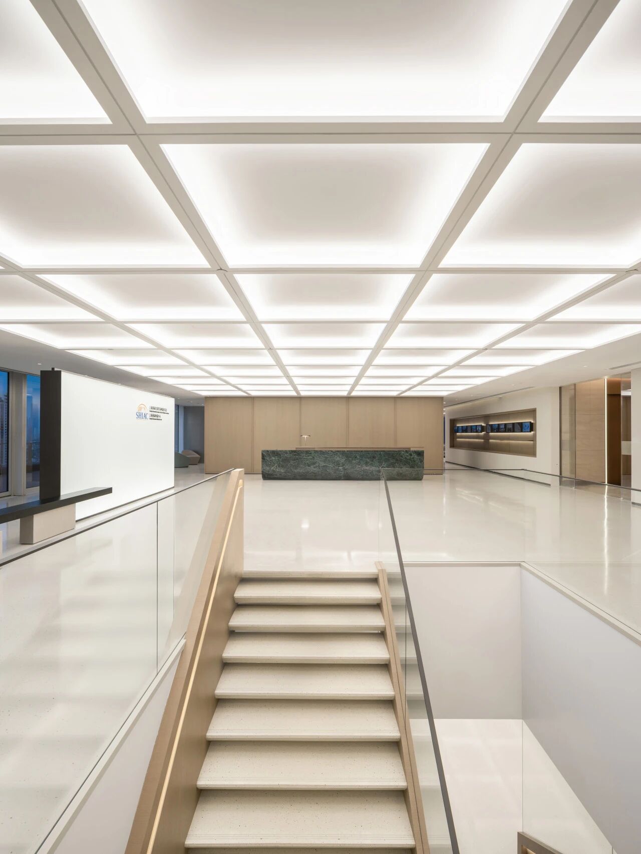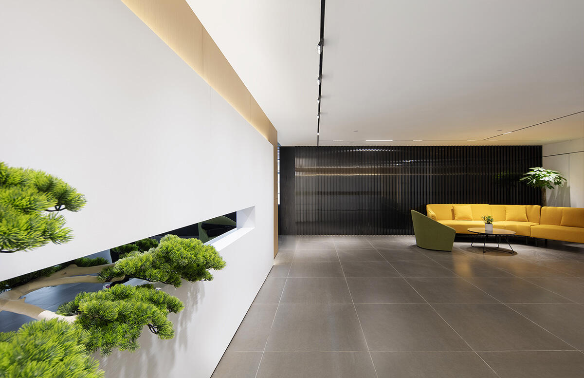 项目设计灵感来自“权衡”。权衡取其平,平者乃公道之谓也。称重量的器物,名曰衡器,衡为杆,权为砣。黑色条形石材台如秤杆横跨接待区,连接Logo墙。前台绿大理石象征石权。石权,俗称秤砣,是古代讼师追求法治公正的标志。方格天花造型,漫反射灯光均匀而和谐。整体设计体现空间的正气和秩序感。