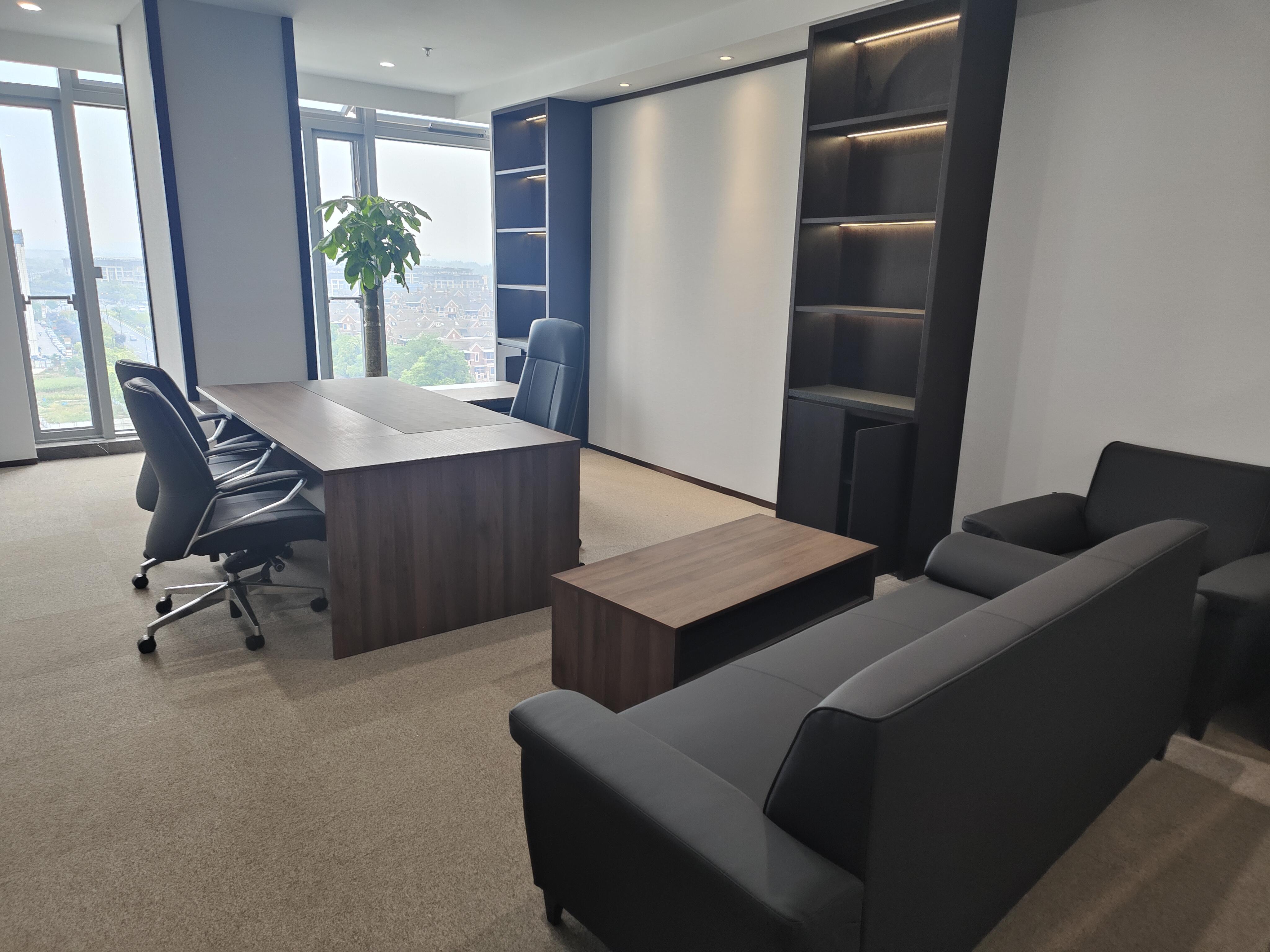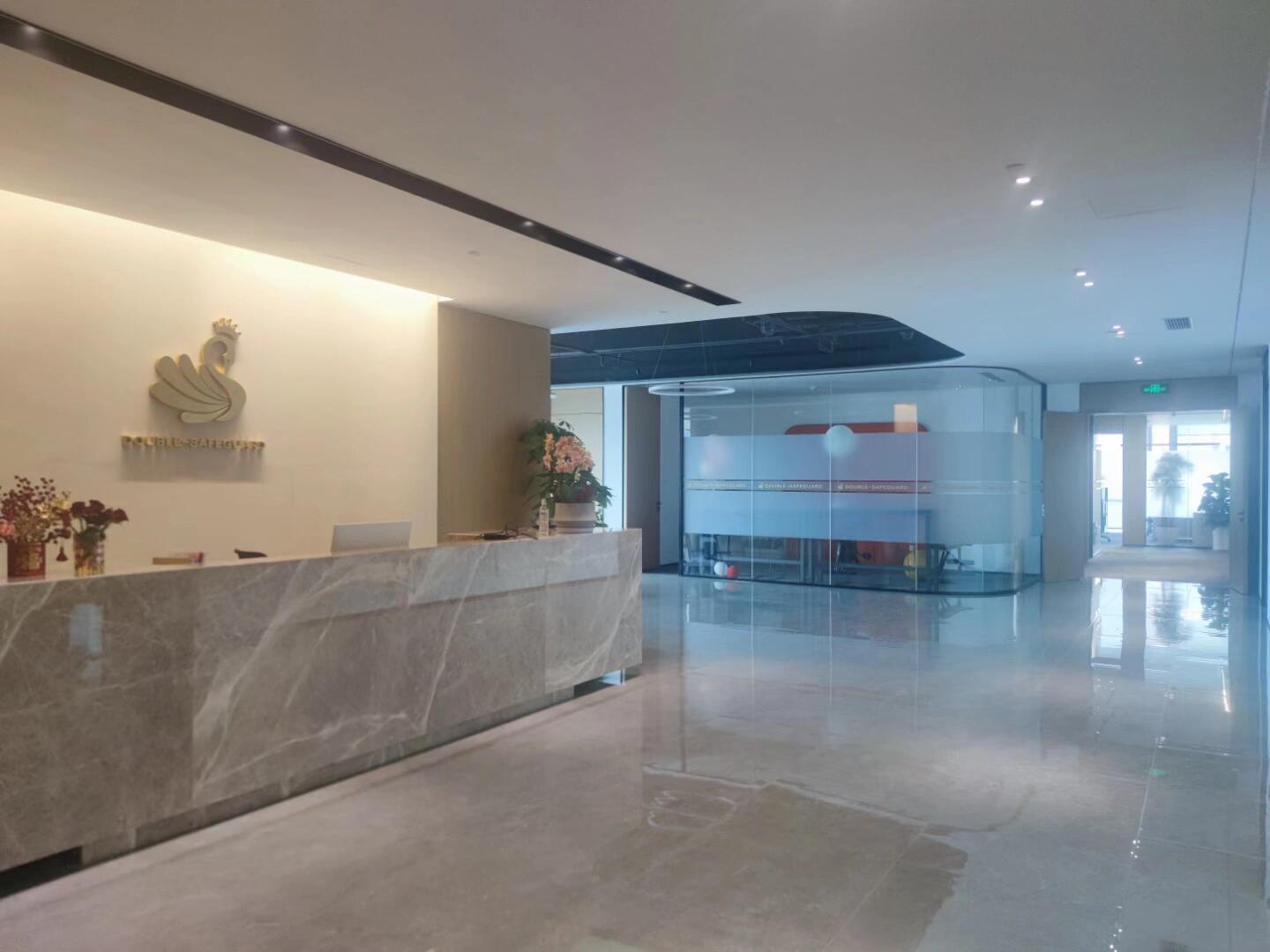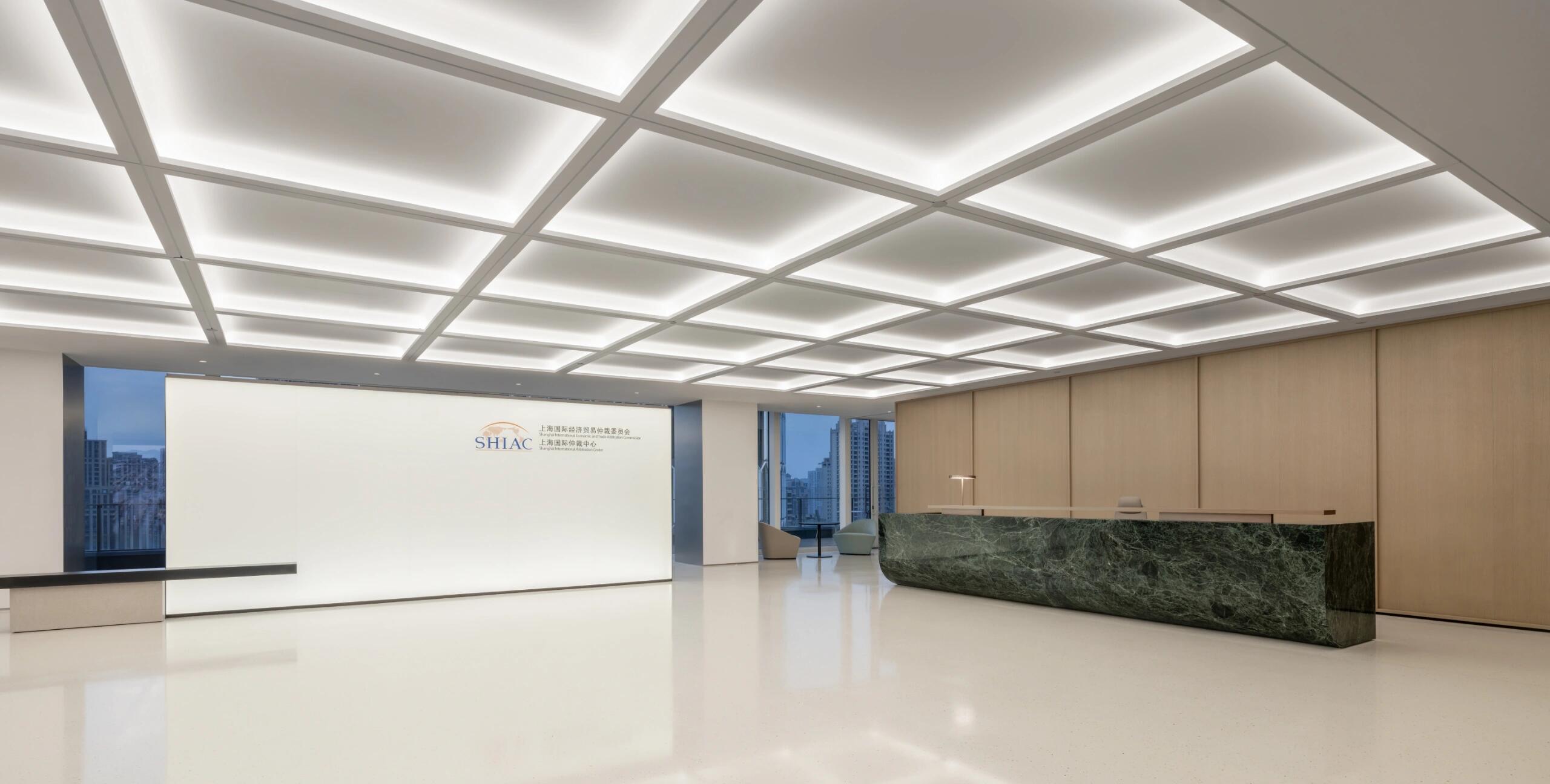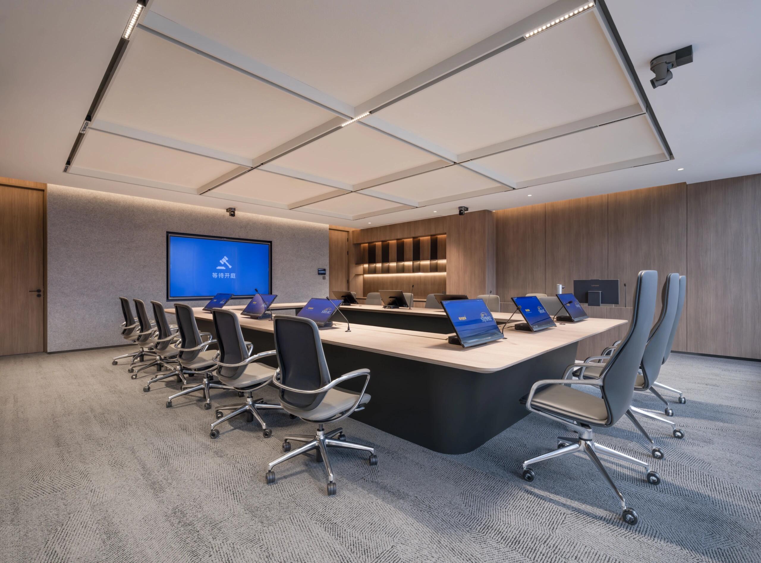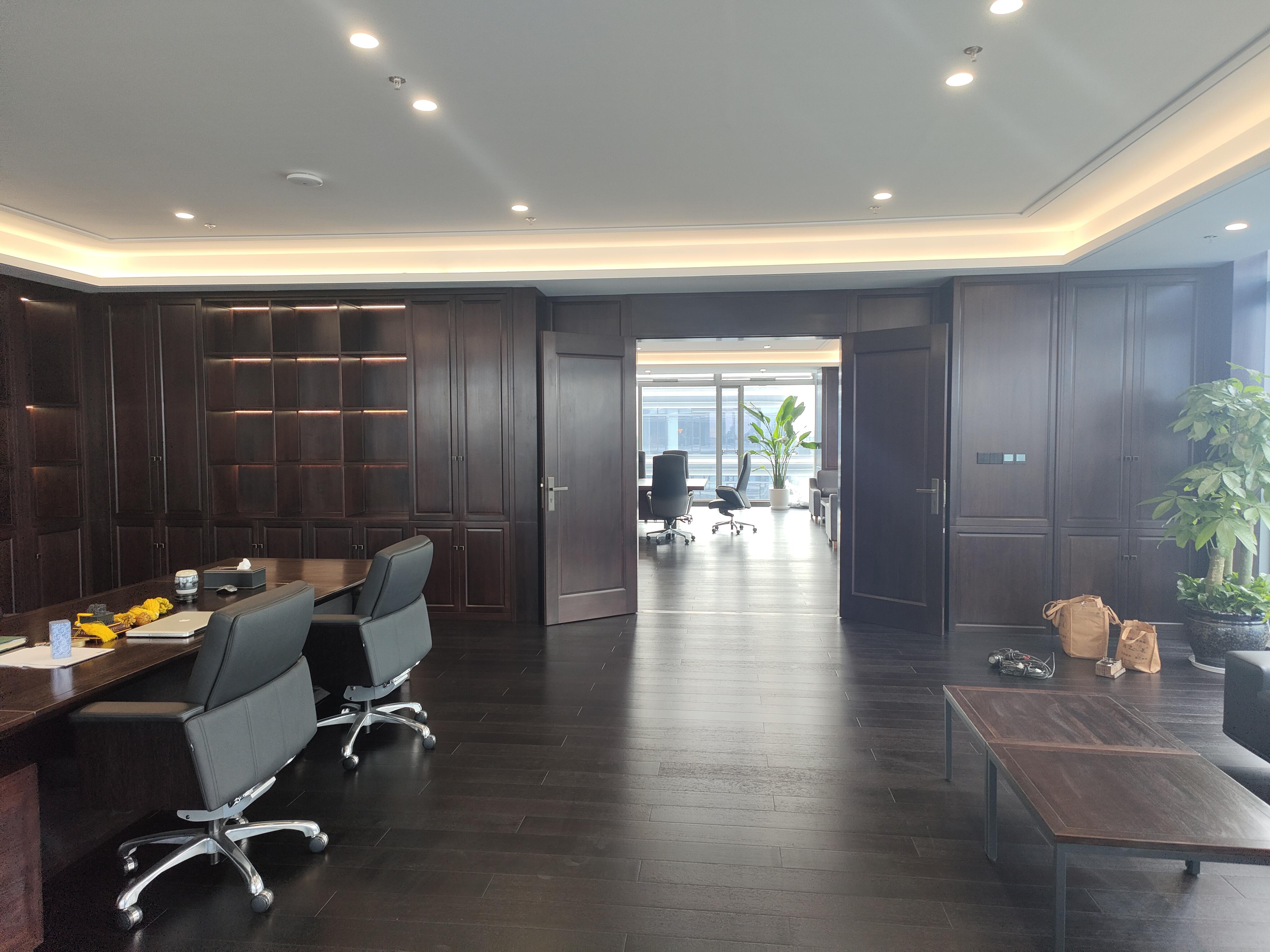 项目设计灵感来自“权衡”。权衡取其平,平者乃公道之谓也。称重量的器物,名曰衡器,衡为杆,权为砣。黑色条形石材台如秤杆横跨接待区,连接Logo墙。前台绿大理石象征石权。石权,俗称秤砣,是古代讼师追求法治公正的标志。方格天花造型,漫反射灯光均匀而和谐。整体设计体现空间的正气和秩序感。