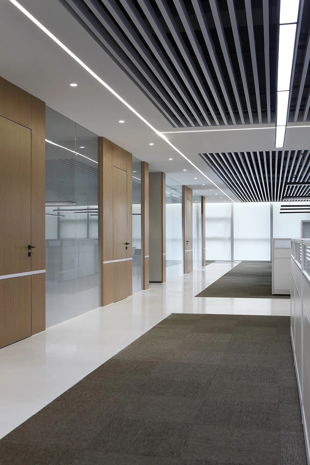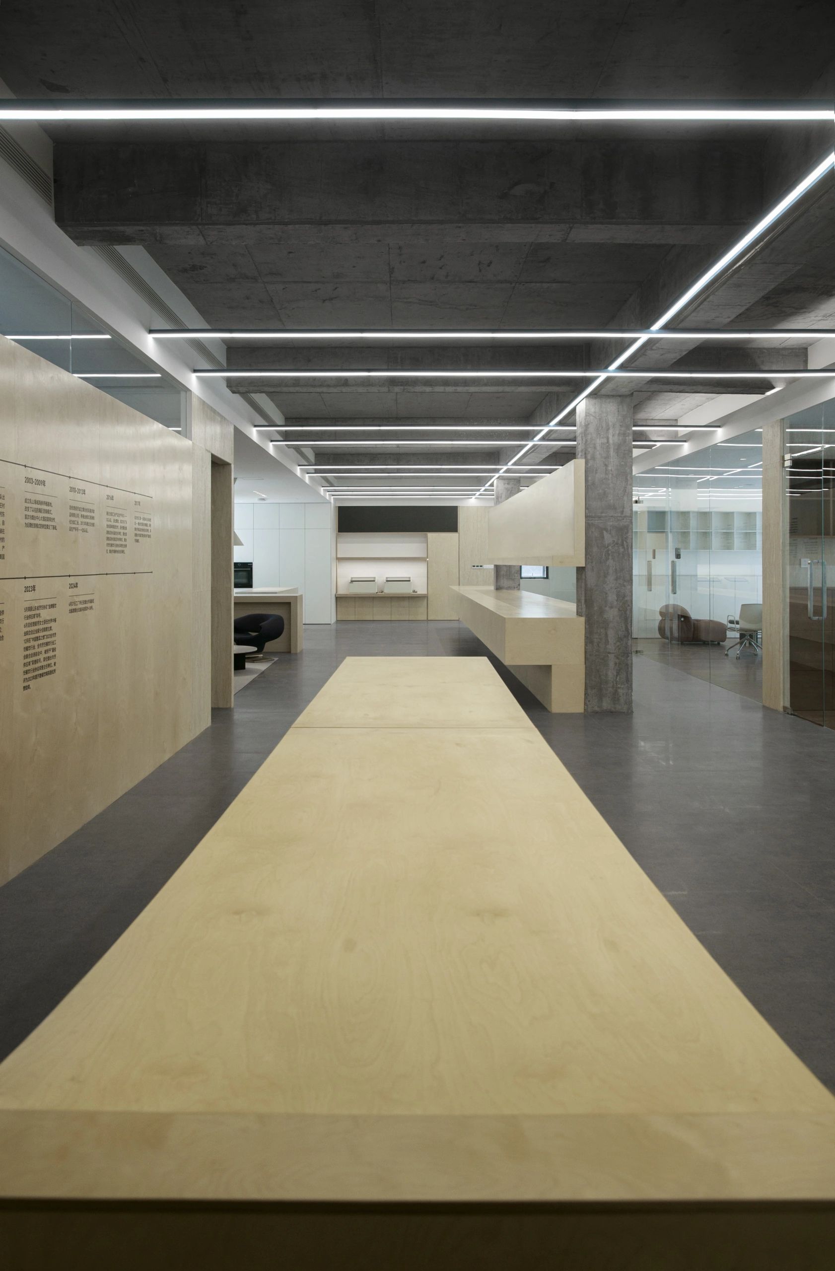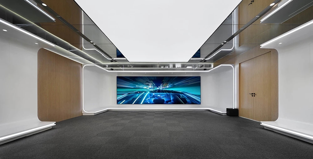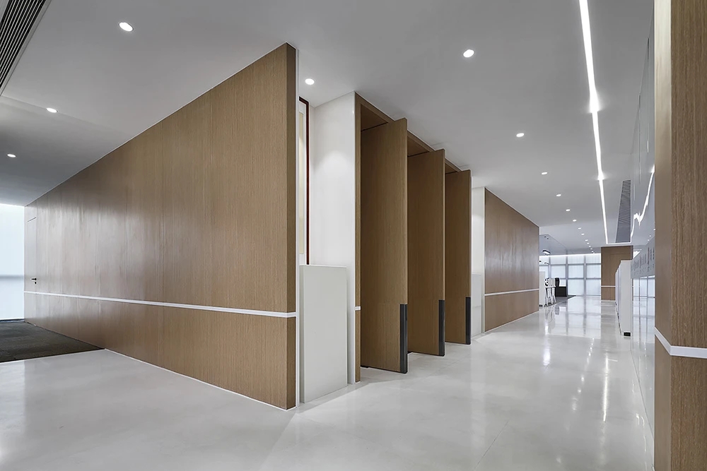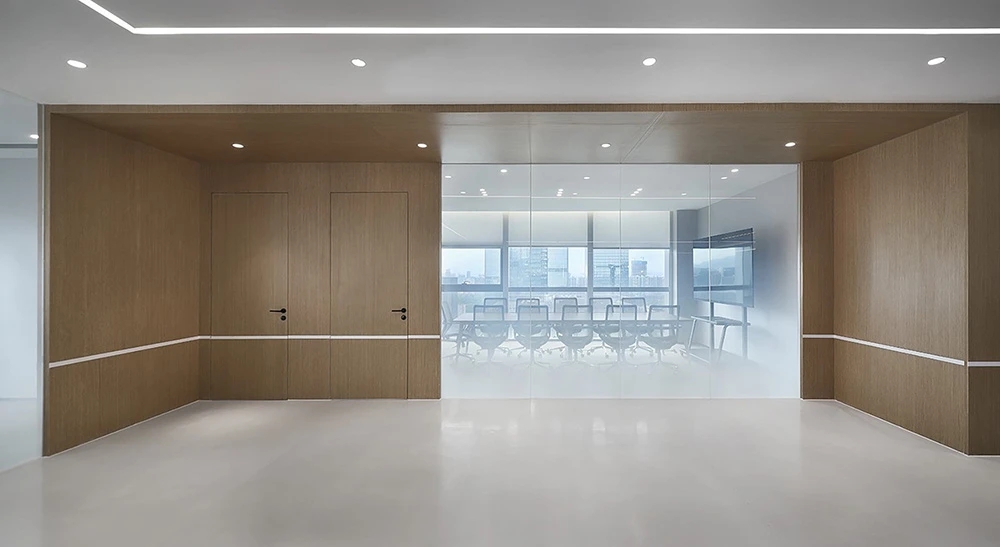 #办公智造# 会议室秉承现代简约的设计宗旨,合理、功能性是配置的内核。简约的气场协调了整体性也传达质感内涵。办公区域从大处着眼、小处落笔,向外望去,视觉上设计师也是精心考量,设计初衷并不仅仅是创造一个每天工作的办公室。设计上对于材料,功能,灯光布局深究后,其目的是使办公环境更愉悦舒适。办公设计也需要考量如何拿捏空间中遮蔽与通透性,走廊过通道展厅链接办公区域与休闲区域,顶面、立面和地面,勾勒了一个充满律动且科技感空间。会议室通过有序玻璃,原木,自然光线打造了一个流动空间,留白在空间中拥有强大包容性与融合感。