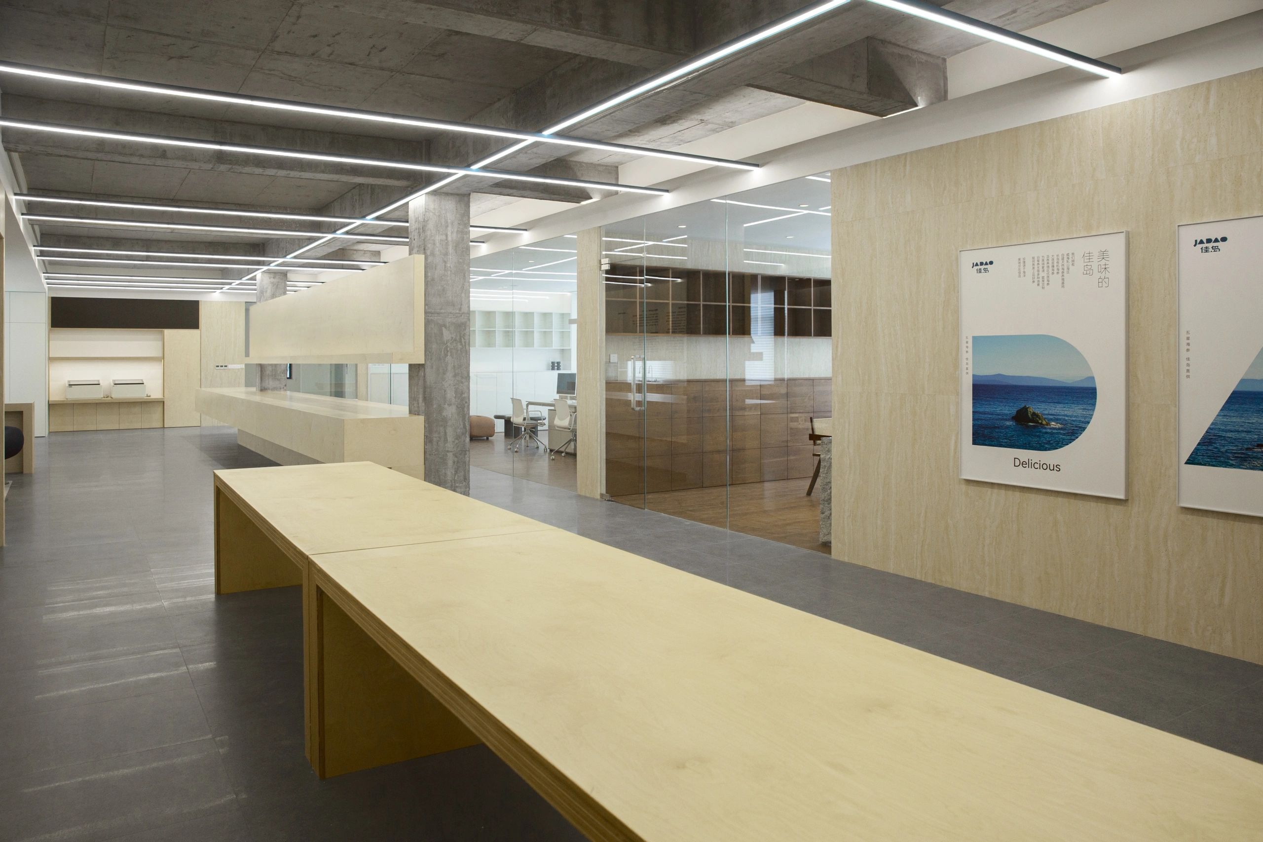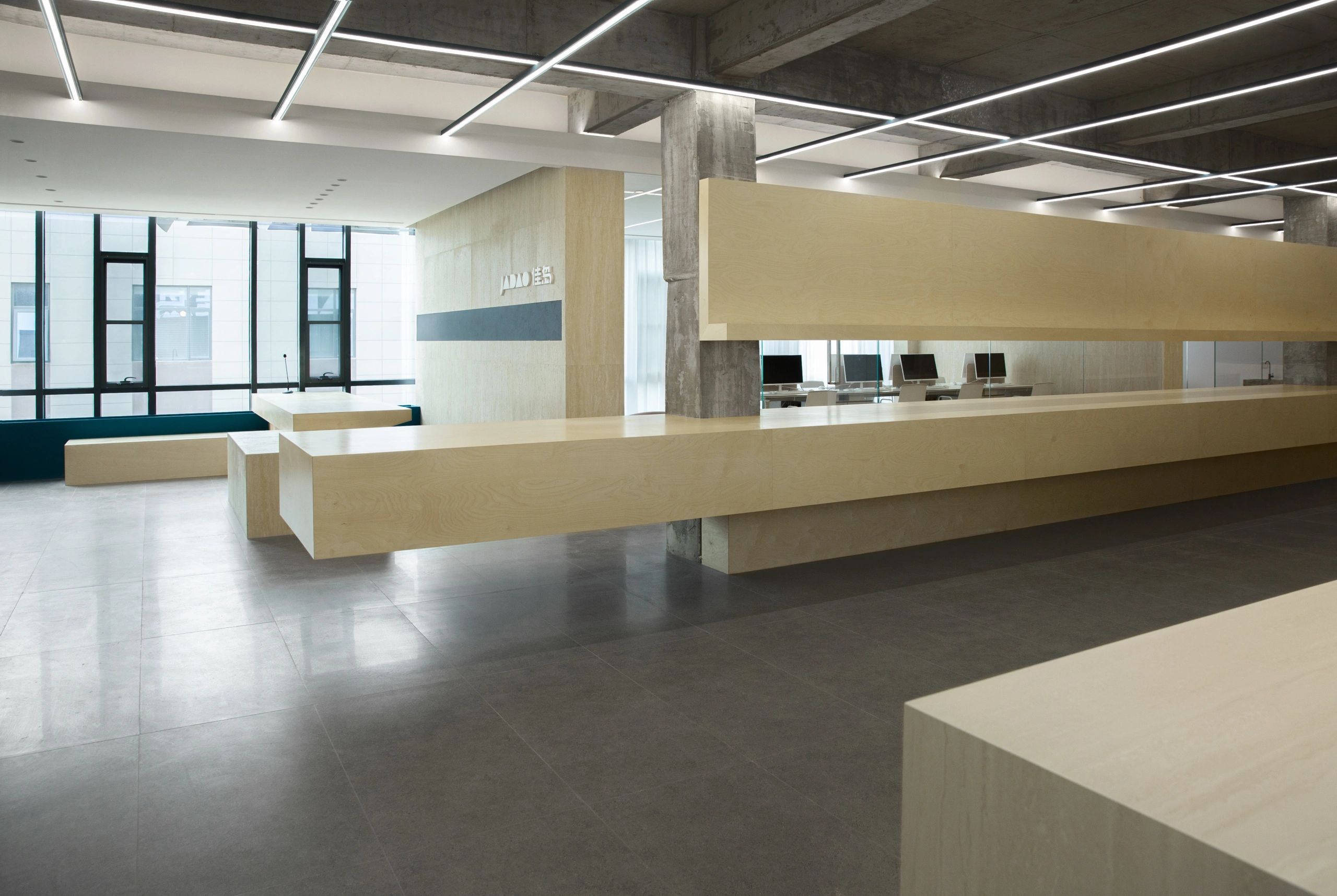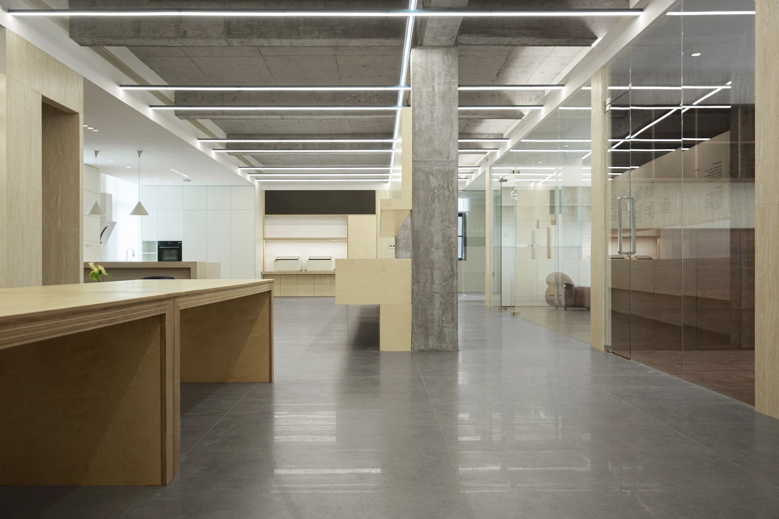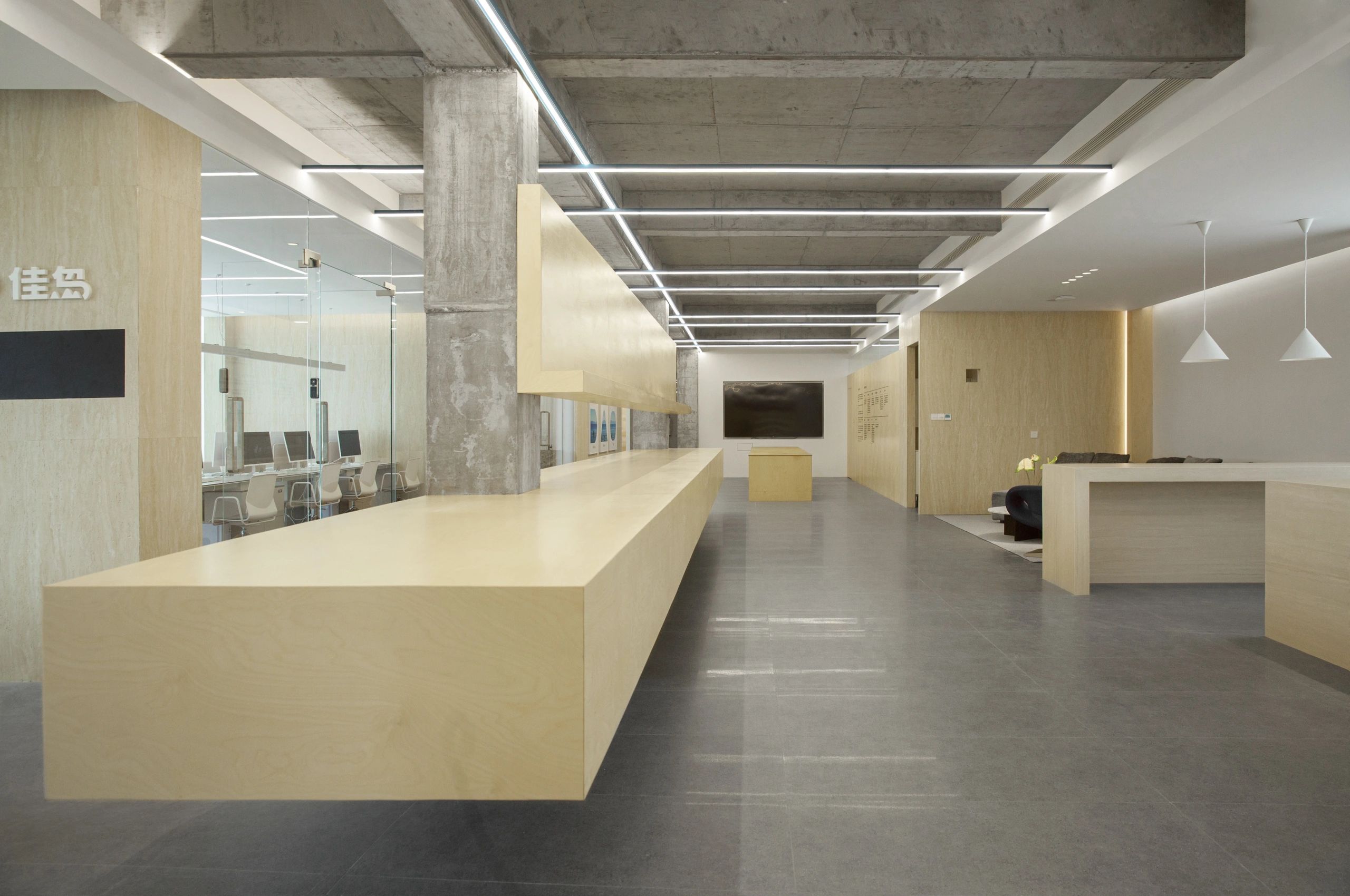 #办公智造# 会议室秉承现代简约的设计宗旨,合理、功能性是配置的内核。简约的气场协调了整体性也传达质感内涵。办公区域从大处着眼、小处落笔,向外望去,视觉上设计师也是精心考量,设计初衷并不仅仅是创造一个每天工作的办公室。设计上对于材料,功能,灯光布局深究后,其目的是使办公环境更愉悦舒适。办公设计也需要考量如何拿捏空间中遮蔽与通透性,走廊过通道展厅链接办公区域与休闲区域,顶面、立面和地面,勾勒了一个充满律动且科技感空间。会议室通过有序玻璃,原木,自然光线打造了一个流动空间,留白在空间中拥有强大包容性与融合感。