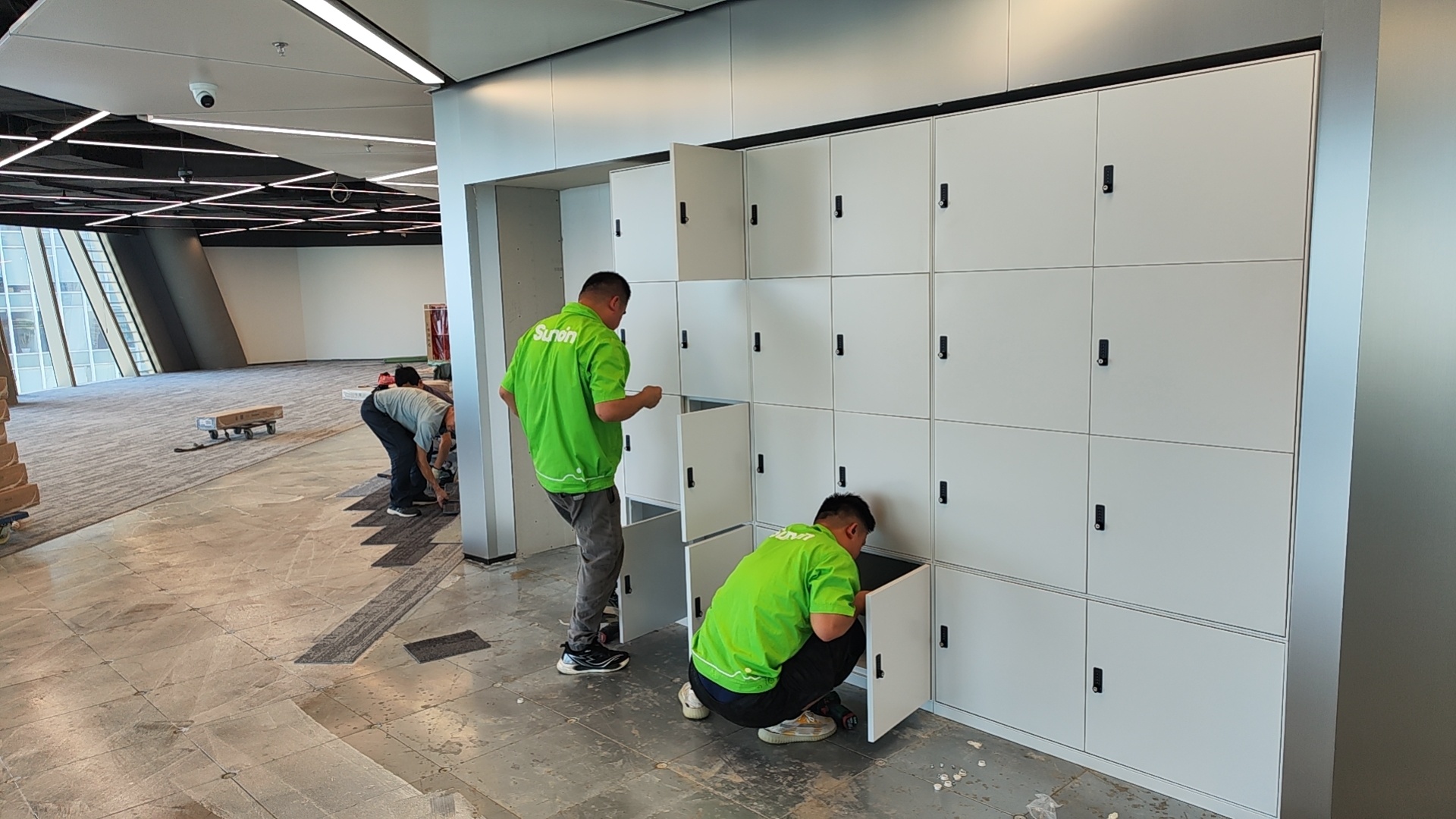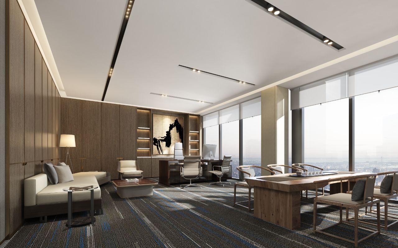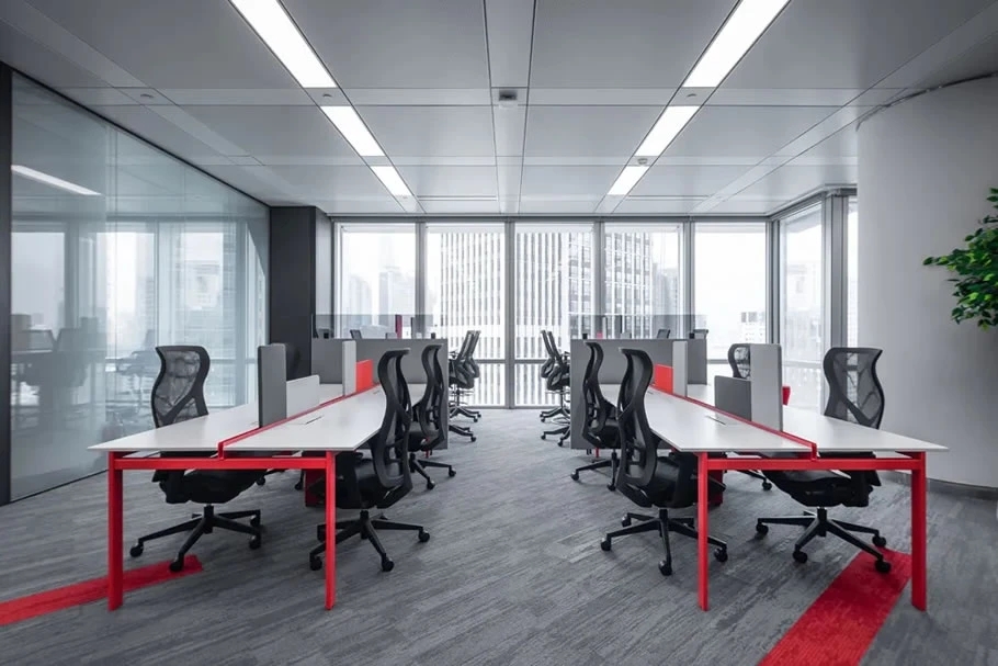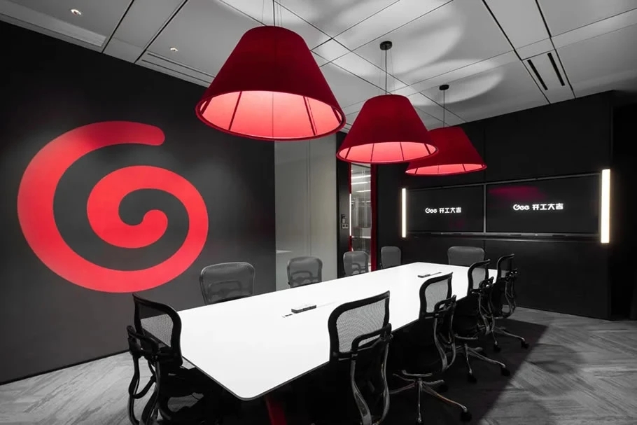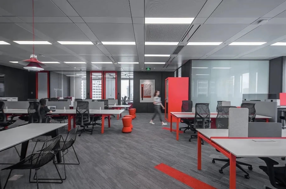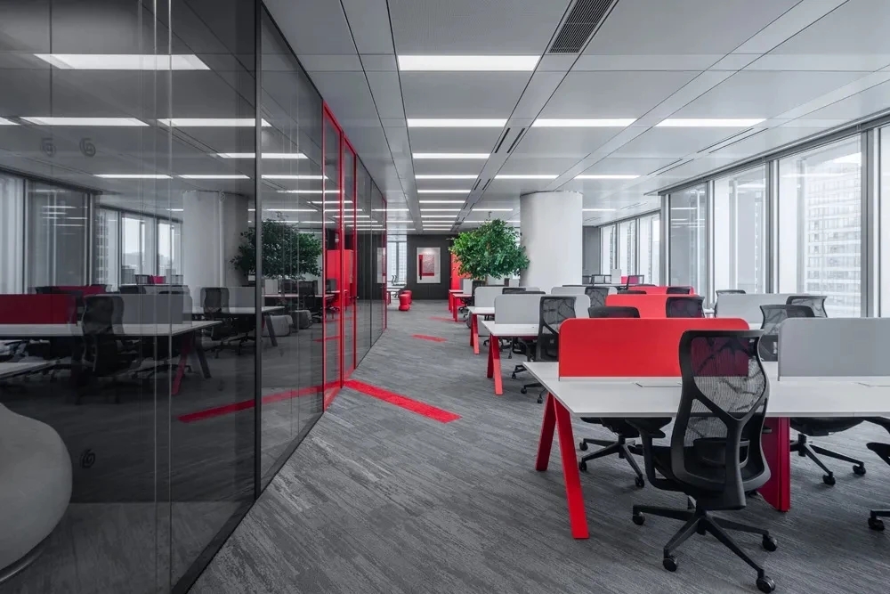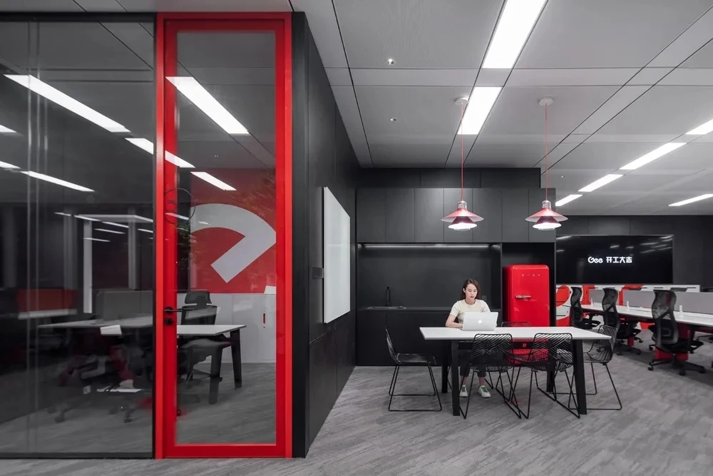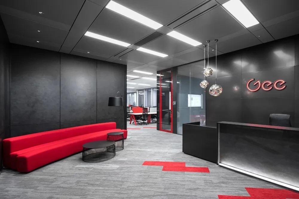 设计突破了传统规划空间的界限,为办公场景赋予更加多元化的元素,将色彩碰撞搭配智能办公科技,打造了一个颠覆传统空间概念的全新办公空间,展现公司与未来办公体验的无限可能。走出电梯厅便可见Gee“红”与“黑”带来的强烈视觉冲击,整个办公空间以“红、黑、灰”诠释空间色彩的可行性搭配。进入办公区域后不同于千篇一律的传统格子间,独立房间采用全景双玻替代传统门窗,超高定制的扇门玻璃爆改传统固有的2.4米门头,最大限度将光线与外滩景观与办公空间融合。从视觉上打破了功能与空间的界限,让空间使用者真正感受无边界的未来体验。设计在开放式办公区域打造了多元化功能区,除了常规办公位之外,还规划了站立式办公位(Standing office area)及办公休闲角(Casual corner)。其中办公桌的飘台更是空间延伸的独特设计,让办公体验不再局限于既定的功能范围。在这样的办公空间里,无论是全身心地工作,还是与人沟通交流,或是在休憩时的社交,都可以找到符合需求的场景。