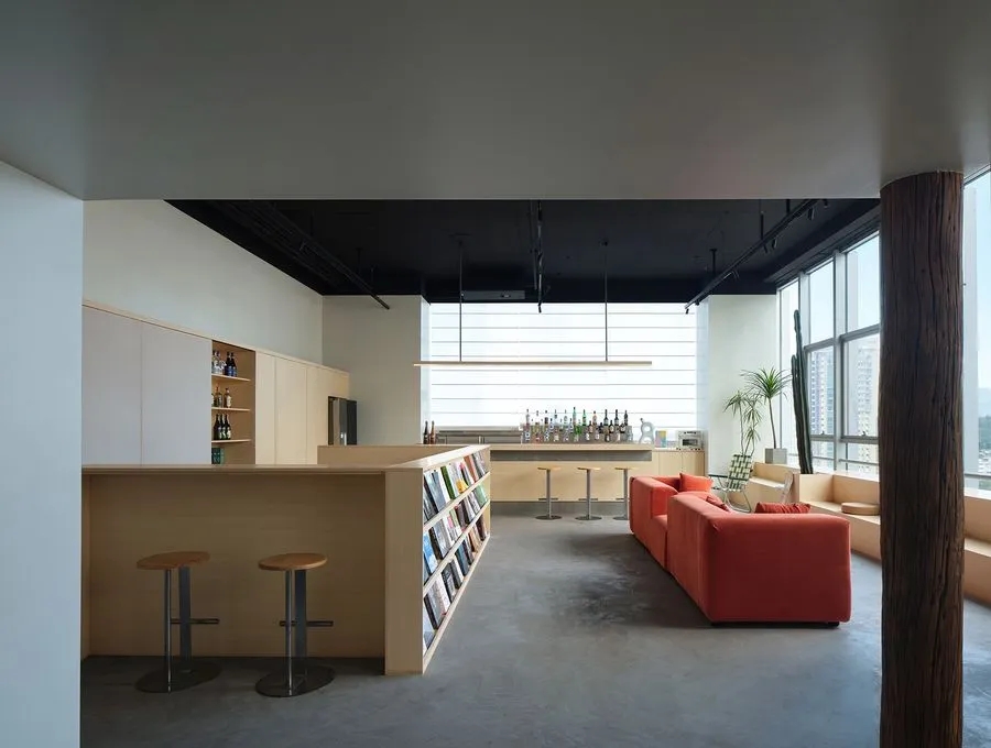 半开放式办公室,界而不隔。思维碰撞,灵感交融,工作与休闲无缝切换。思想火花自由碰撞,驻足与交谈,都是对酒文化的新探索(太阳下山办公空间)。