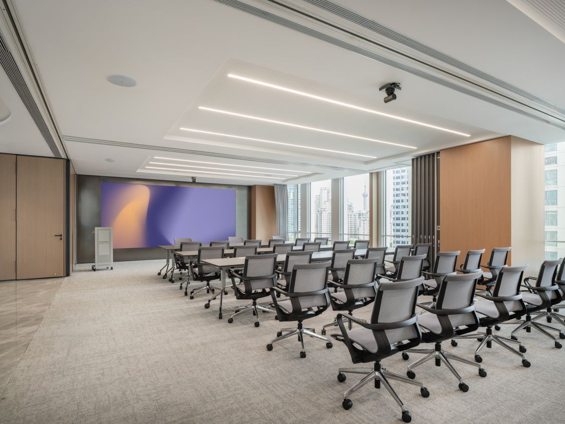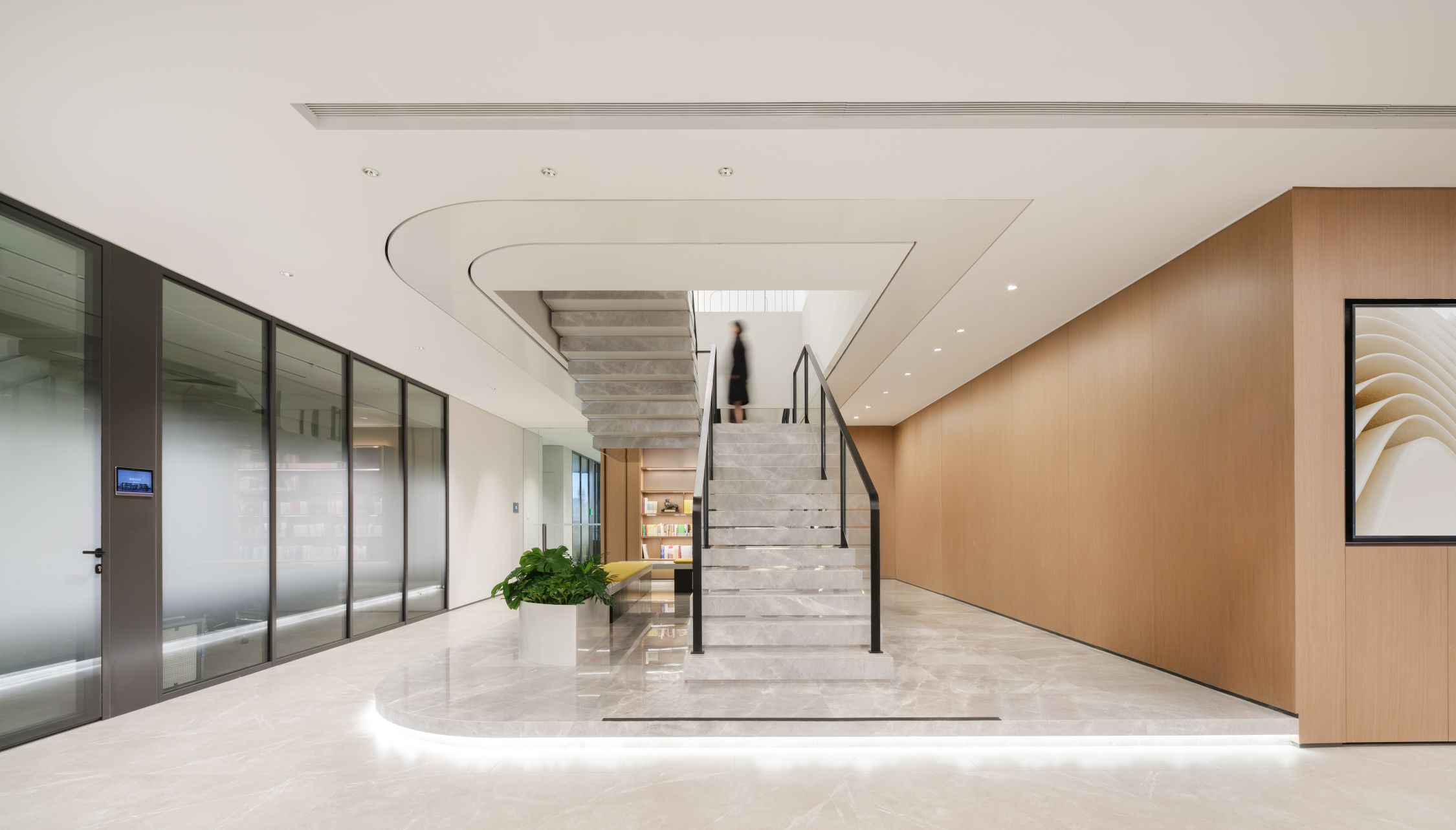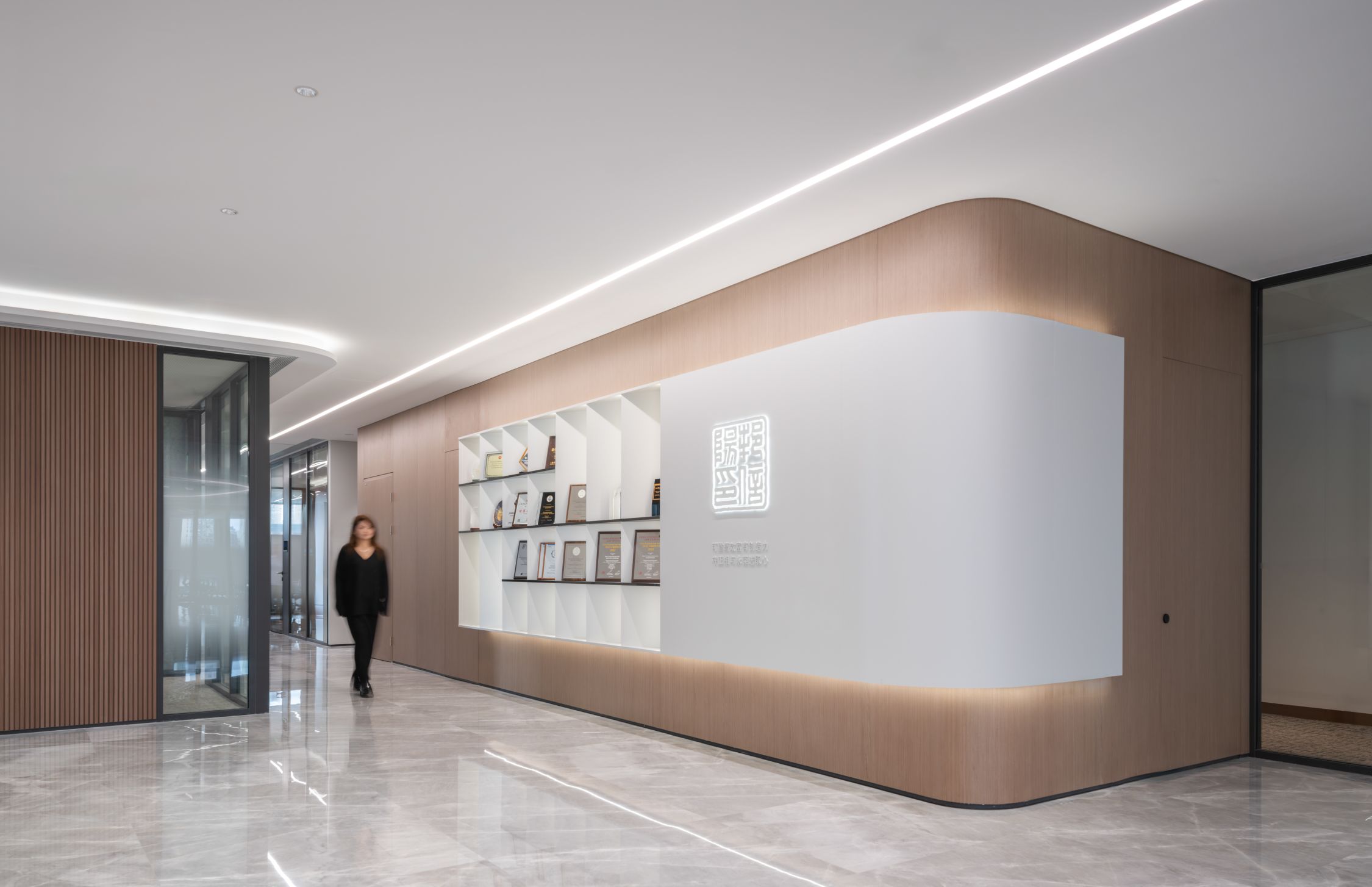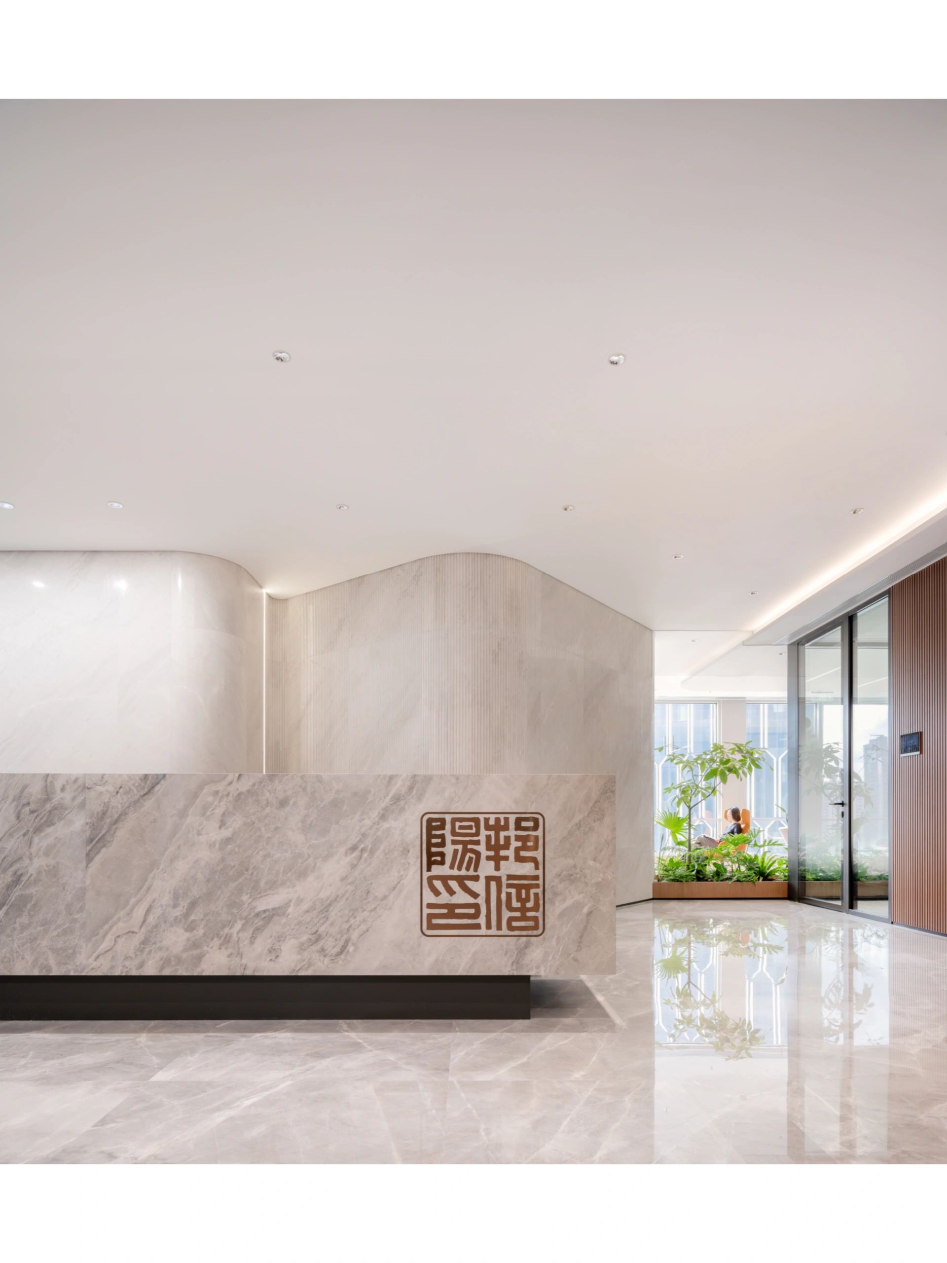 空间整体采用现代简约的装饰风格,以明快的灰白调为主。选用了大量石材、原木等天然元素,与玻璃、金属等材料相结合,同时根据空间功能,辅以红、橙、黄等色彩与植物,为空间注入生机和活力。办公空间兼顾通透性与实用性,将律师的工作场景与现代都市生活有机融合。会议接待层主要展现了企业形象,印制在接待前台大理石上的印章,系著名书法篆刻家作品,于无声中传达出一份富有温度的信任,一份沉甸甸的责任与承诺于方寸之间,讲述着企业的理念,法治兴邦,知行于信,大道向阳。该楼层设置有大小不一、功能多样的会议室,可以满足多样化的工作场景与使用需求。头脑风暴室,配置了富有创意的办公设施,构筑了一个流动交互、多模式的弹性空间。VIP会议室,家具及陈设典雅、考究,全方位匹配来访者的尊贵身份,并在私密性等方面具有十分严格的要求。董事会议室主要用于开展较高规格的双边会议及洽谈等场景。花园走廊是一处开放的自由交流空间,开敞与通透的布局,玻璃墙的应用,最大限度地增加了工作区和休息区的阳光洒入,窗边望去,可以看见上海传统的石库门里弄和摩登的现代建筑交汇融合。在花园长廊末端,是一间讲述着东方美学的茶室,人们在这里品茗、论道。在接待吧台与等候区,营造了一处具有温度的空间,来宾可以于繁忙的工作中感受那一缕独属的阳光。等候区的另外一侧,是四合一多功能培训室,培训室的功能和大小可以由使用者自由定制。在封闭与开放之间,空间的使用变得灵动且高效。从三五个人的会议交流,到几十人的学习培训,再到上百人的论坛活动,都可以定制化开展。