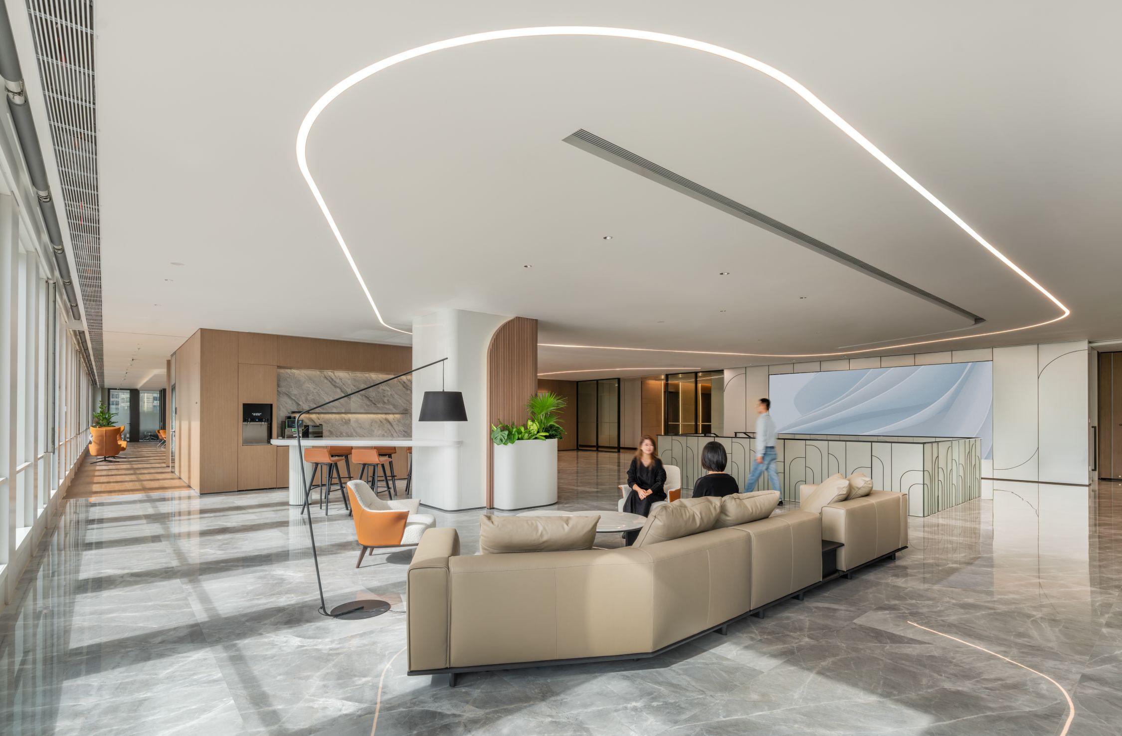 办公楼层是以开放的茶水区为空间枢纽,向两端延伸工作区。茶水区由沙发、卡座、吧台、读书角等功能共同围合而成,为员工提供了一处参与休闲交流的天地。在这里,咖啡机、直饮水机、微波炉、音箱、零食饮料售货机等设施一应俱全。员工可以参与小憩,可以读书、看电视、听音乐,也可以互动交流。