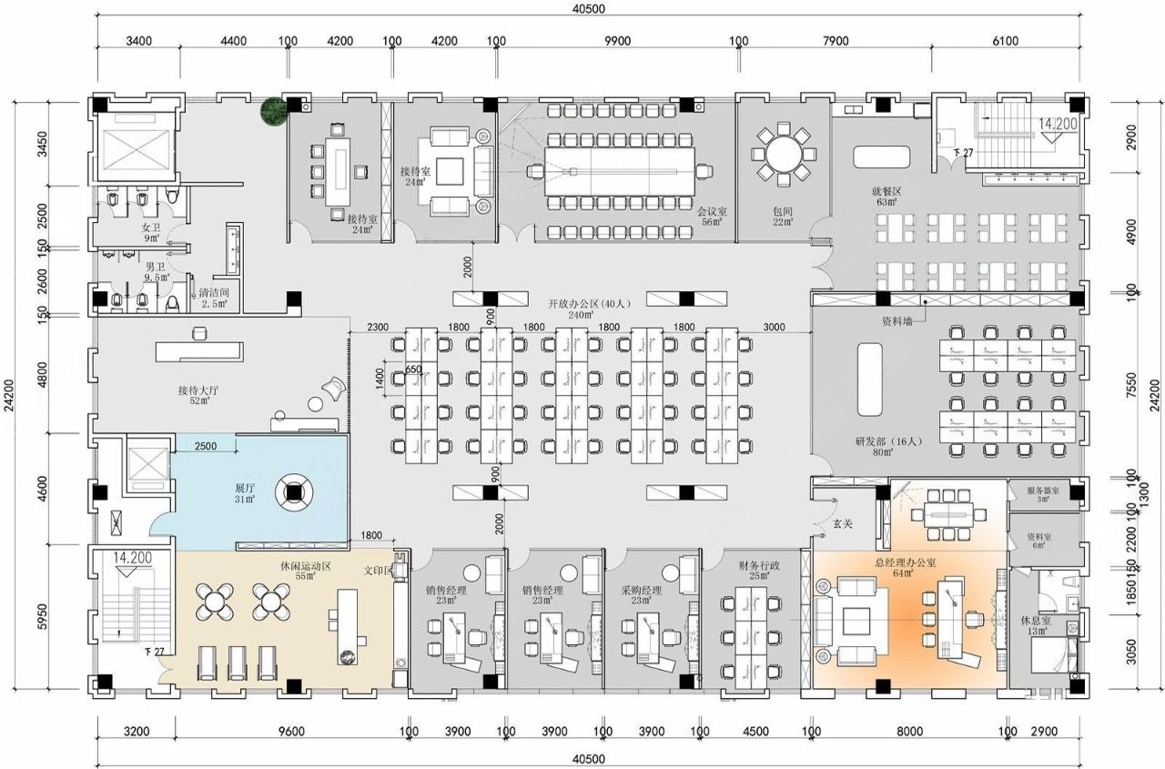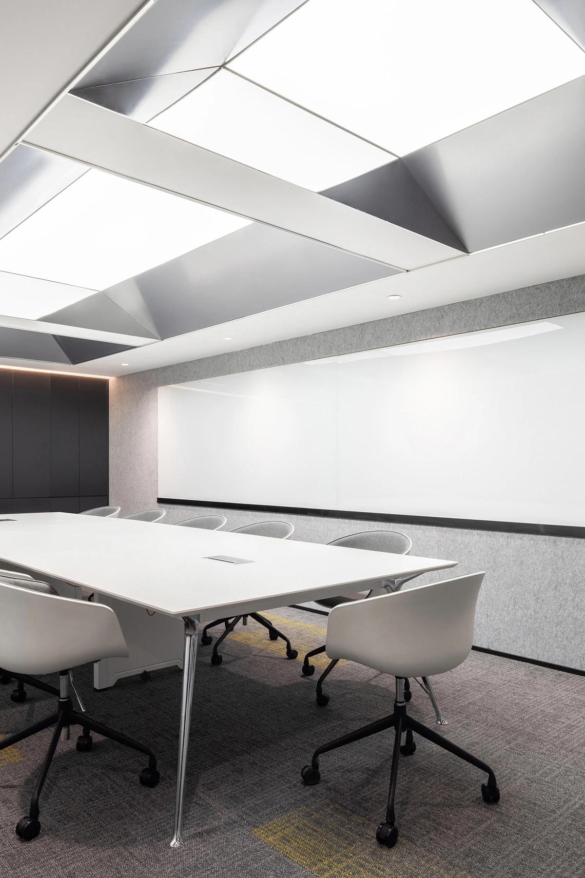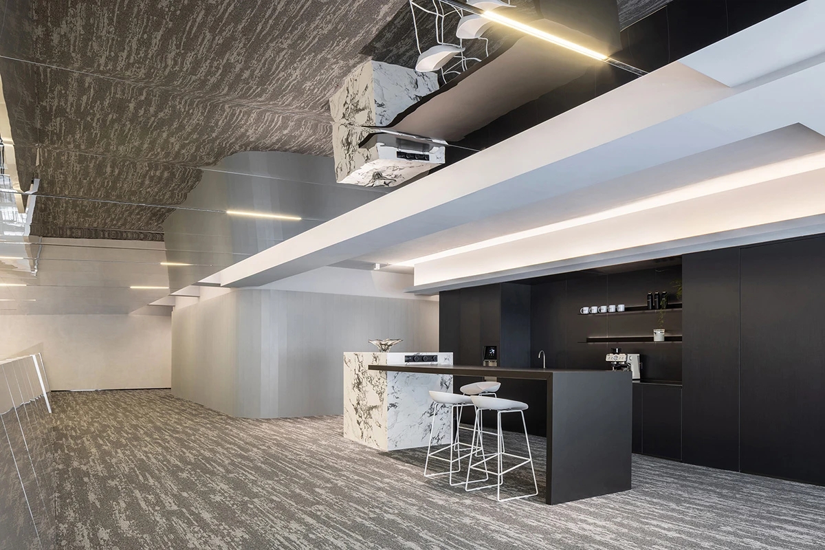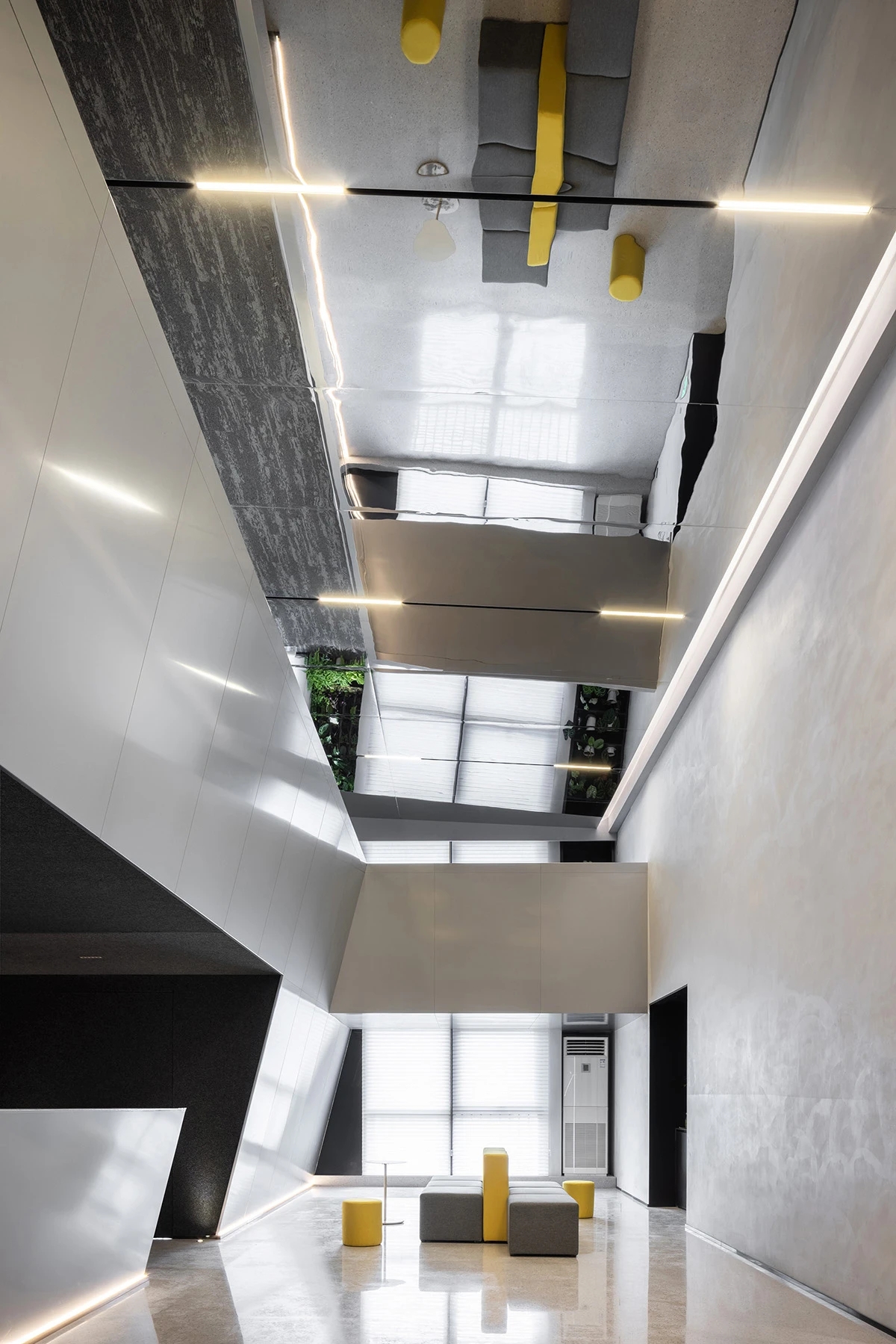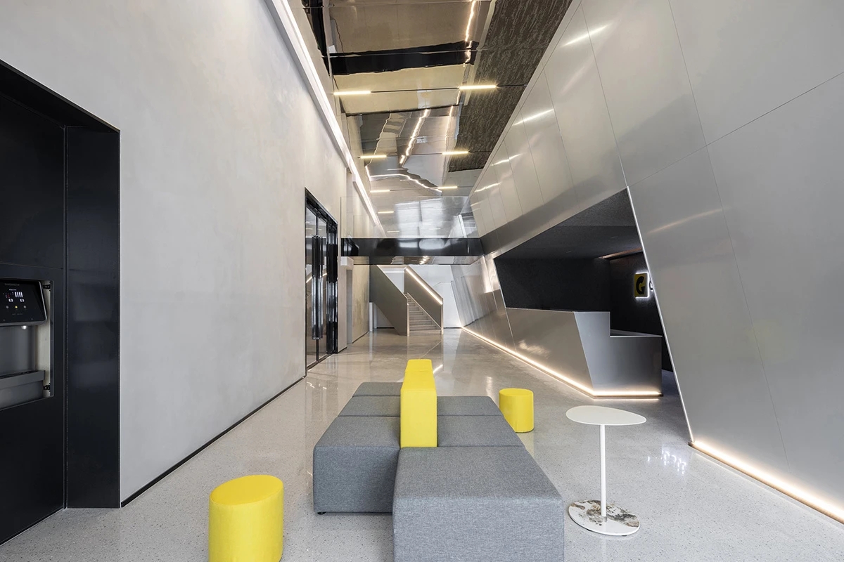 接待前厅,作为进入总部的第一空间,极具视觉张力和记忆点。整体调性以现代简约的灰色系为主,点缀少量鲜明的黄色,突出高级的科技感,通过不同材质和肌理的灰色形成叠加与融合,达成多种层次的空间构成输出,一张一弛,形成记忆锚点,于此塑造的空间语言亦在诉说着企业的品牌愿景。大面积的金属铝板,简洁干净,包裹着特别设计的一整面的斜面造型,于灯光的晕染中尽显办公空间的独特性。天花采用镜面不锈钢,让上下挑空的纵向空间无意间形成上下延伸,通透开阔,结合有序规划的氛围灯,形成辅助照明,营造出一个充满能量的未来科技新环境。前厅一侧设置了一处通往二层的楼梯,其流畅有力的线条造型呼应了前厅区域的极致美学调性,纯粹冷酷,结合恰到好处的柔和灯光,其独特的反射效果将整个空间得以无限延伸。