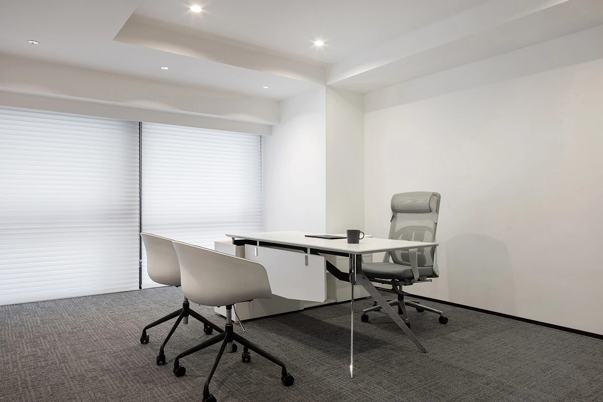 冷酷的渐变玻璃隔绝了内部与外部,满足会议的独立私密的需求。特别采用柔和纯净的软膜灯光,既遮住了天花裸露的横梁,又一定程度上削弱了层高只2.2米的压抑感,仿佛天窗的吊顶设计亮点也营造出纯粹整洁的空间调性。烤漆玻璃提供了开会讨论的头脑风暴的介质,而墙面的吸音板则将声音隔绝于会议室内部,不影响周围其它空间。企业展厅整体为黑白灰色调,延续现代简约的主基调,用棕色系的皮质单椅来点缀空间,特别注重舒适度的营造,立面运用了白色烤漆玻璃,形成多层次的空间感,满足日常客户接待、产品展示等需求。