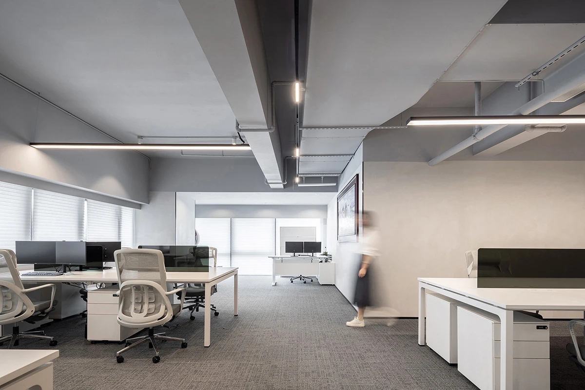 这里配置了咖啡机和橱柜等专业化设备,满足多样化的茶歇需求。当员工早上抵达公司,可以在这冲一杯喜爱的冰咖啡,即刻醒神;下午茶时段,可以是放松休憩的松弛空间;客人参观来访时,可以是临时举办欢迎小酒会的休闲空间……多样化的功能可随时切换与适配,人性化的企业关怀与温暖亦于此展现。办公区以开放式布局为主,既鼓励团队间的互动协助,又为专注的个人工作提供舒适的区域。特别设置了开放讨论区,右侧的一整面墙设计为可书写的面板,满足个人或小组间的主题讨论和项目协作。通过温暖的木质柜子、渐变的绿色地毯、窗边的高吧台座位等营造出自然轻松的环境,鼓励专业输出与人际交流。