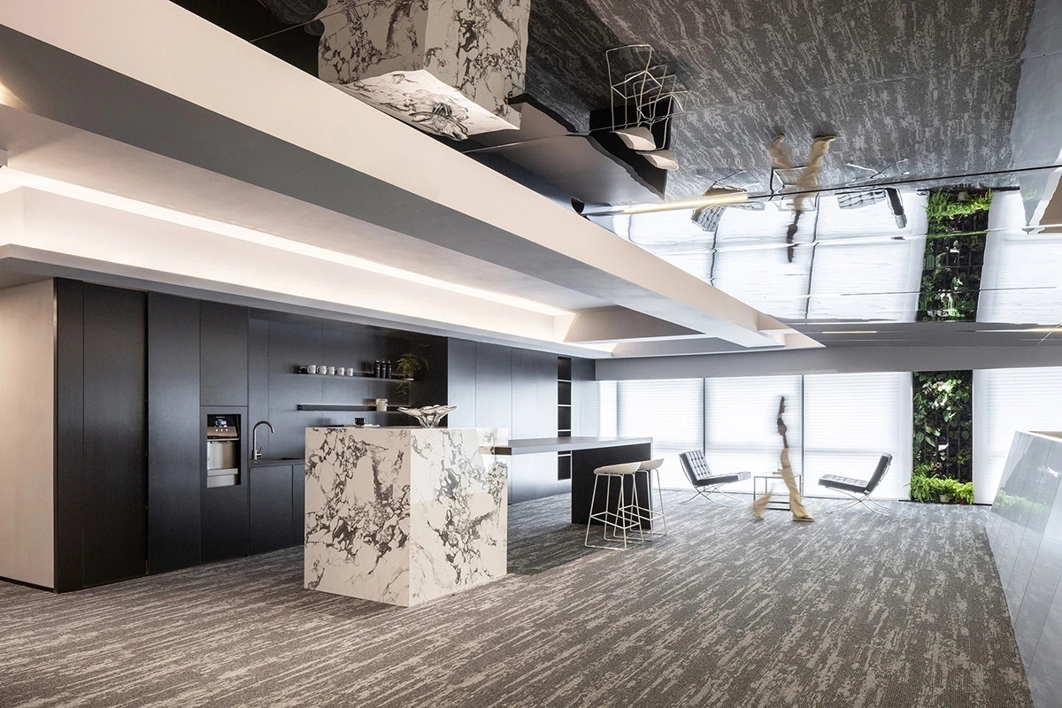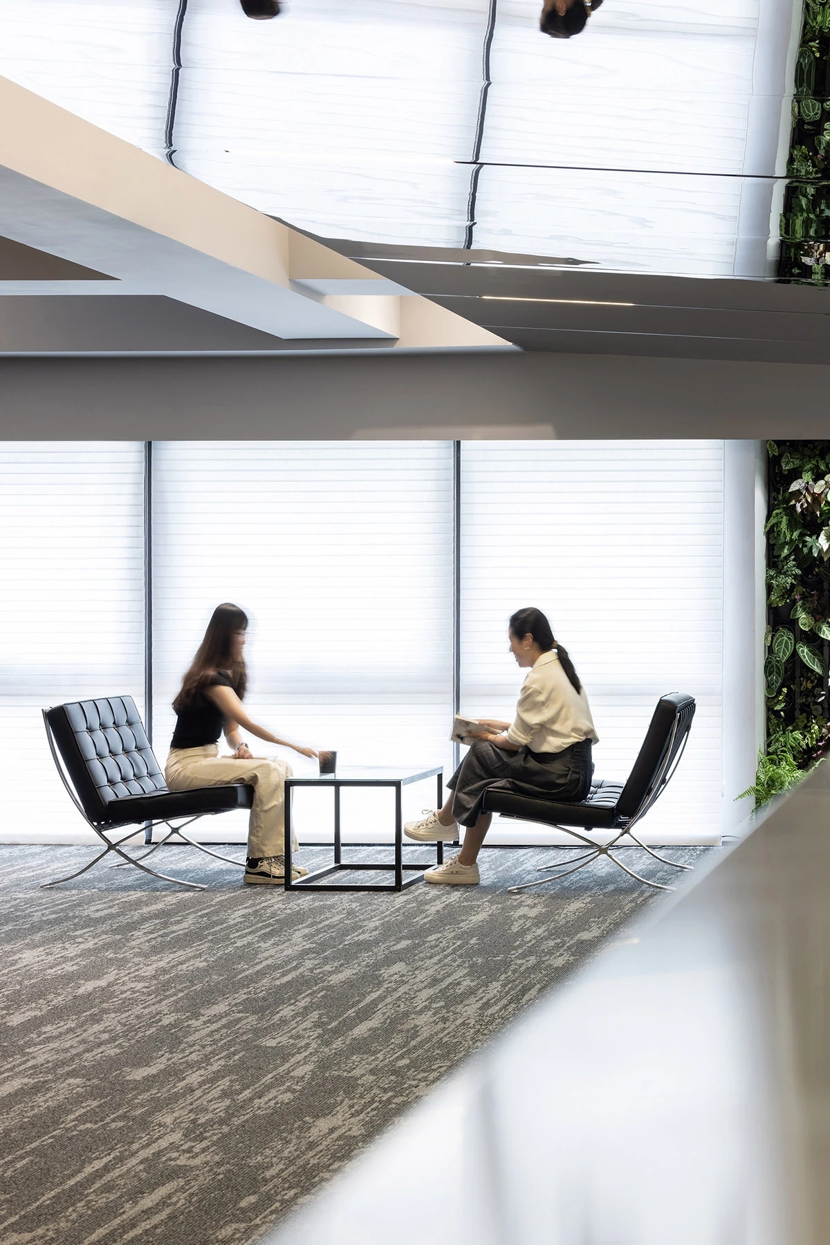 茶歇区位于二层,这里也是总部的能量中心,整体空间感十分开阔,一侧的超大落地窗引入室外的自然光线,建筑凹位的绿植墙成为清新鲜活的点缀,尽显绿意盎然。设计采用小面积的深色系,沉稳安静,搭配镜面不锈钢的天花倒影,视线形成延伸感,结合人性化的吧台和家具布局,旨在为员工和参观者提供一个放松身心、促进交流的舒适环境。