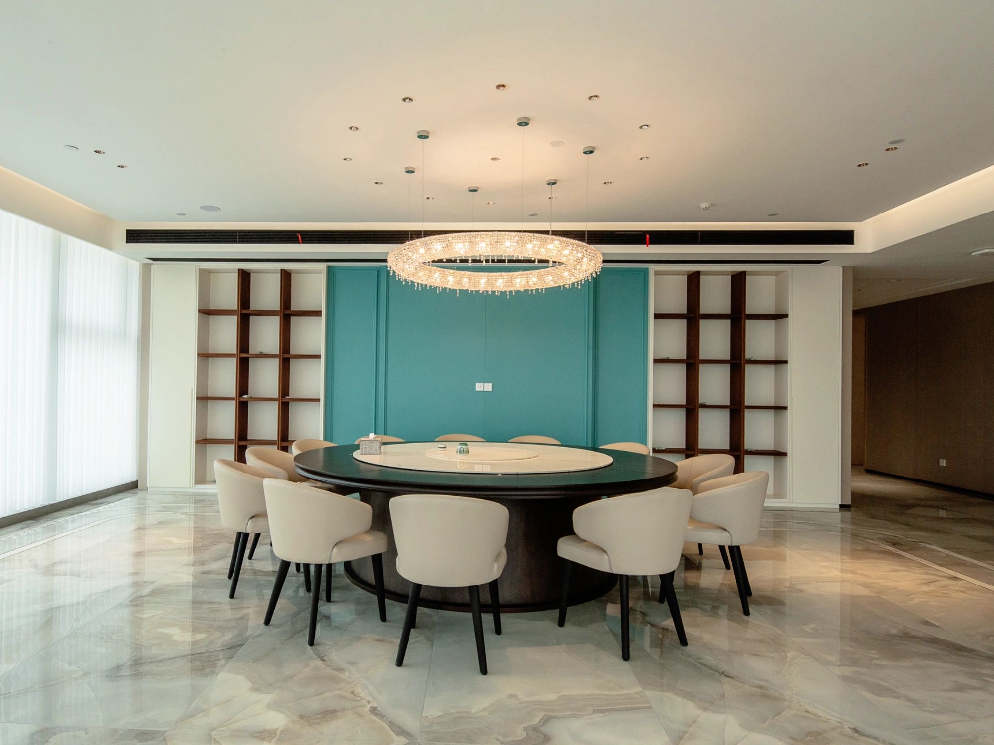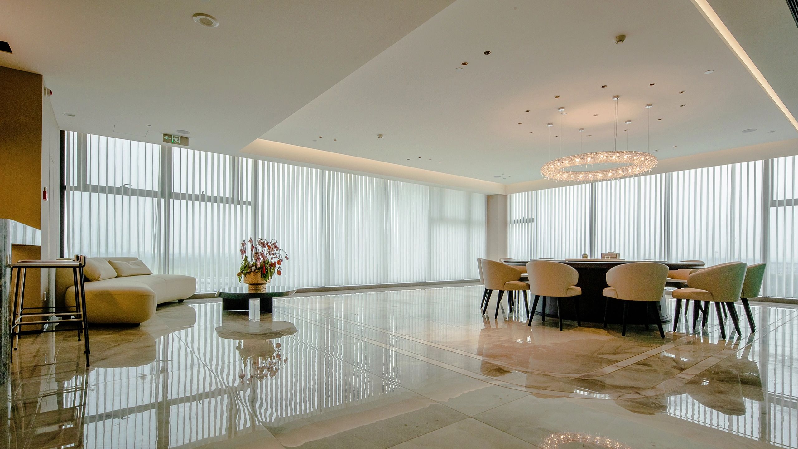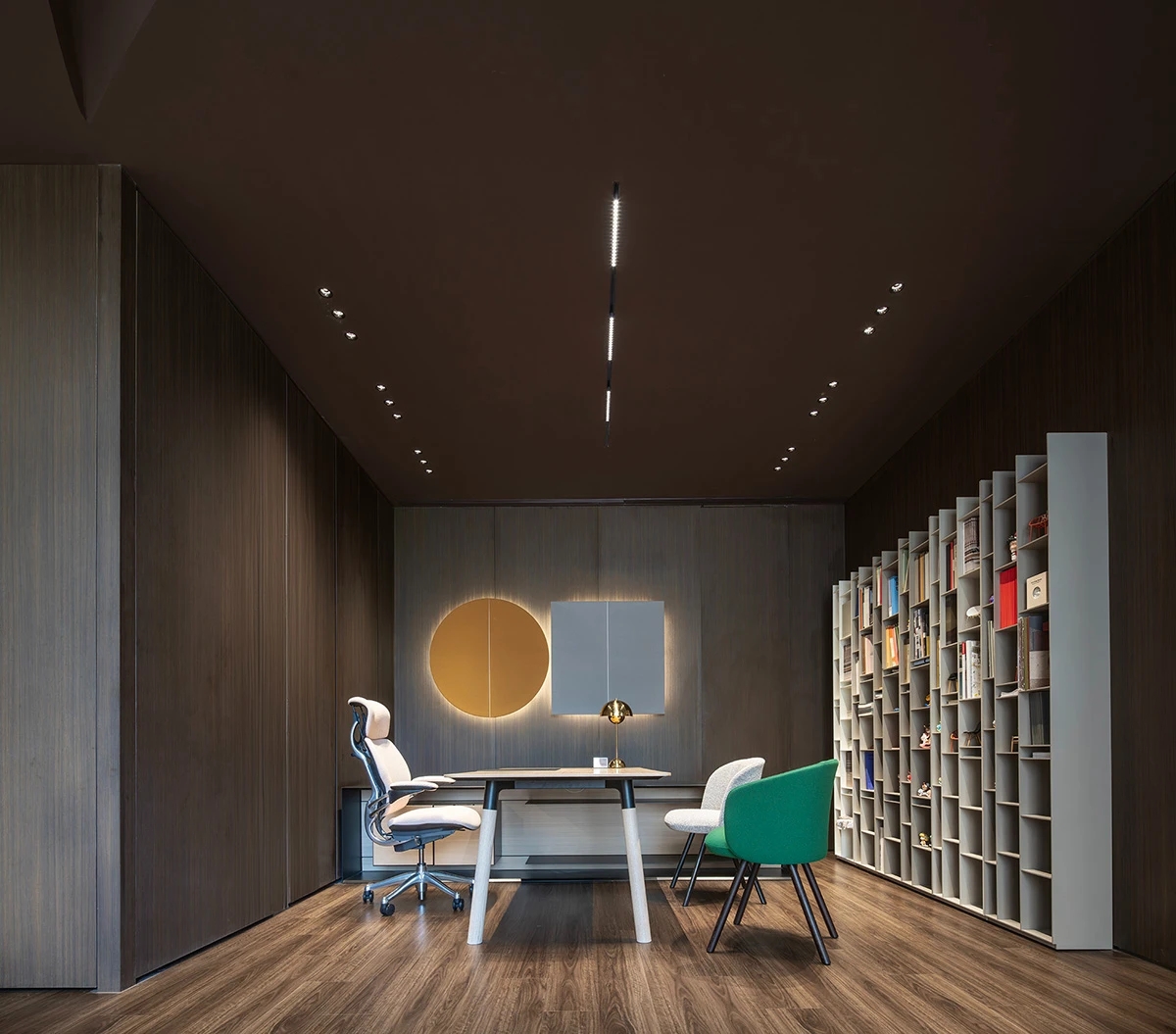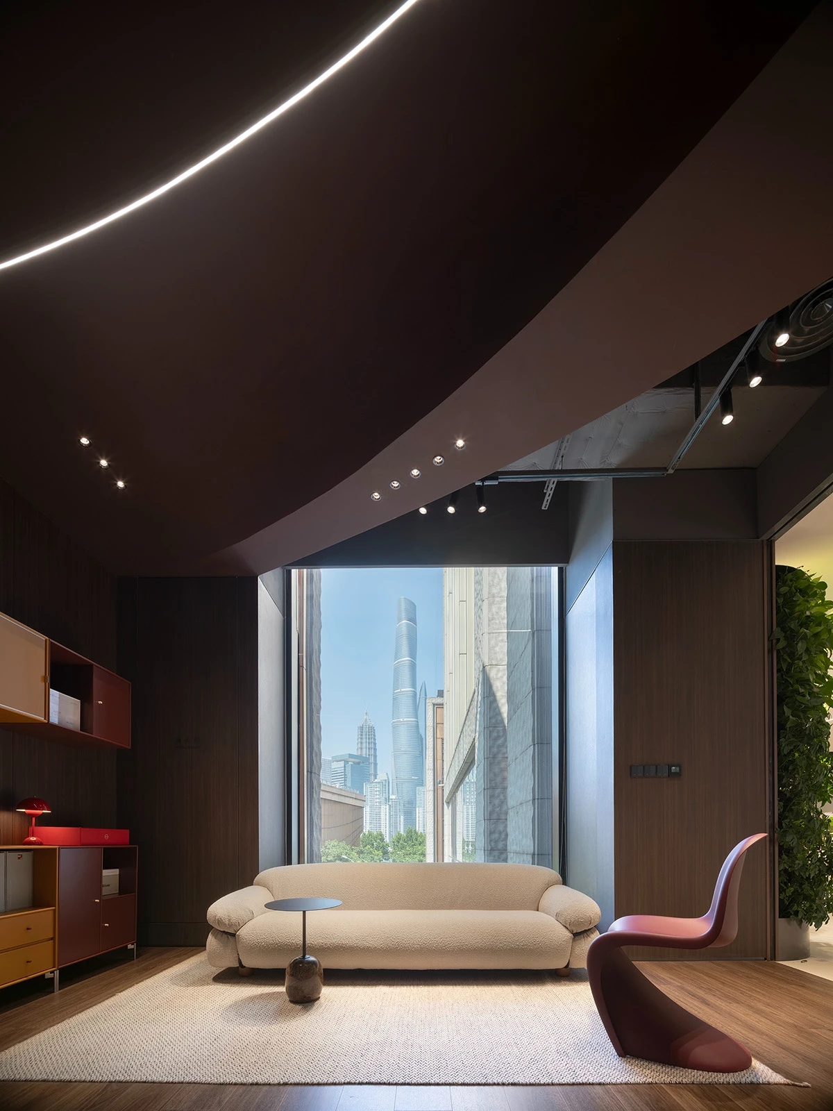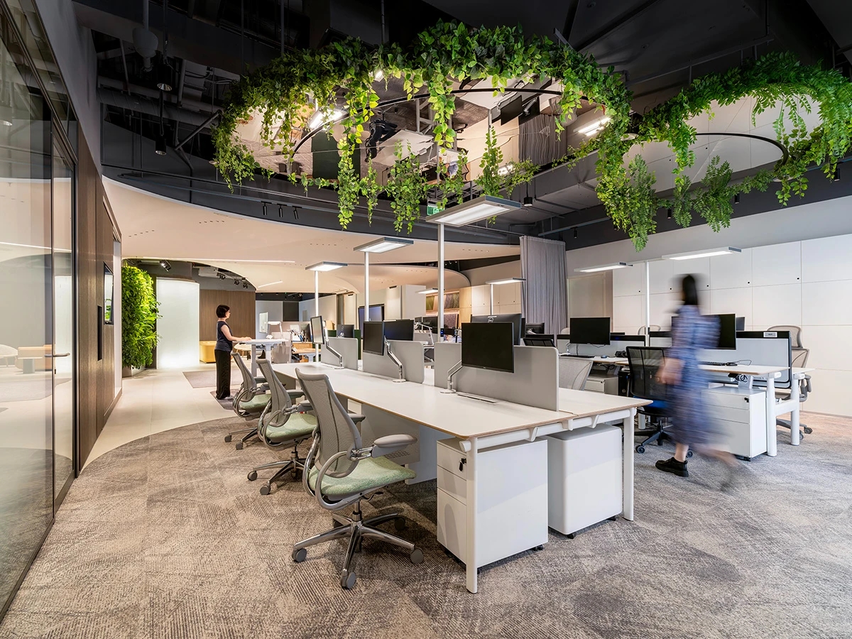 绿植造景为办公环境增添了生机,优化了空气质量,而新风与饮水系统则以科技的力量,为办公环境带来清新空气与纯净饮水,提升了办公的舒适度与健康。独立办公室以简洁大方的设计、灰白主色调,营造出一个既私密又优雅的办公氛围。这些经过精心整合的元素共同营造出创新、可持续且鼓舞人心的环境,体现了Element Plus上海展厅的精髓。