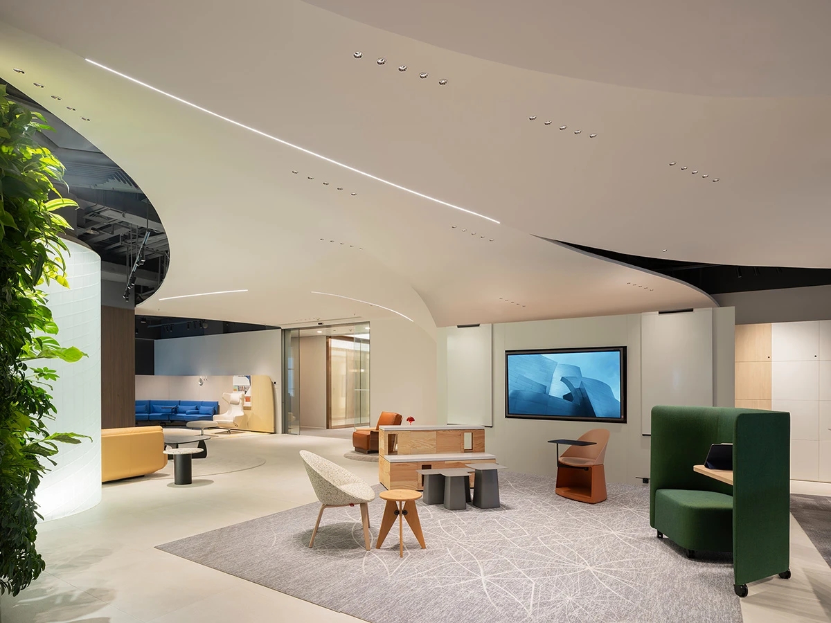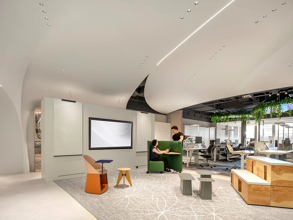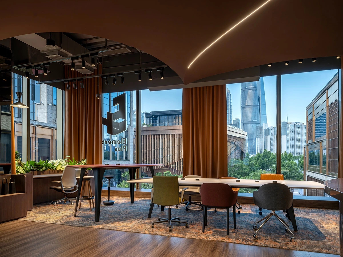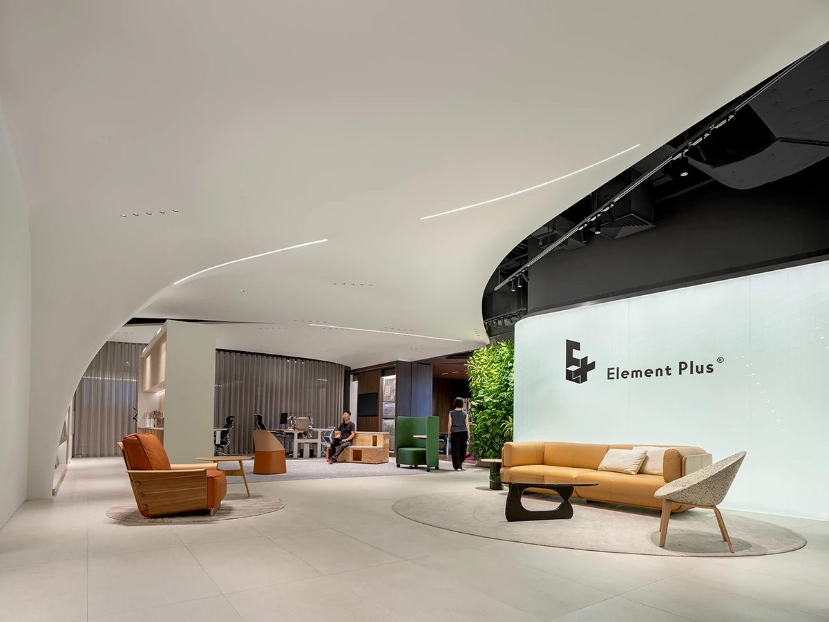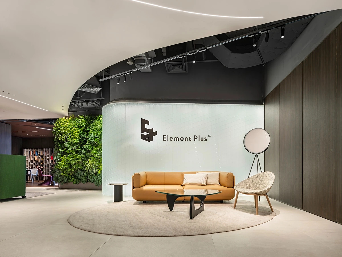 Element Plus展厅位于上海BFC,以“沉淀与希望”为设计理念,细腻地将时间的流转融入空间设计,构建起一座连接过去与未来的梦想办公空间。展厅内,业务模块如同精心编排的篇章,从家具的线条到地面的质感,从隔断的节奏到绿植的点缀,设计在每一处细节上都体现了对科技、环保与多功能设计理念的探索。在ABW办公模式的启发下,展厅的风格尝试融合复古与现代,旨在满足多元化办公需求。智能工位管理系统和移动式电源的引入,旨在为灵活办公提供便利,而人体工学椅和升降桌的关注,则是出于对员工健康与舒适的考量。地面材料利用多元化,从地砖、LVT到地毯,考虑环保、抗菌、吸音的不同功能。定制地毯在造型色彩上的创意,彰显家具的细节品质及空间的舒适氛围。隔断系统以其模块化设计和高效隔音性能,让空间布局变得更加灵活。