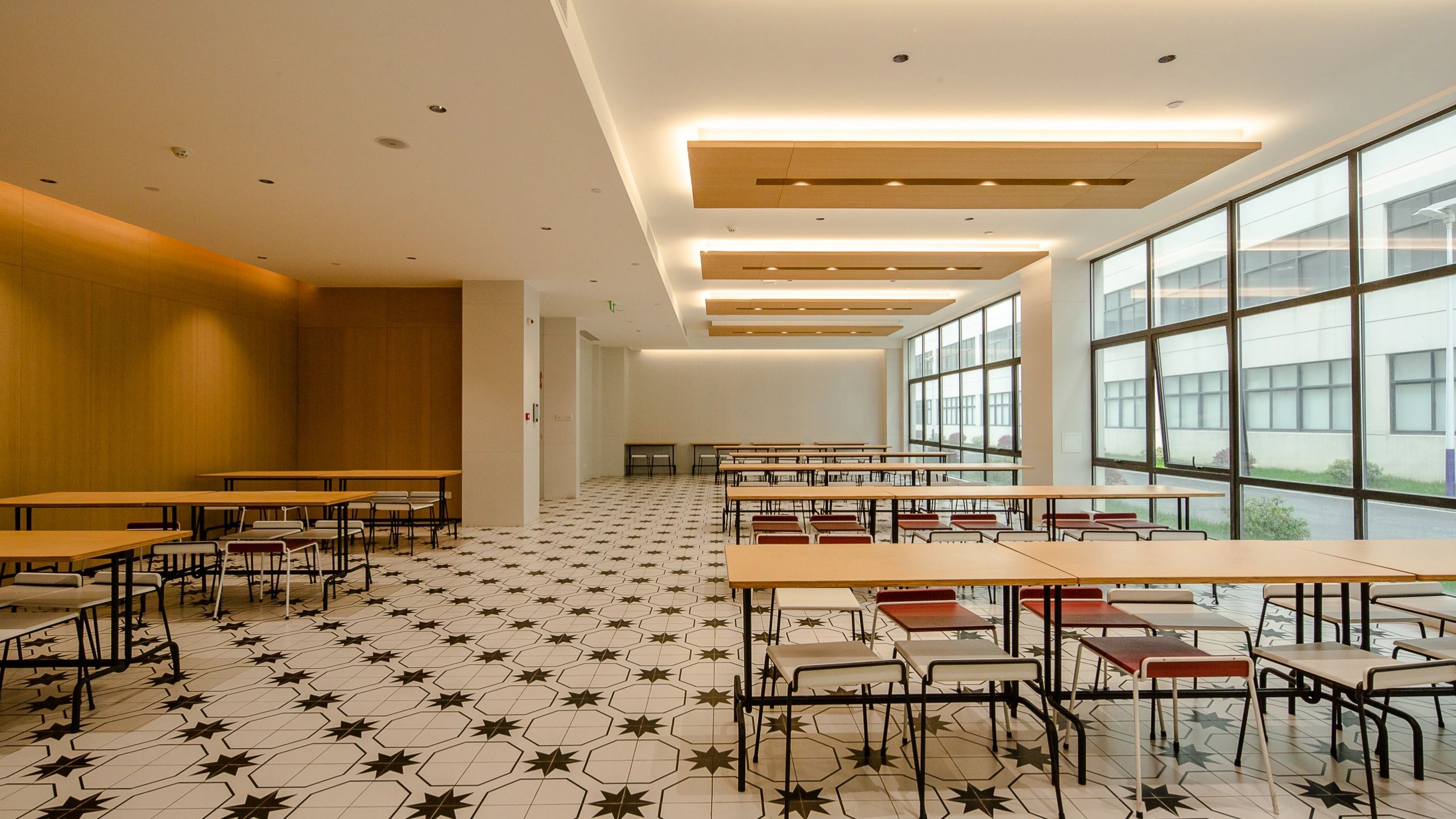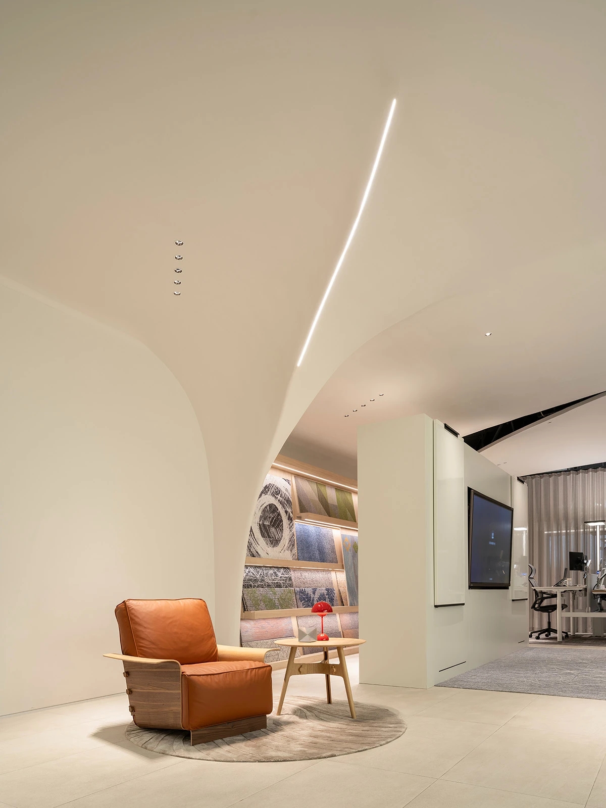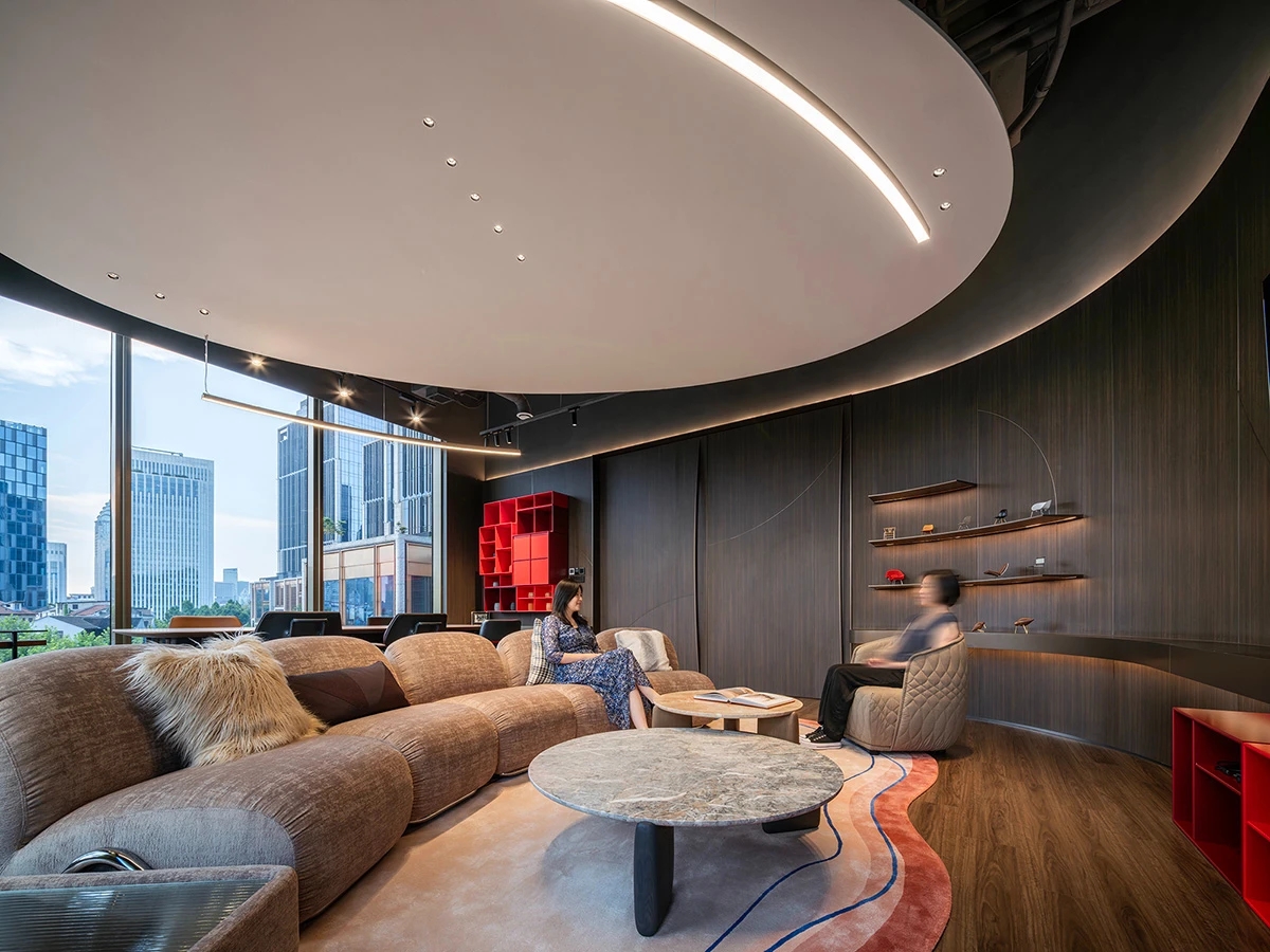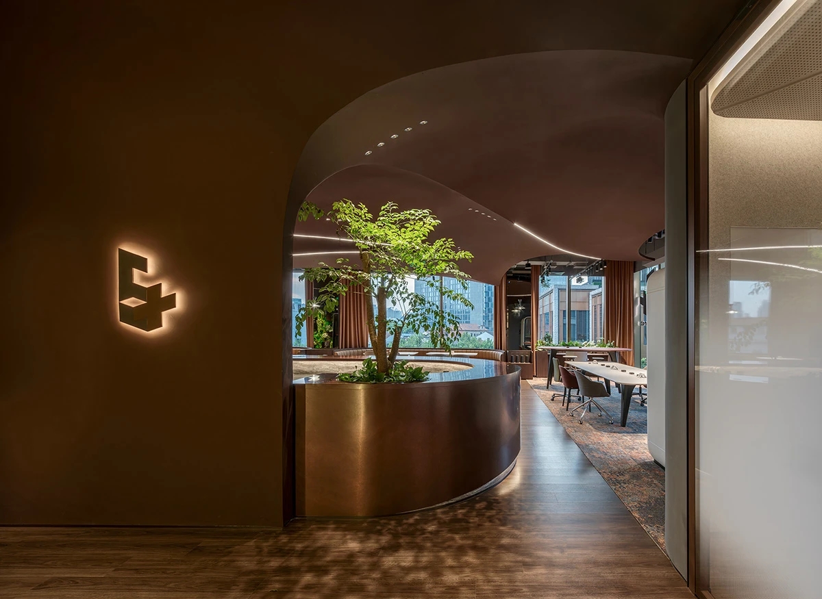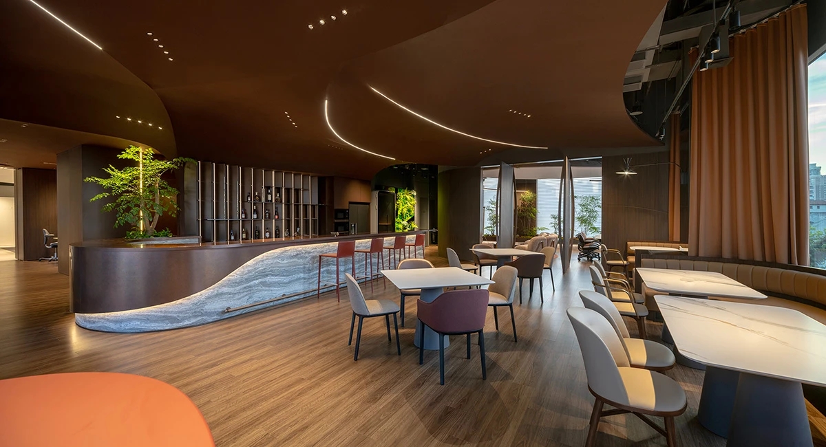Element Plus展厅位于上海BFC,以“沉淀与希望”为设计理念,细腻地将时间的流转融入空间设计,构建起一座连接过去与未来的梦想办公空间。展厅内,业务模块如同精心编排的篇章,从家具的线条到地面的质感,从隔断的节奏到绿植的点缀,设计在每一处细节上都体现了对科技、环保与多功能设计理念的探索。在ABW办公模式的启发下,展厅的风格尝试融合复古与现代,旨在满足多元化办公需求。智能工位管理系统和移动式电源的引入,旨在为灵活办公提供便利,而人体工学椅和升降桌的关注,则是出于对员工健康与舒适的考量。地面材料利用多元化,从地砖、LVT到地毯,考虑环保、抗菌、吸音的不同功能。定制地毯在造型色彩上的创意,彰显家具的细节品质及空间的舒适氛围。隔断系统以其模块化设计和高效隔音性能,让空间布局变得更加灵活。