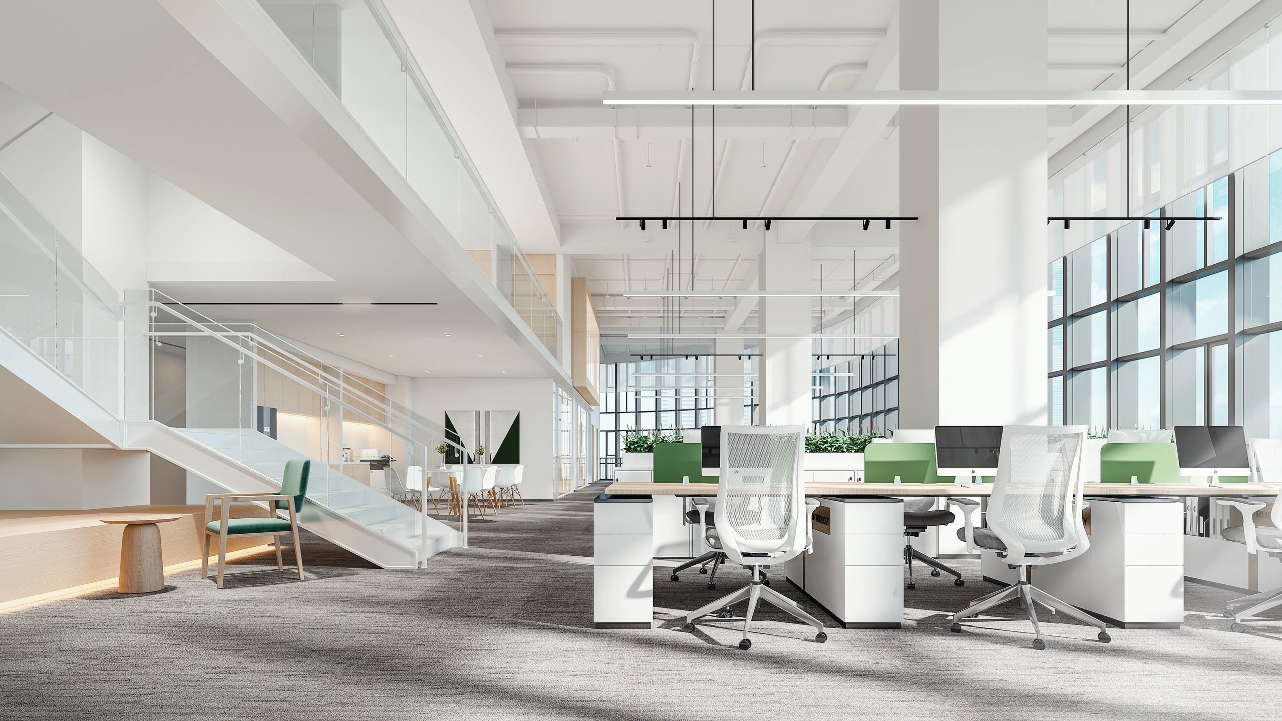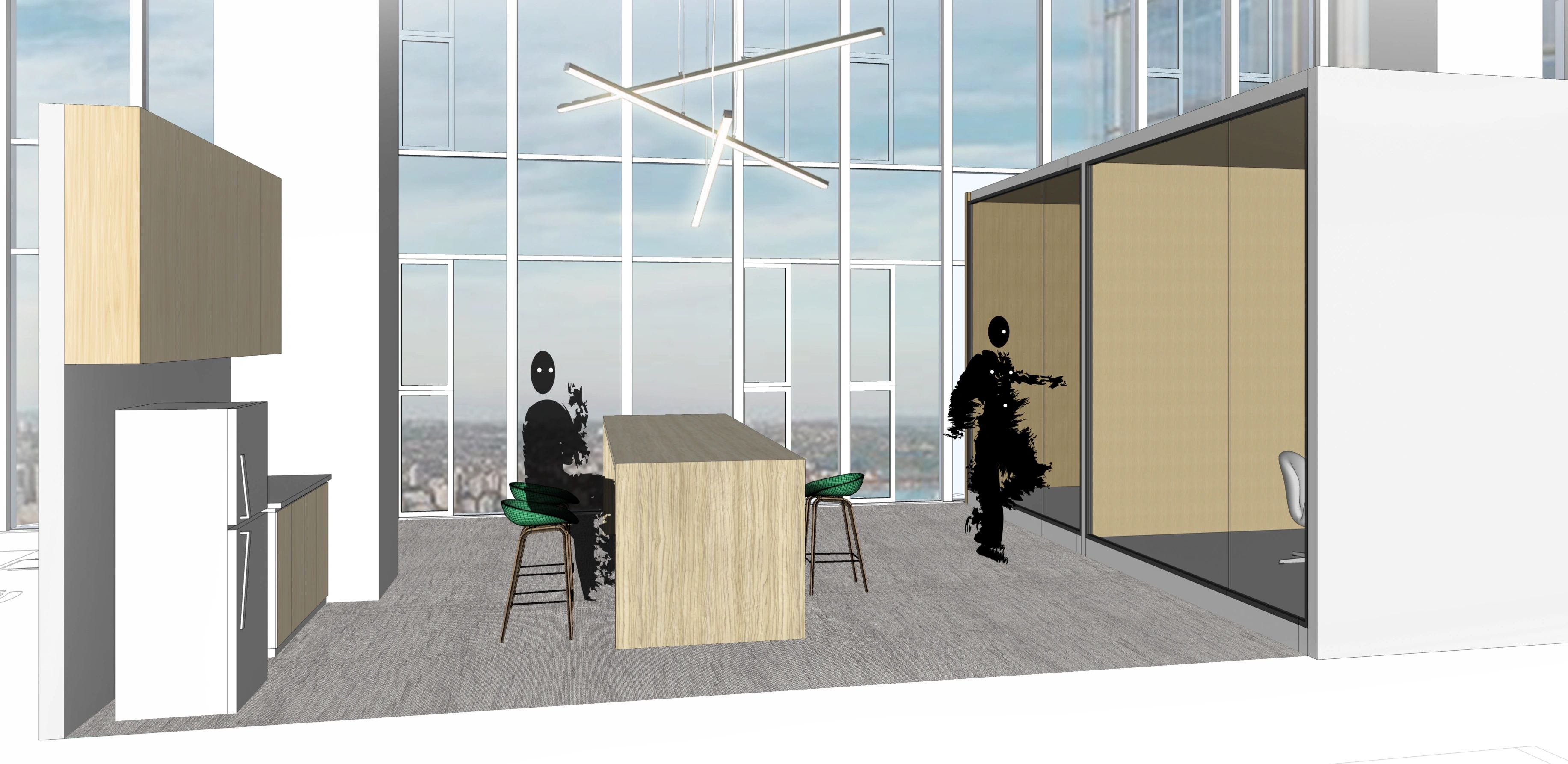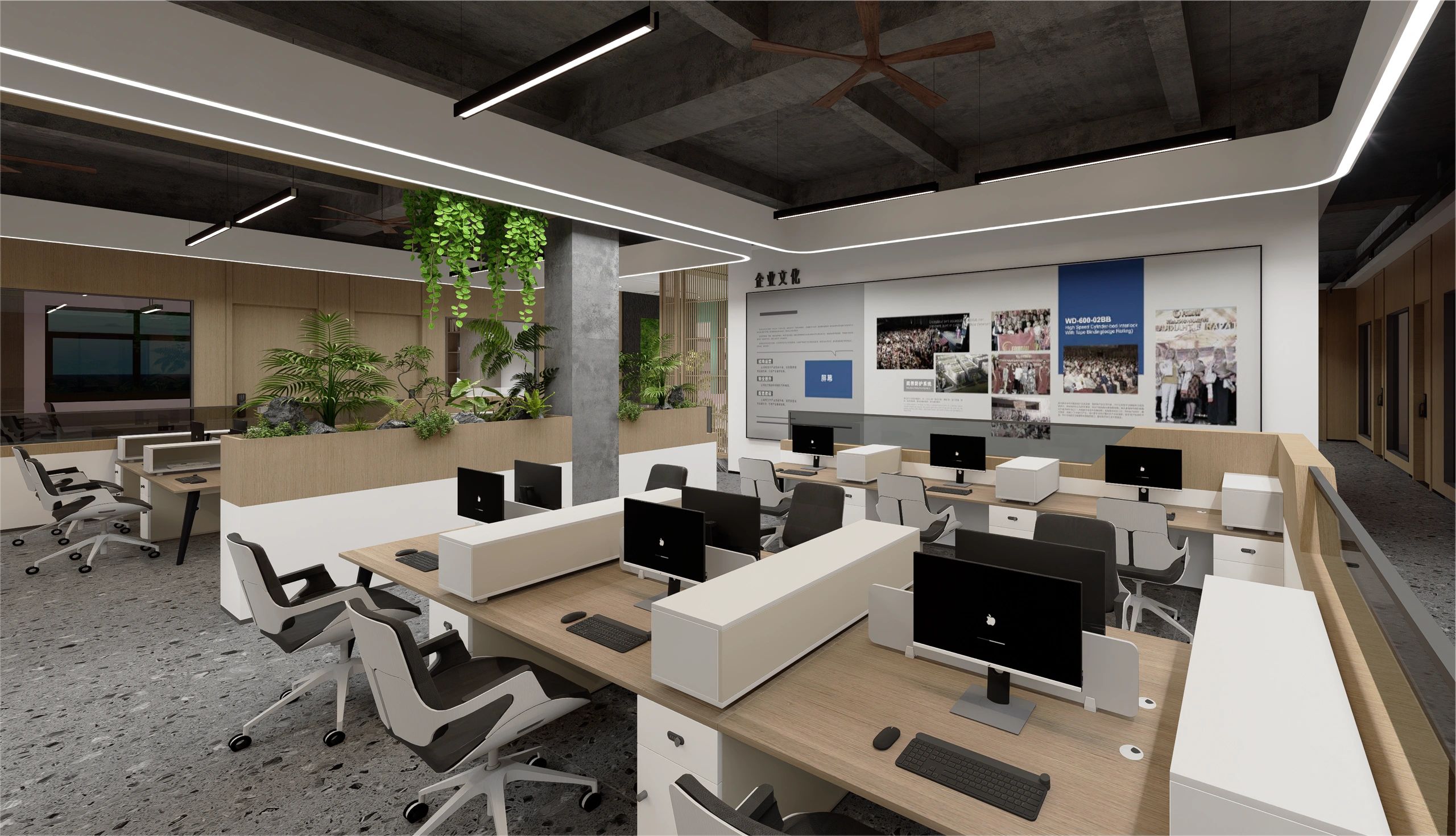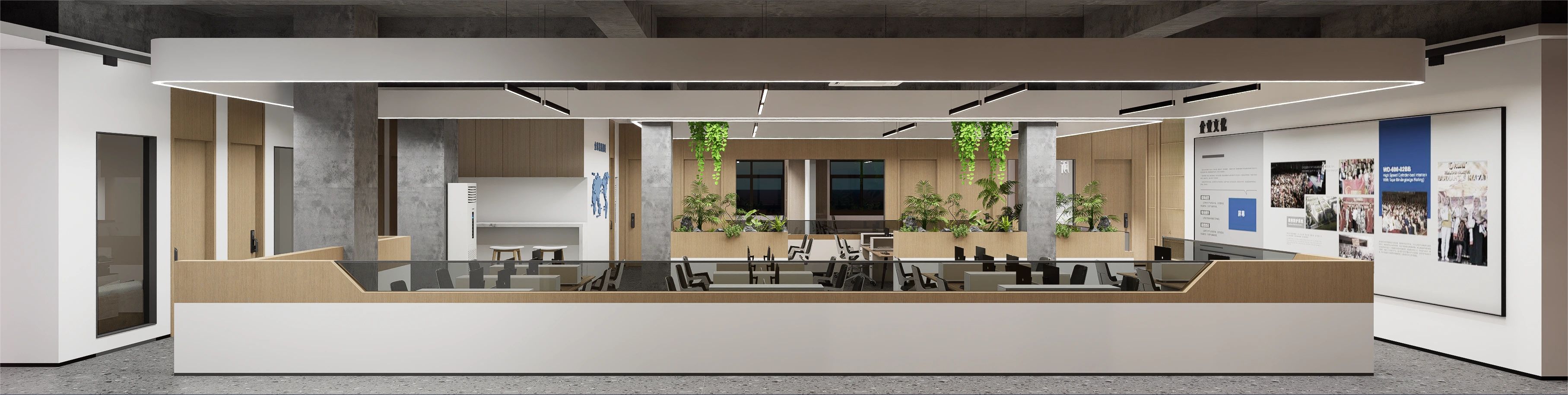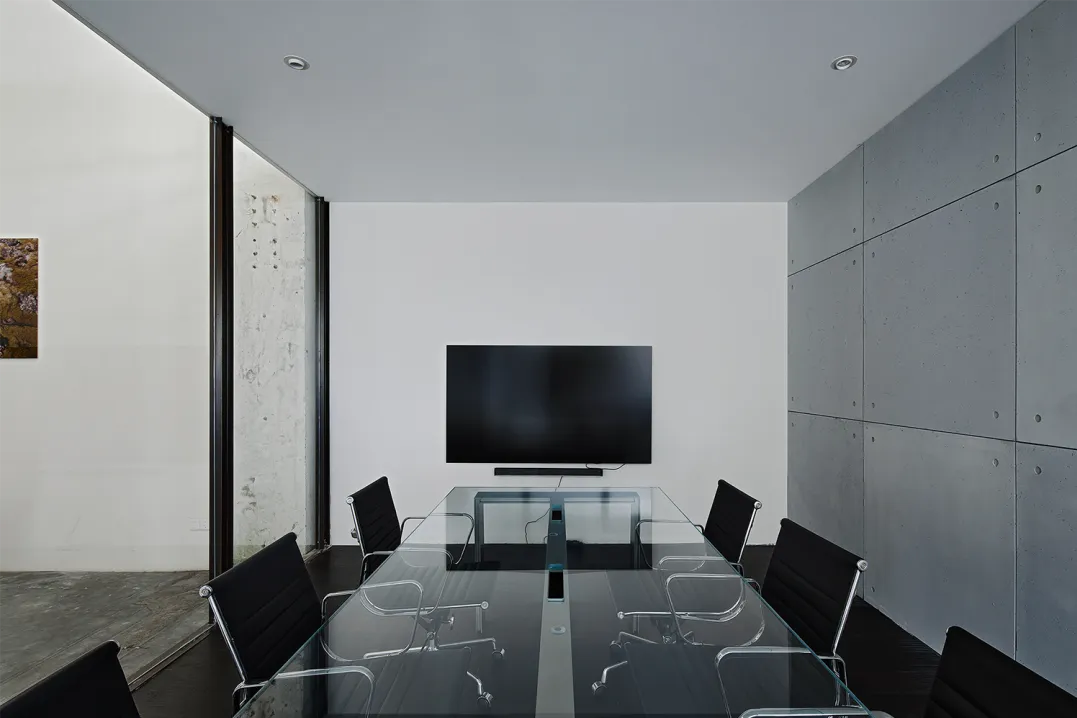 隔墙以清水混凝土板装挂,内置一扇树瘤木口袋移门,拉开可作为隔断,围合多个空间,收起时引入自然天光,形成通透视野。“Unknown design”发光字样的背后,将是工作室的灵感创作地。办公区遵循去繁从简原则,我们铲除梁架天花及部分墙面抹灰,留下粗糙的刮擦痕迹,管线沿梁柱之间交错搭接,富有旧工业美感的原始框架,化身承载工作室日常的空间容器。长达6米的不锈钢长桌,可容纳多人共享办公,与银灰冷调的金属灯具搭配得宜。工字钢骨架搭建起后区隔断,表面以乱纹不锈钢拼接软木饰面,用于张贴展示设计图纸。整面开放式USM模块立架与之齐平,材料小样有序摆放其间,呼应场地的工业特质。