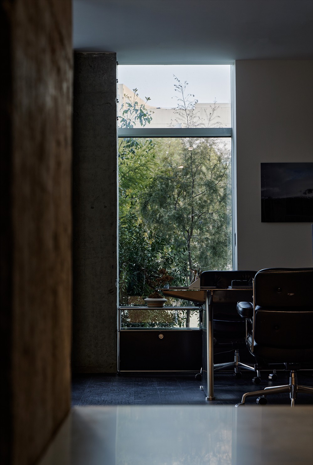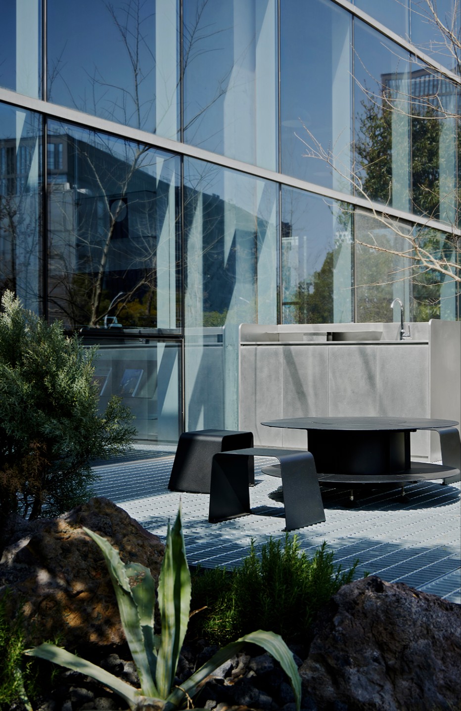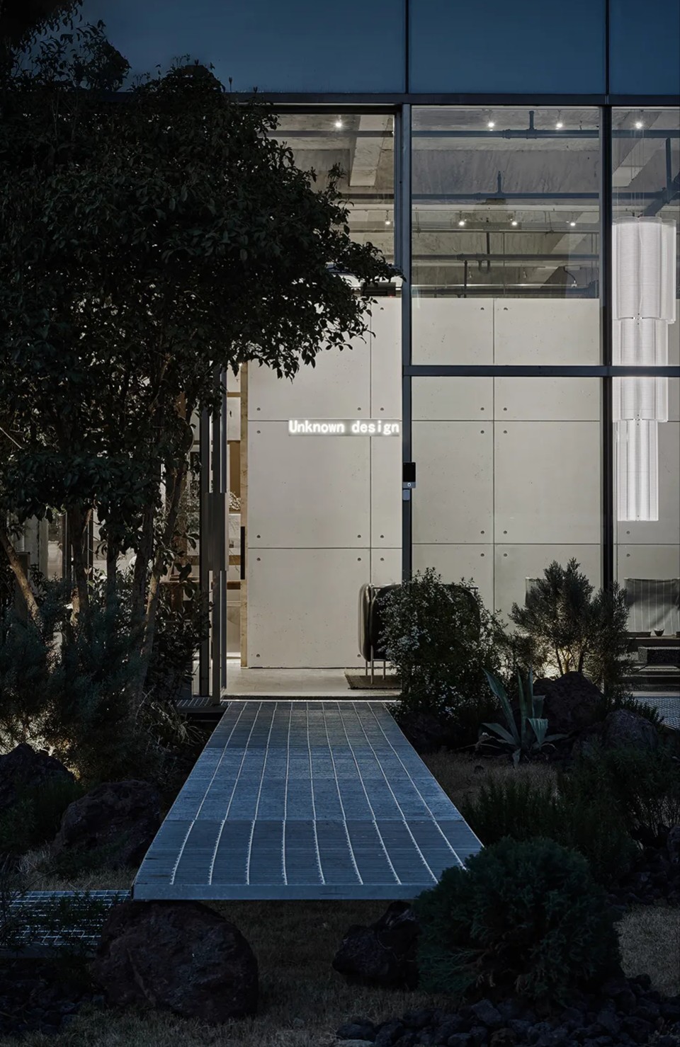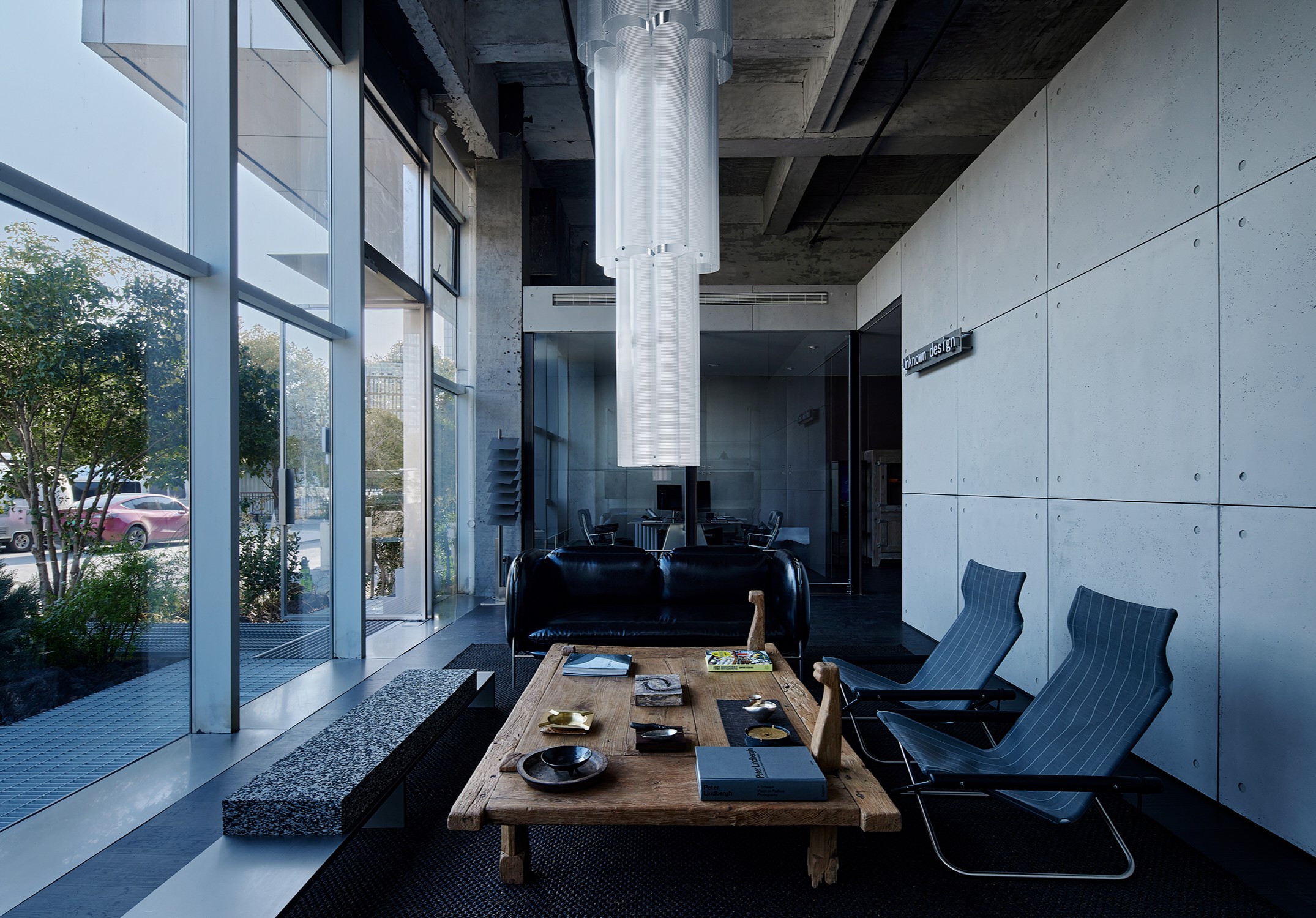 庭院向外敞开,植物搭配景观石散落其间,形成柔性边界(Flexible Boundaries),引入自然语境,道路界面选用架空铺设的金属格栅板,以降低对地景的干扰。平面采用开放式空间布局,会客室和主理人办公室设置于南侧,大片落地玻璃窗,框入流转的窗外视野。地面高差将空间前后区隔,结合吊顶,压低纵向尺度,消解“盒子”体块的单调格局。白色花灯垂挂而下,老式柚木茶几、皮革沙发、再生海绵的色调纹理——平衡了建筑结构的几何线条,带来折衷意趣。由Unknown团队独立设计的多功能杂志墙,安装于会客区一侧,玻璃层板和金属搁架的数量及高度均可根据需要调整。