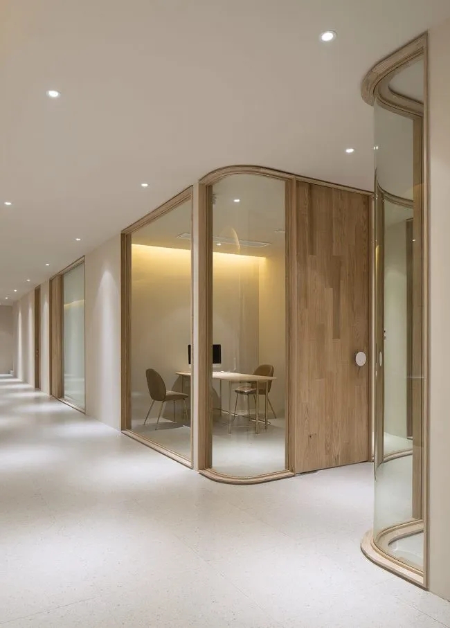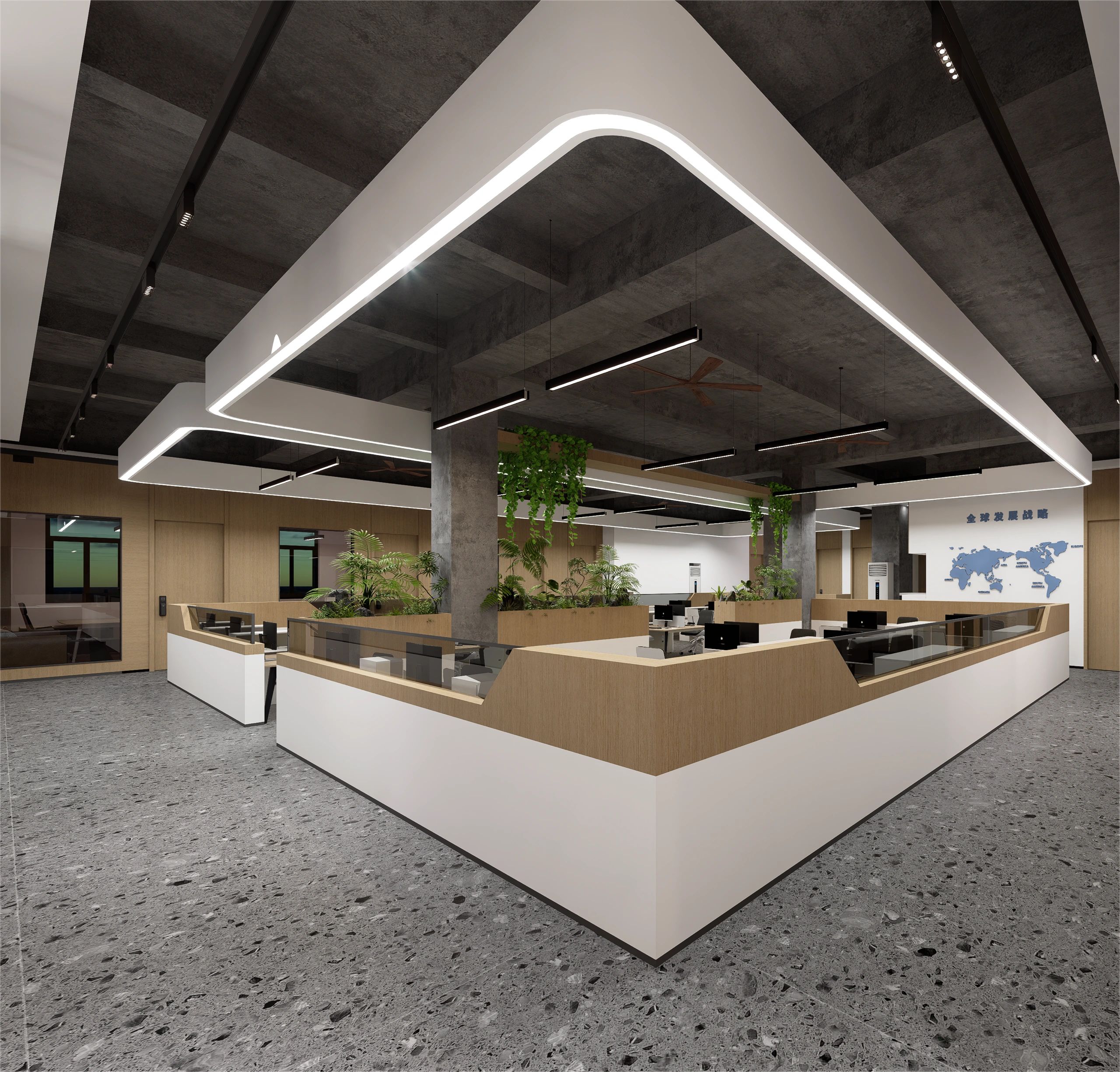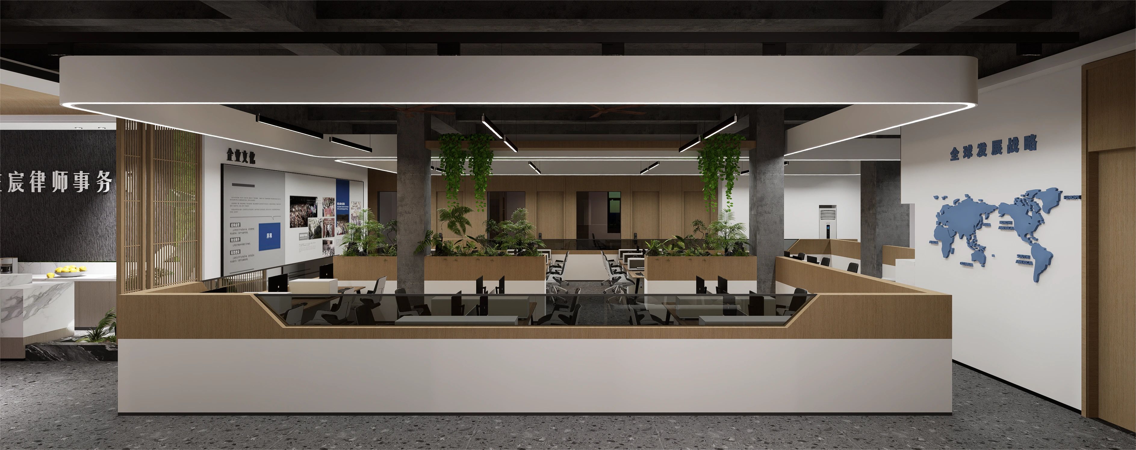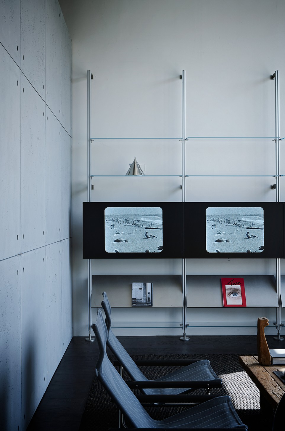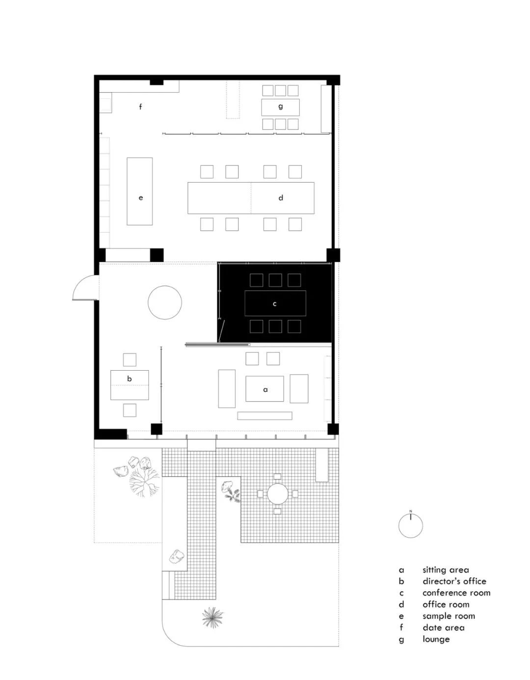 庭院向外敞开,植物搭配景观石散落其间,形成柔性边界(Flexible Boundaries),引入自然语境,道路界面选用架空铺设的金属格栅板,以降低对地景的干扰。平面采用开放式空间布局,会客室和主理人办公室设置于南侧,大片落地玻璃窗,框入流转的窗外视野。地面高差将空间前后区隔,结合吊顶,压低纵向尺度,消解“盒子”体块的单调格局。白色花灯垂挂而下,老式柚木茶几、皮革沙发、再生海绵的色调纹理——平衡了建筑结构的几何线条,带来折衷意趣。由Unknown团队独立设计的多功能杂志墙,安装于会客区一侧,玻璃层板和金属搁架的数量及高度均可根据需要调整。
