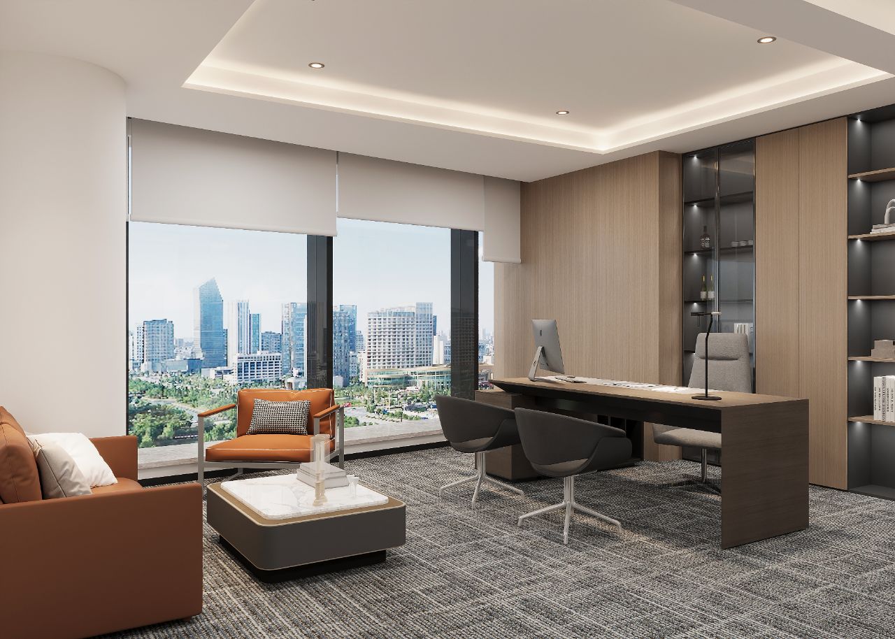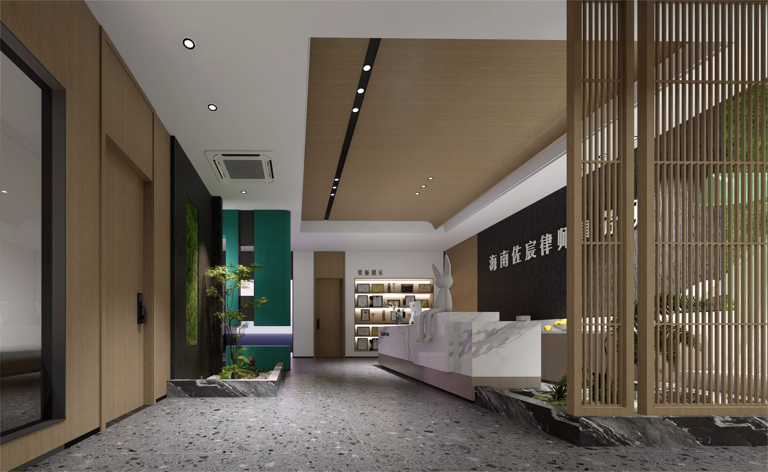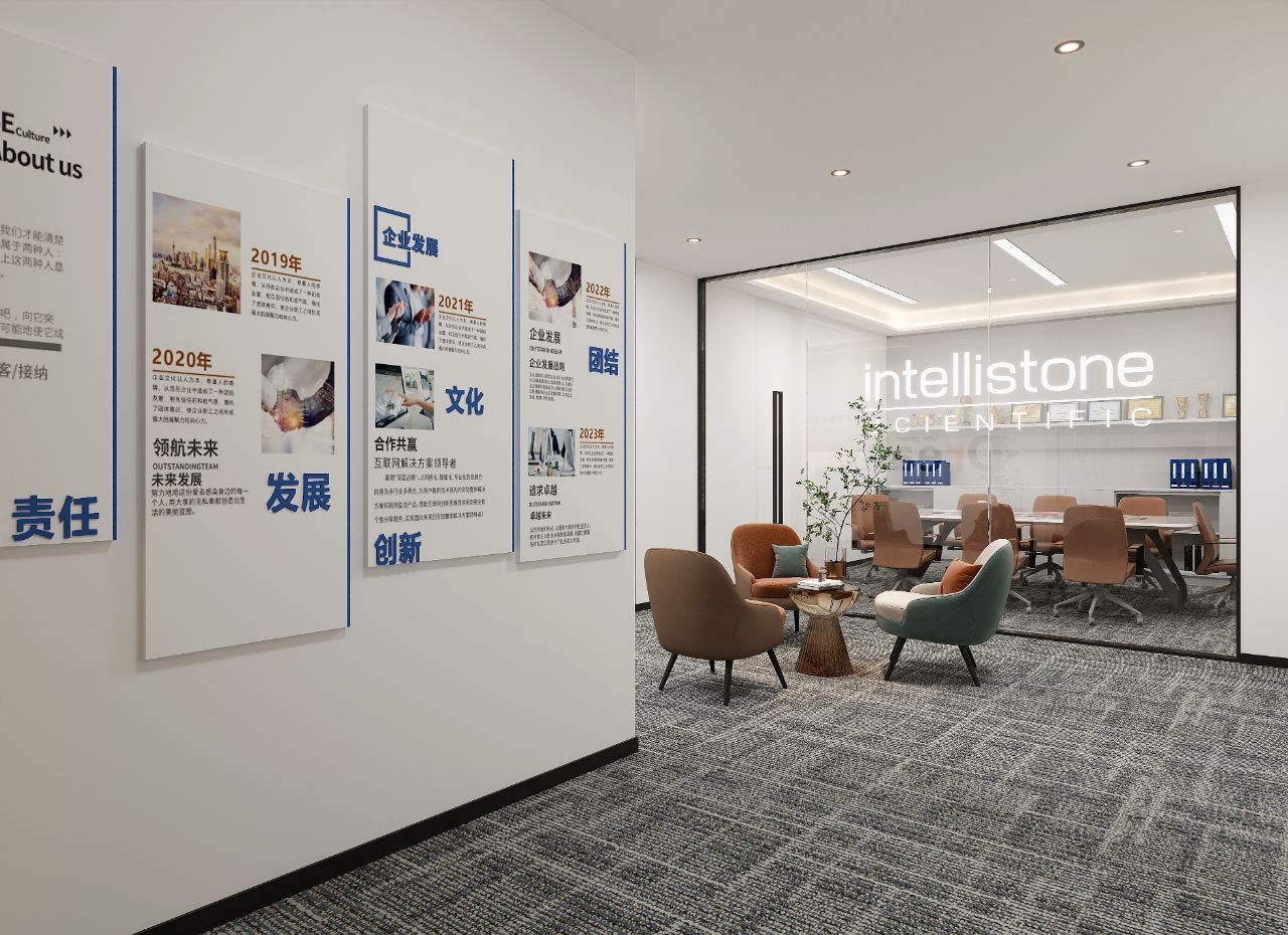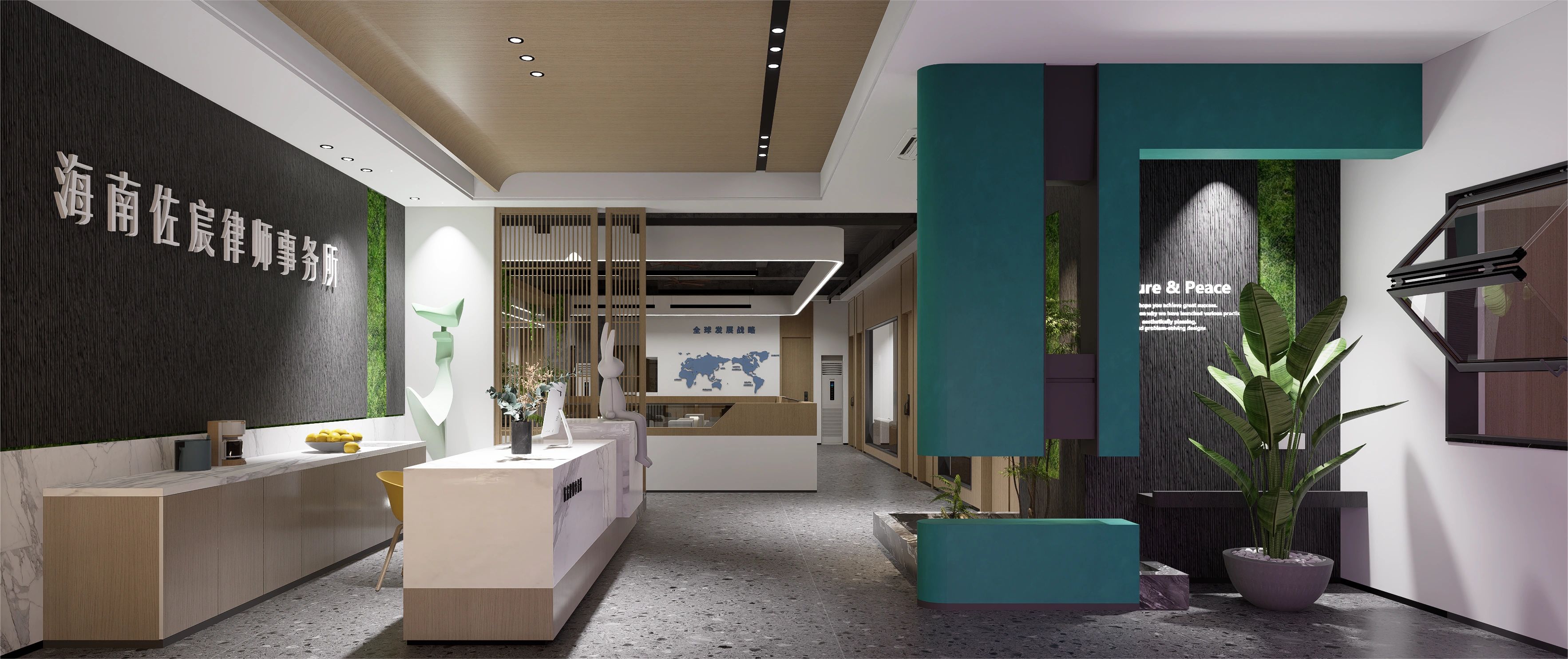 庭院向外敞开,植物搭配景观石散落其间,形成柔性边界(Flexible Boundaries),引入自然语境,道路界面选用架空铺设的金属格栅板,以降低对地景的干扰。平面采用开放式空间布局,会客室和主理人办公室设置于南侧,大片落地玻璃窗,框入流转的窗外视野。地面高差将空间前后区隔,结合吊顶,压低纵向尺度,消解“盒子”体块的单调格局。白色花灯垂挂而下,老式柚木茶几、皮革沙发、再生海绵的色调纹理——平衡了建筑结构的几何线条,带来折衷意趣。由Unknown团队独立设计的多功能杂志墙,安装于会客区一侧,玻璃层板和金属搁架的数量及高度均可根据需要调整。