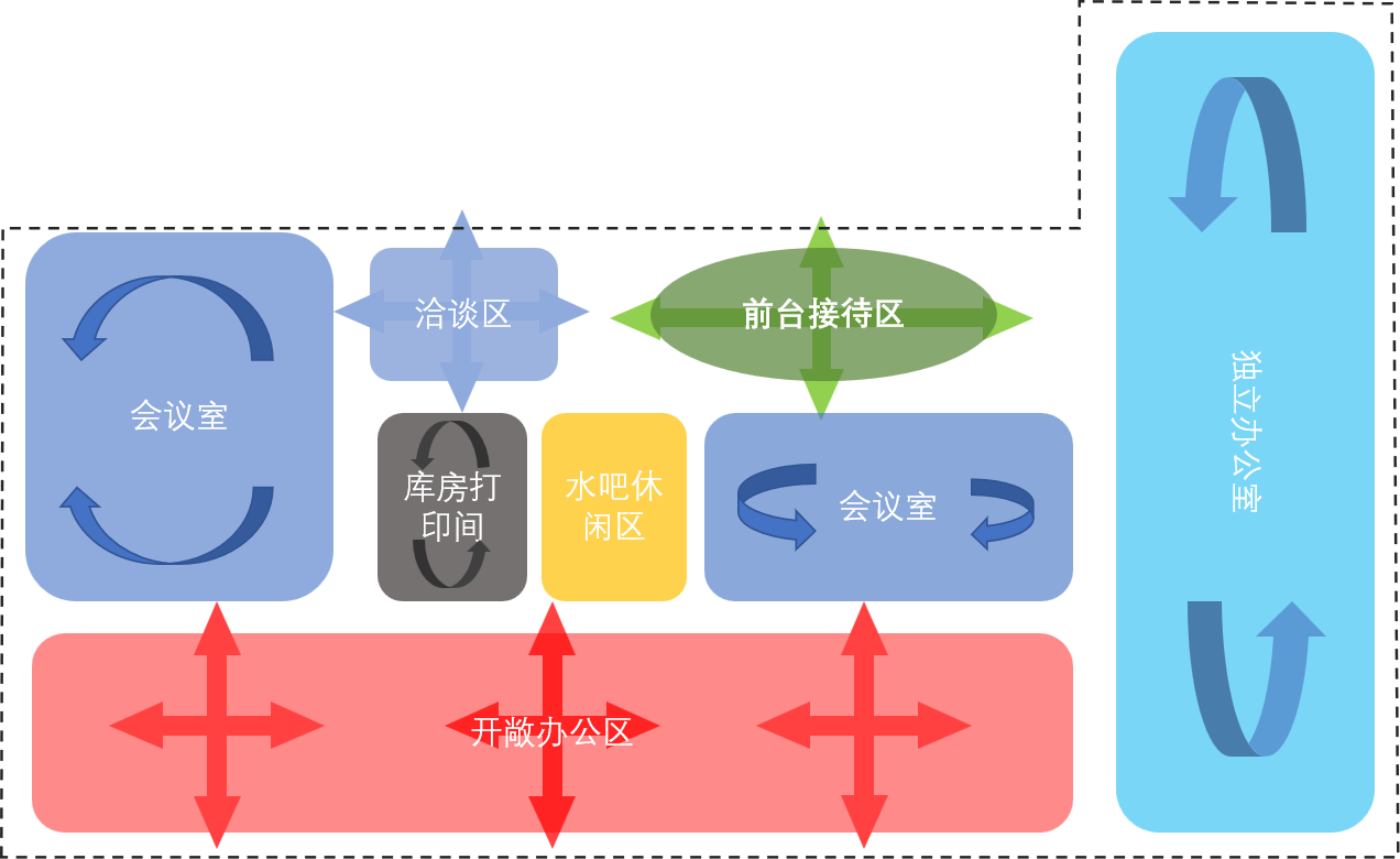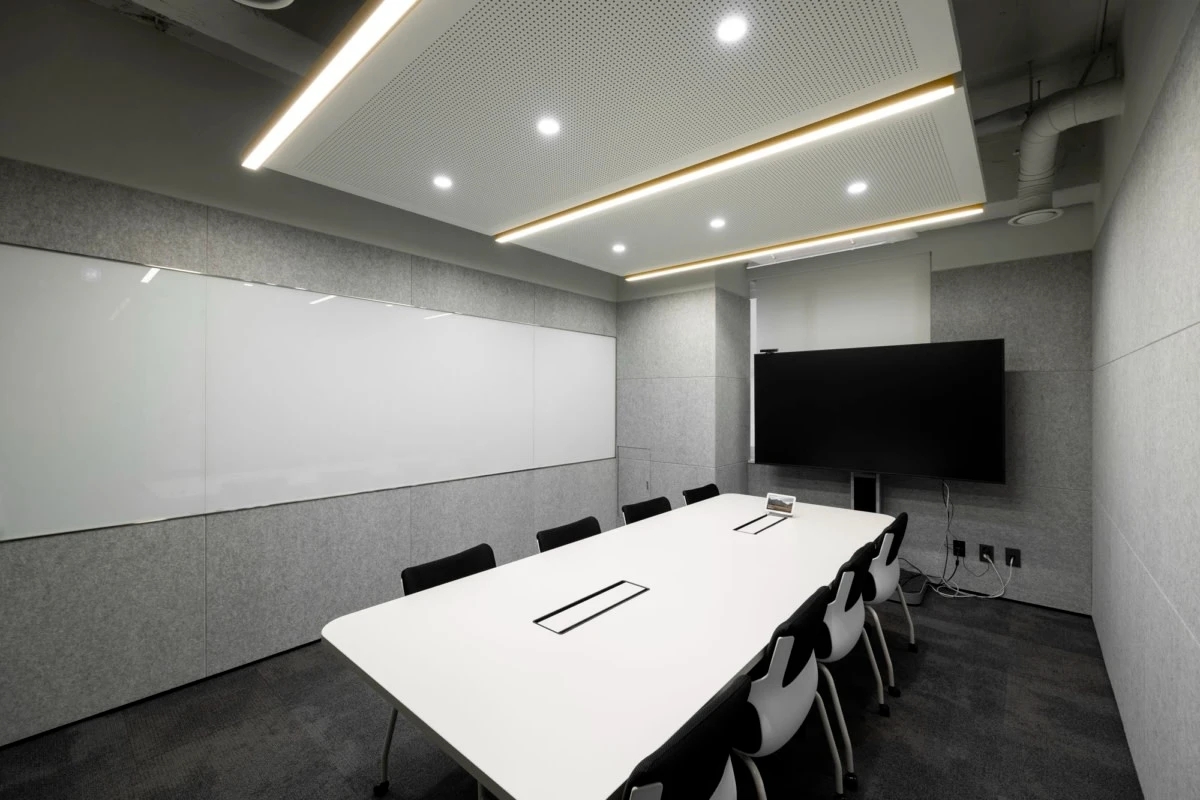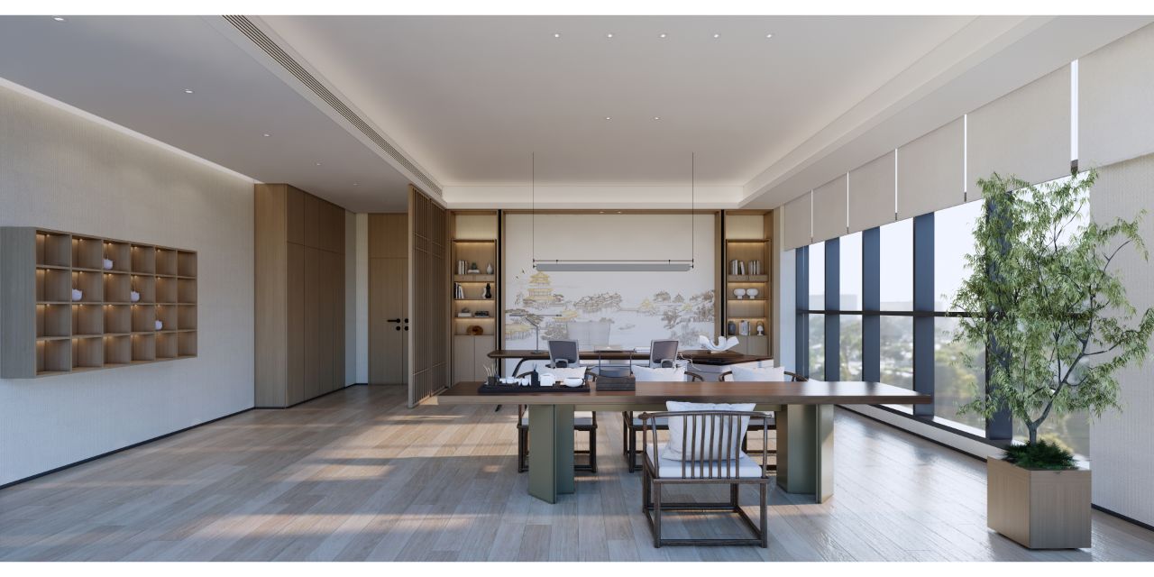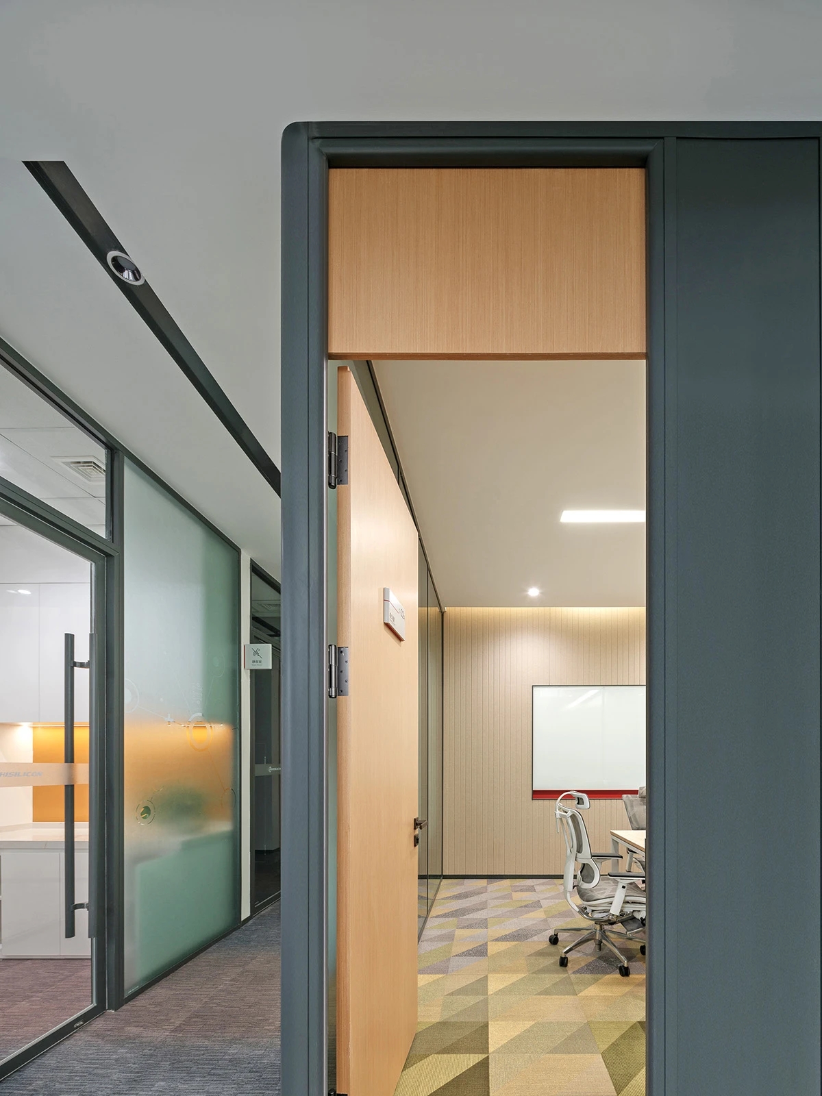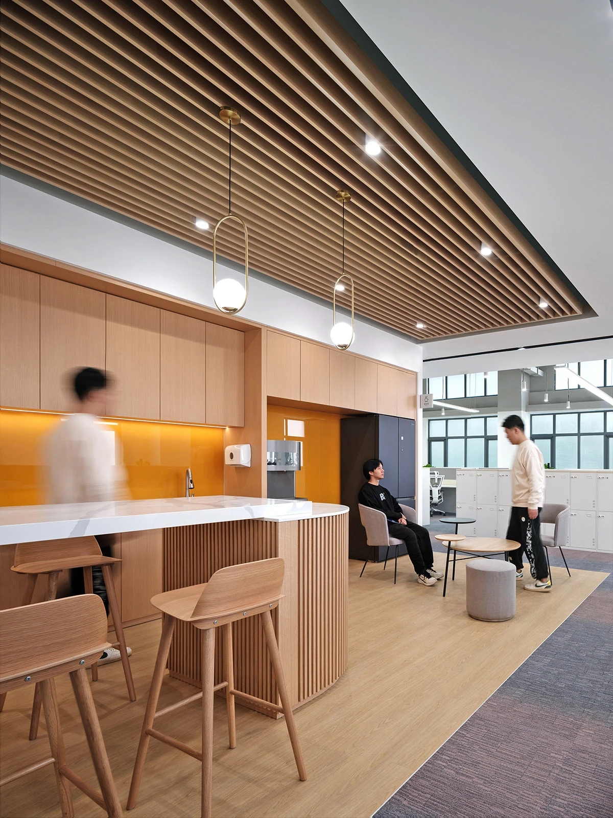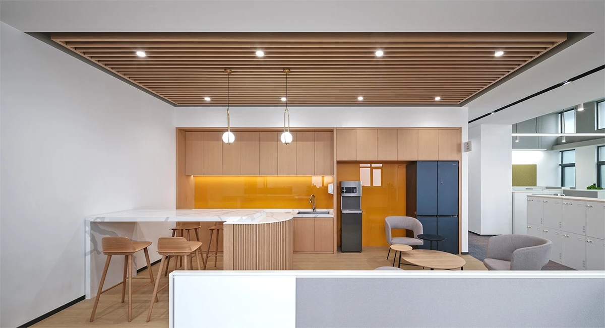 茶歇空间是员工日常聚集的空间,也是能激发交流创造的核心场所。靠墙一侧储物柜色调上选择自然干净的原木色,中间几处跳脱的橙色艺术涂料,营造一种温暖、轻松、有序的氛围空间。在保证了足够的储物空间以收纳或陈设设备外,还预留了放置饮水机、冰箱的位置。