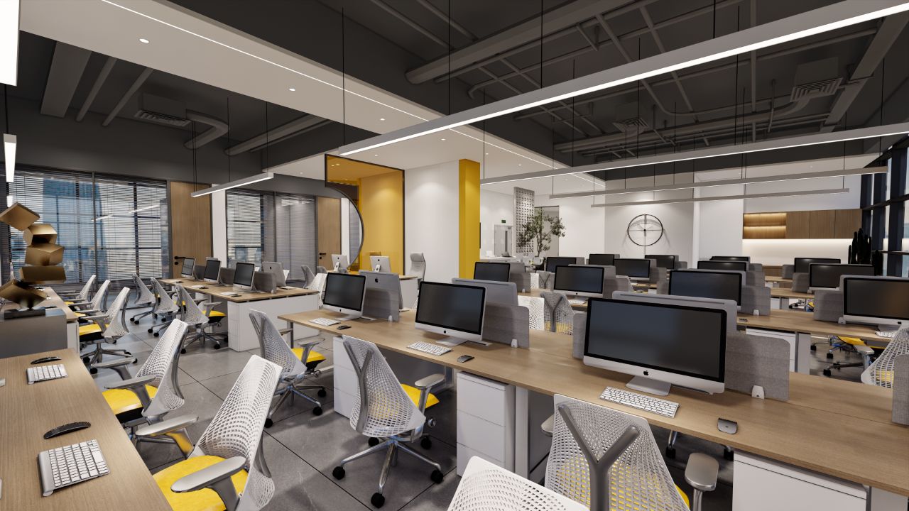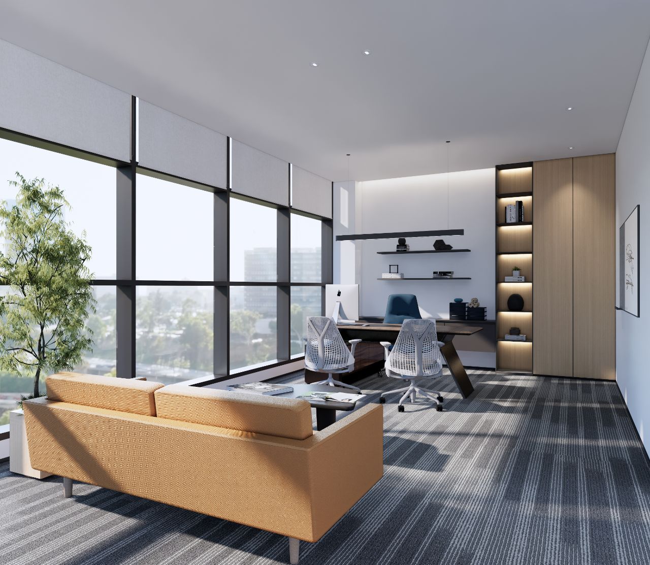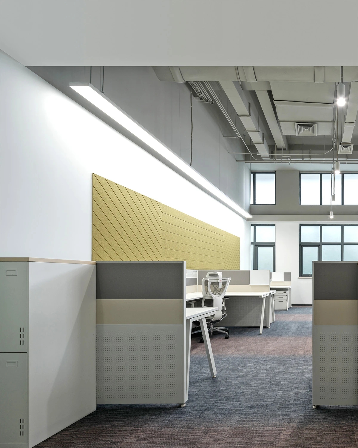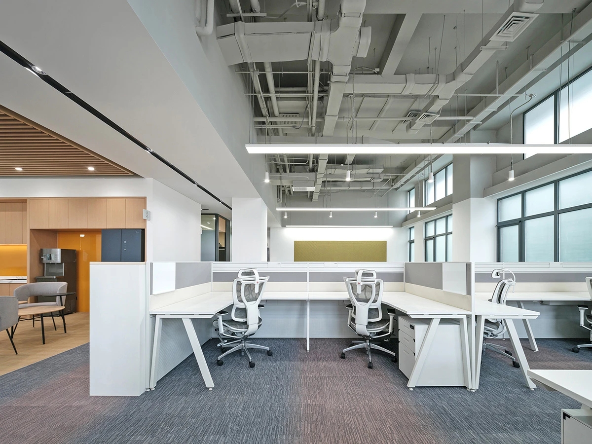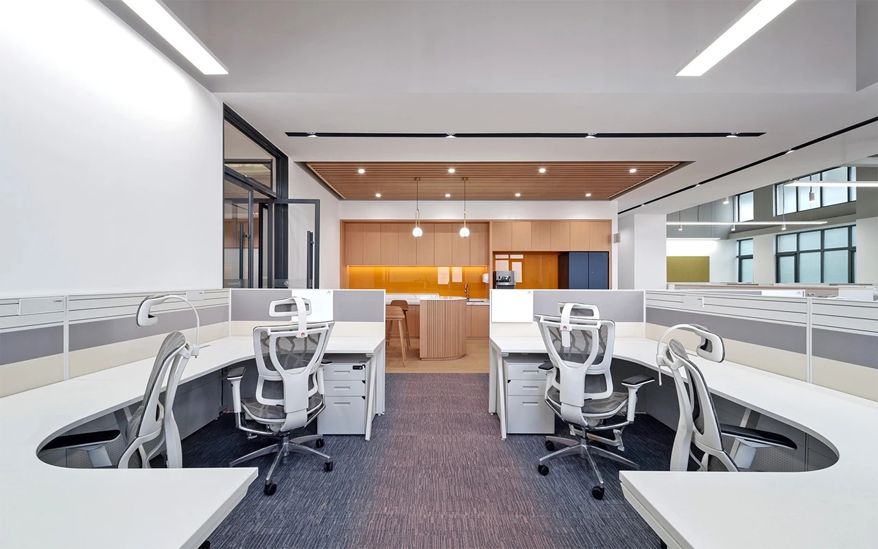 开敞办公空间运用简约、当代的手法布局,通过有序的块面,打造一个流动的空间。简约的米白色办公桌椅、白色乳胶漆墙面和灰色地毯搭配,避免了空间的单调。材料、灯光、办公家具的对比搭配,给人轻松愉悦的使用体验。