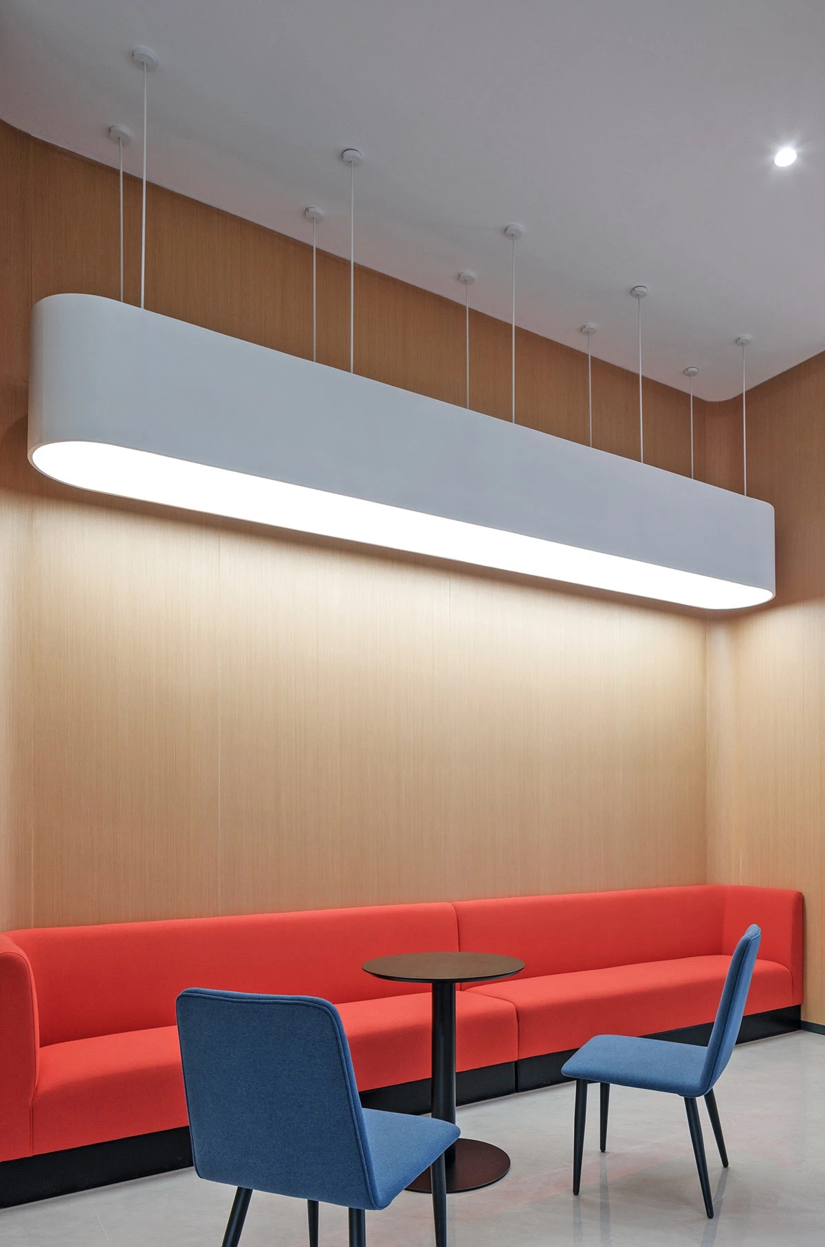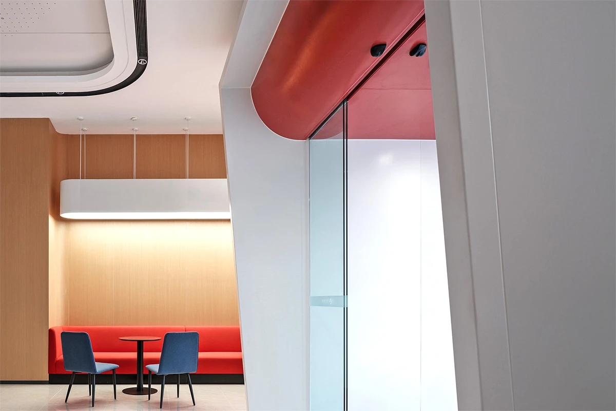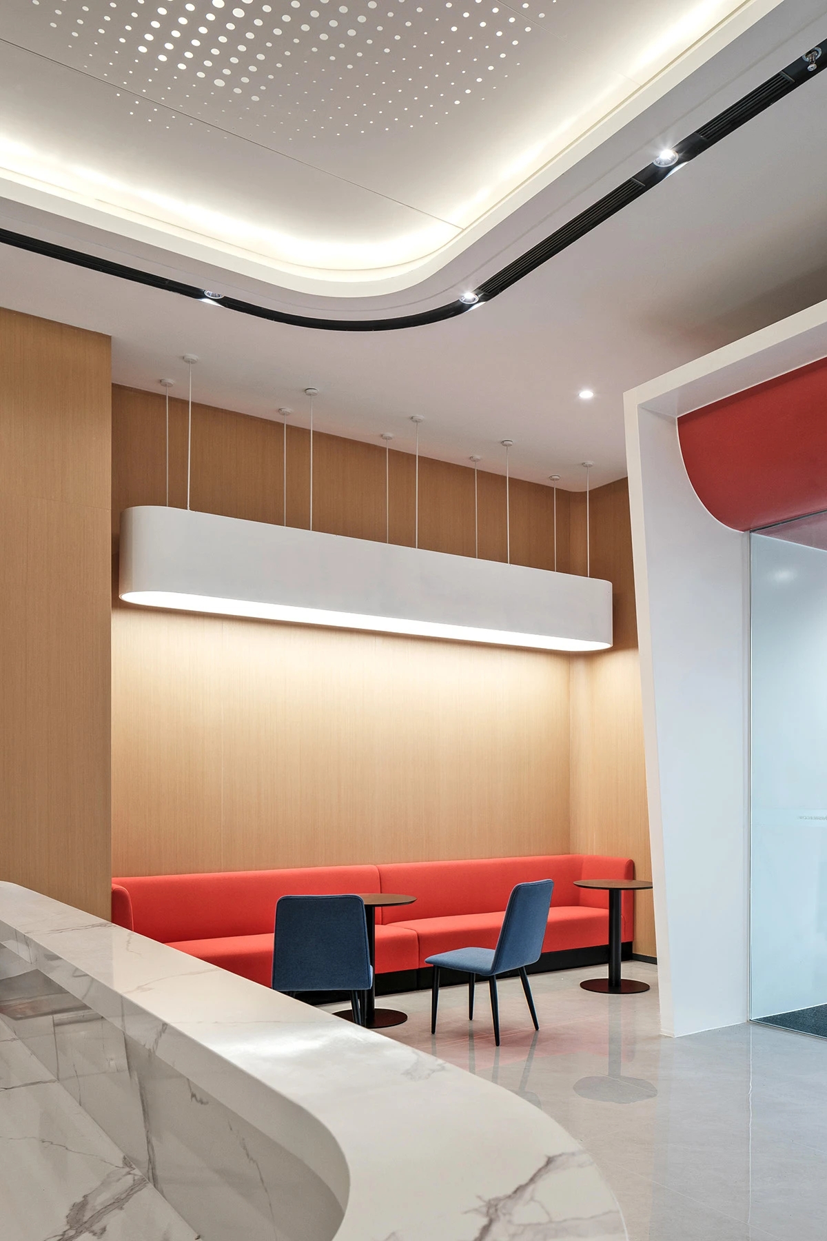 如果空间的转换是情绪的铺陈,那么进入等候区,则是视觉与功能井然有序的巧妙结合,亲和的木饰面、极简的白色吸顶灯、具有中国信仰的中国红沙发,营造出舒适的空间氛围。