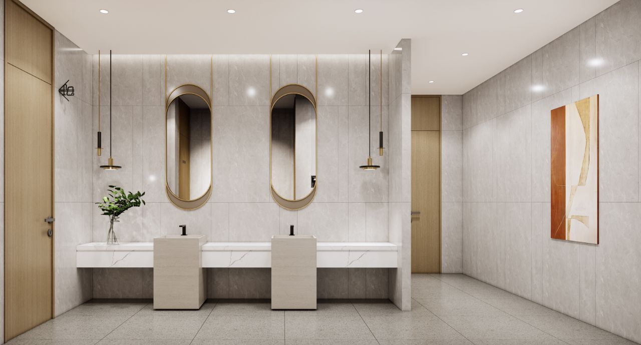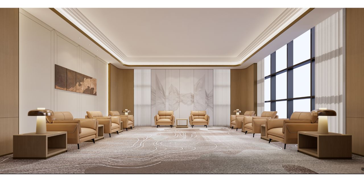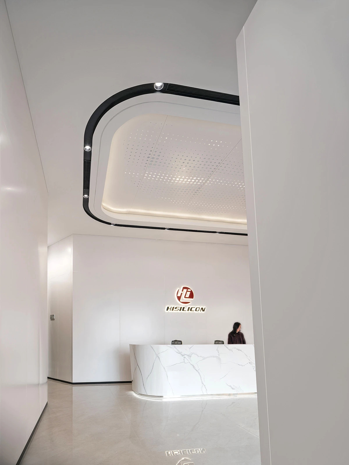 从门斗进入前厅,白色大理石前台首先映入眼帘,对称的园弧造型使空间边界更柔和。天花与前台点缀的弧形造型与灯光搭配,丰富了接待区的层次感,给人一种科技简约又静谧的空间感受。