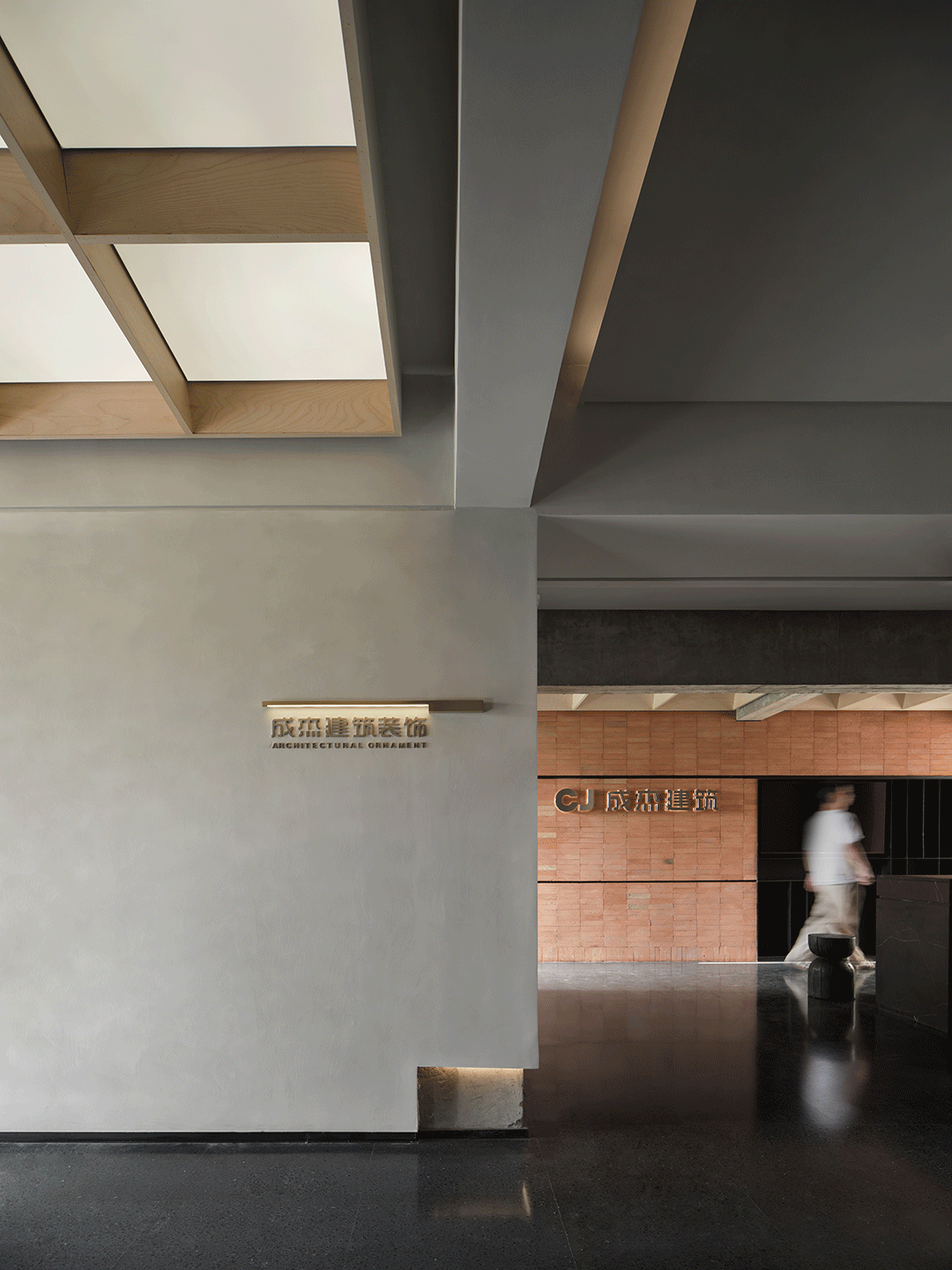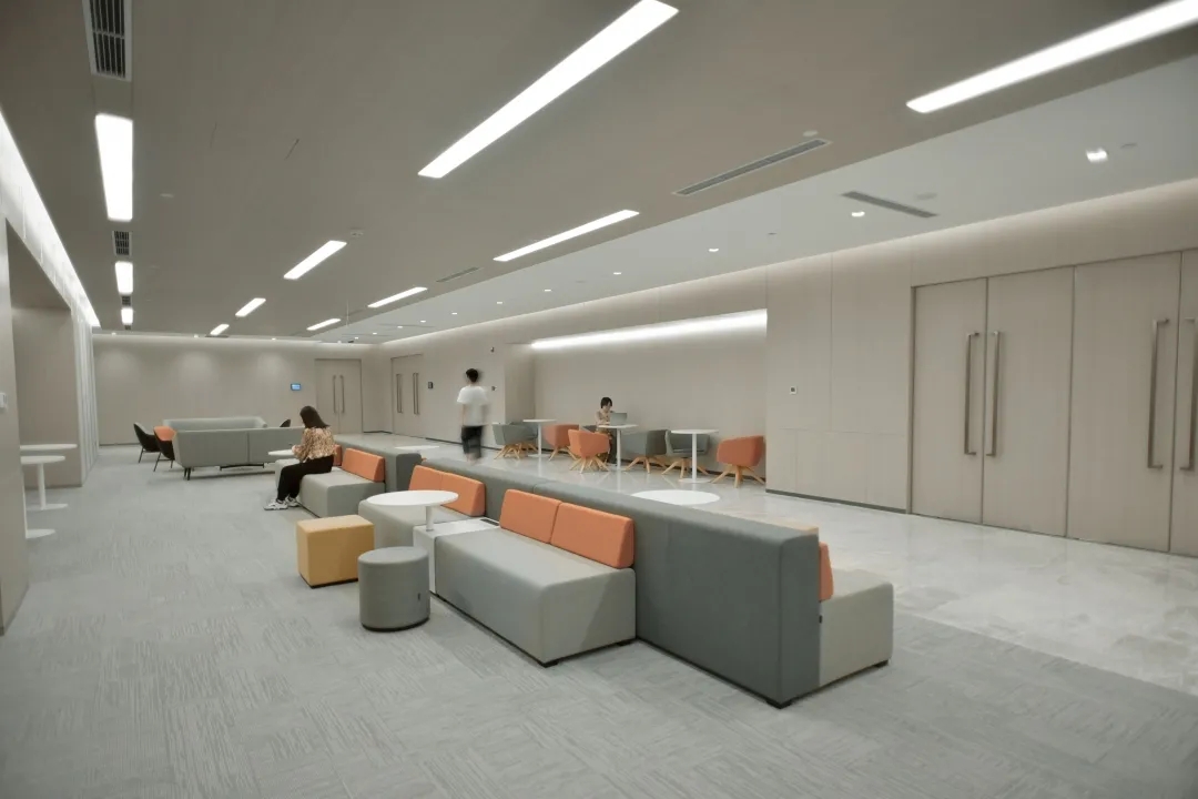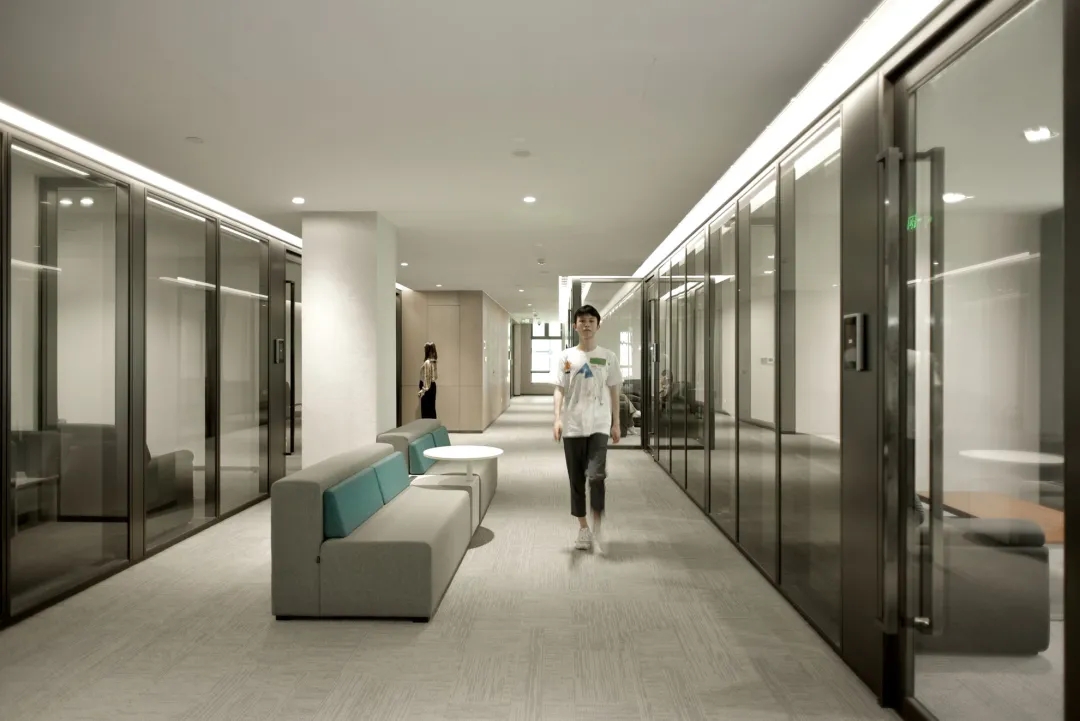 由历史展区进入现代体验区的动线过程,不仅仅只是一个空间的转换,还有是心理层面去分析场景切换的顺序性。场景化的叙事让展示的意图更明了。如果说两个平行空间跌级的处理就是设计师的心理隐喻,那么现在体验区的发光天花的处理就是直白的对。由暗到明,利用材质的变化形成对比。发光玻璃墙体的围而不合,增强空间的自我对话。玻璃墙面的光影增强空间的层次感以及穿透感。