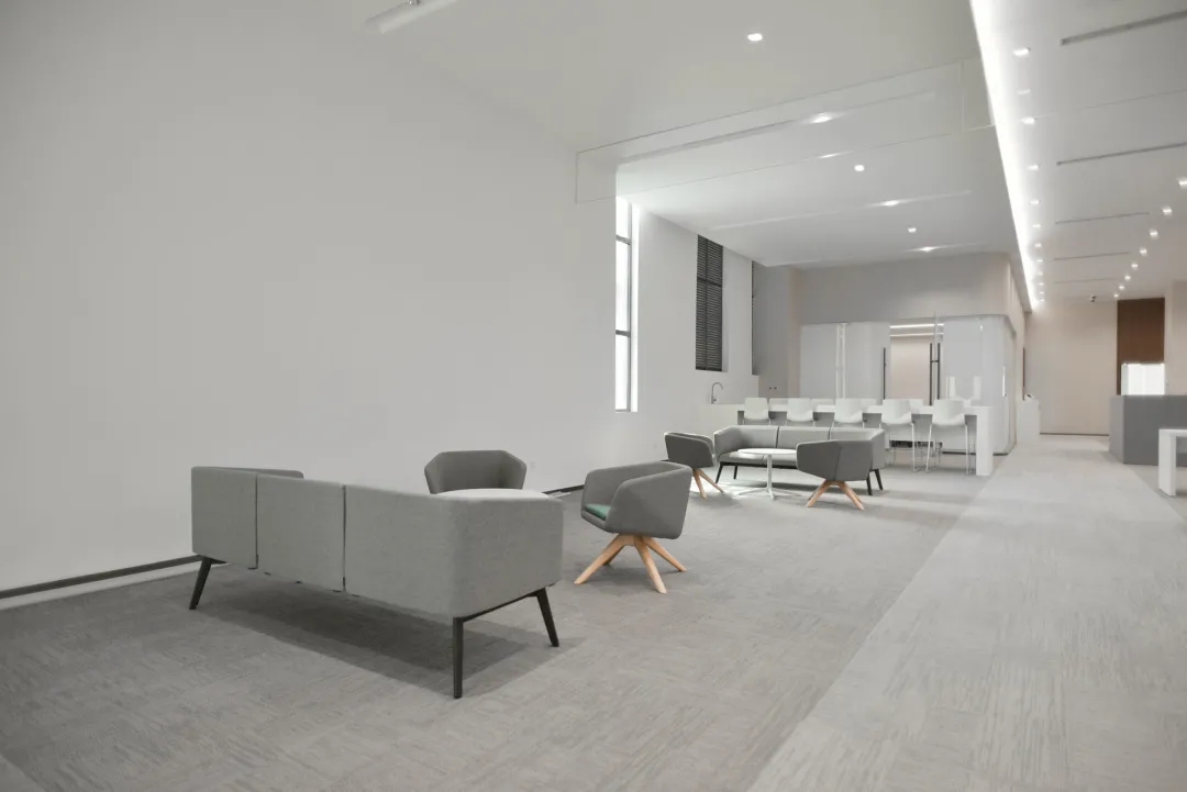 媒体路演展区展示设计离不开科技与空间的融合。智能可调灯光和深蓝矩形聚音罩,夸张而戏剧。缓解高灰调展区冷漠感。境库建筑改变固有的设计思维,在空间转折区间以充满科技感的设计,以高对比的色调和线面的处理让时间与空间进行碰撞,为受众进入下一个展示空间铺垫心理喻示。