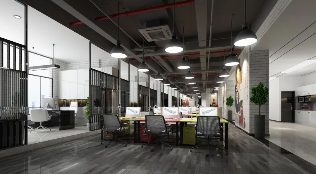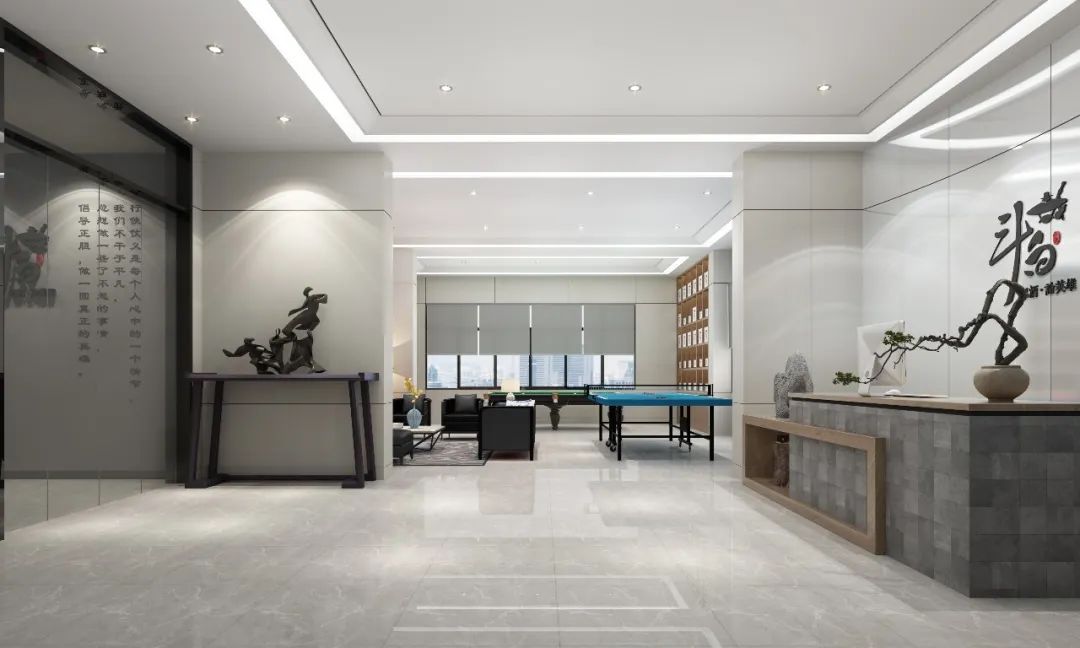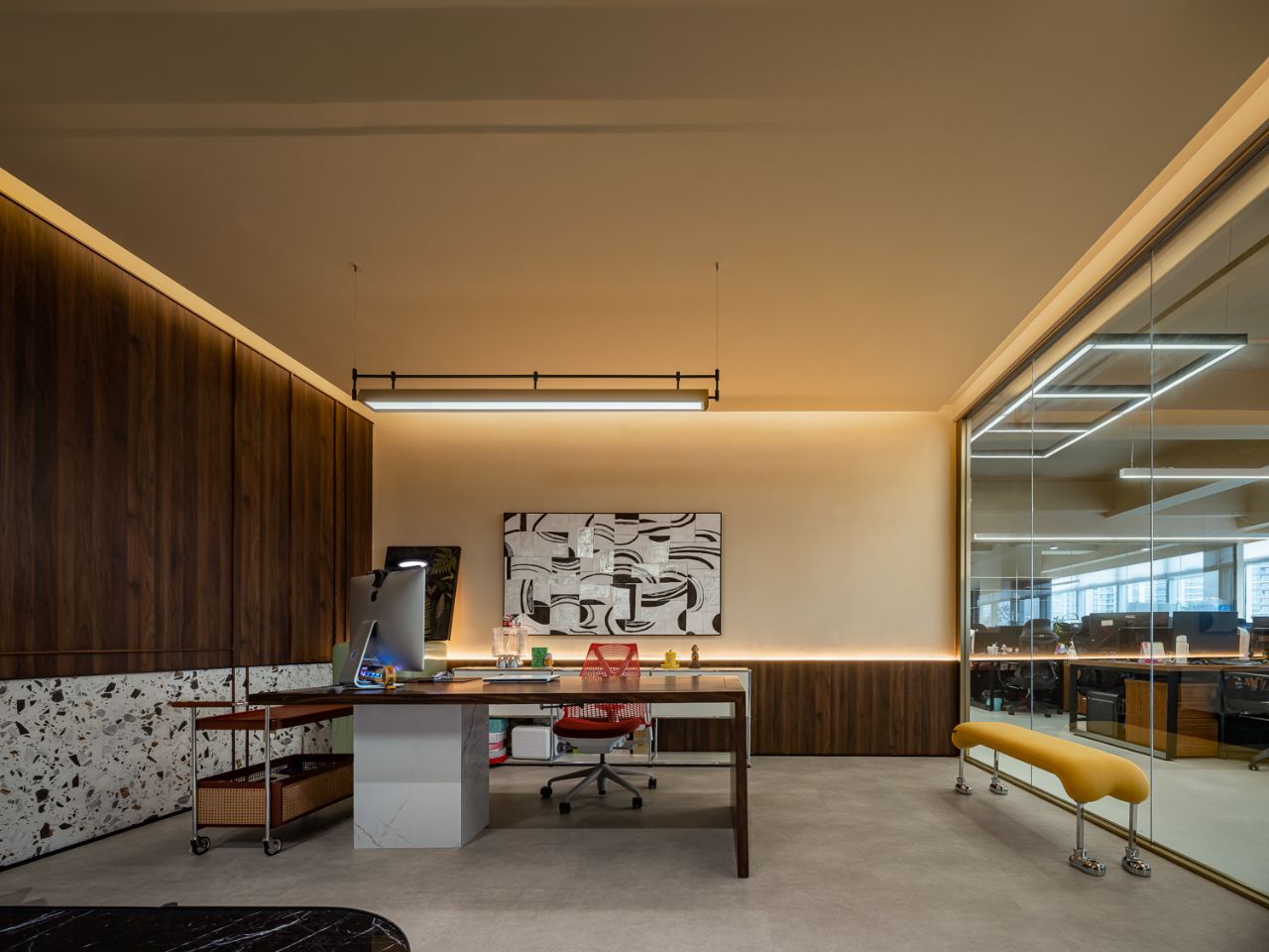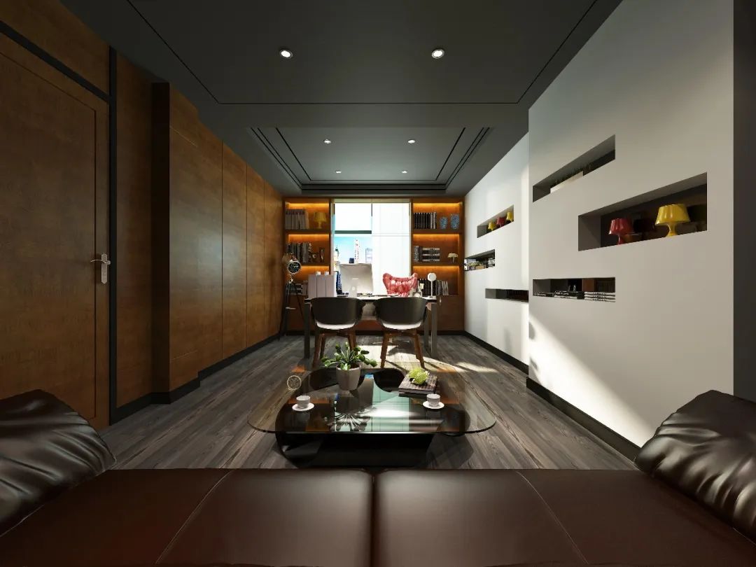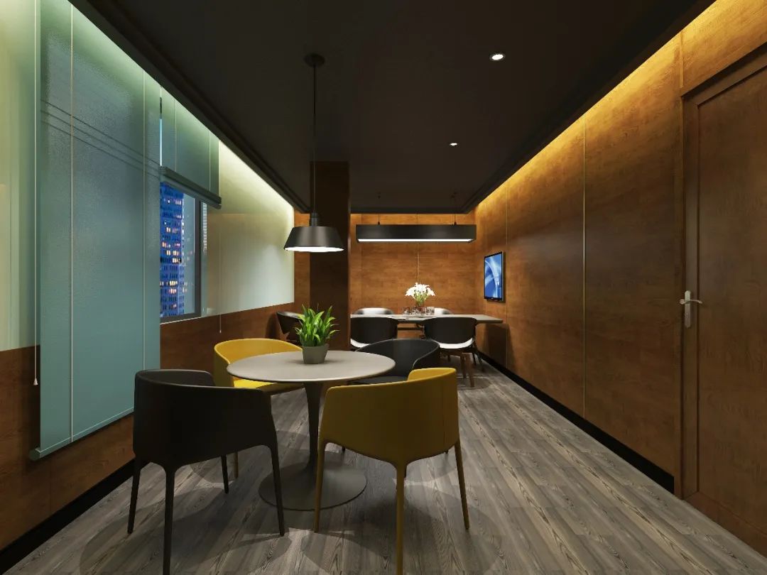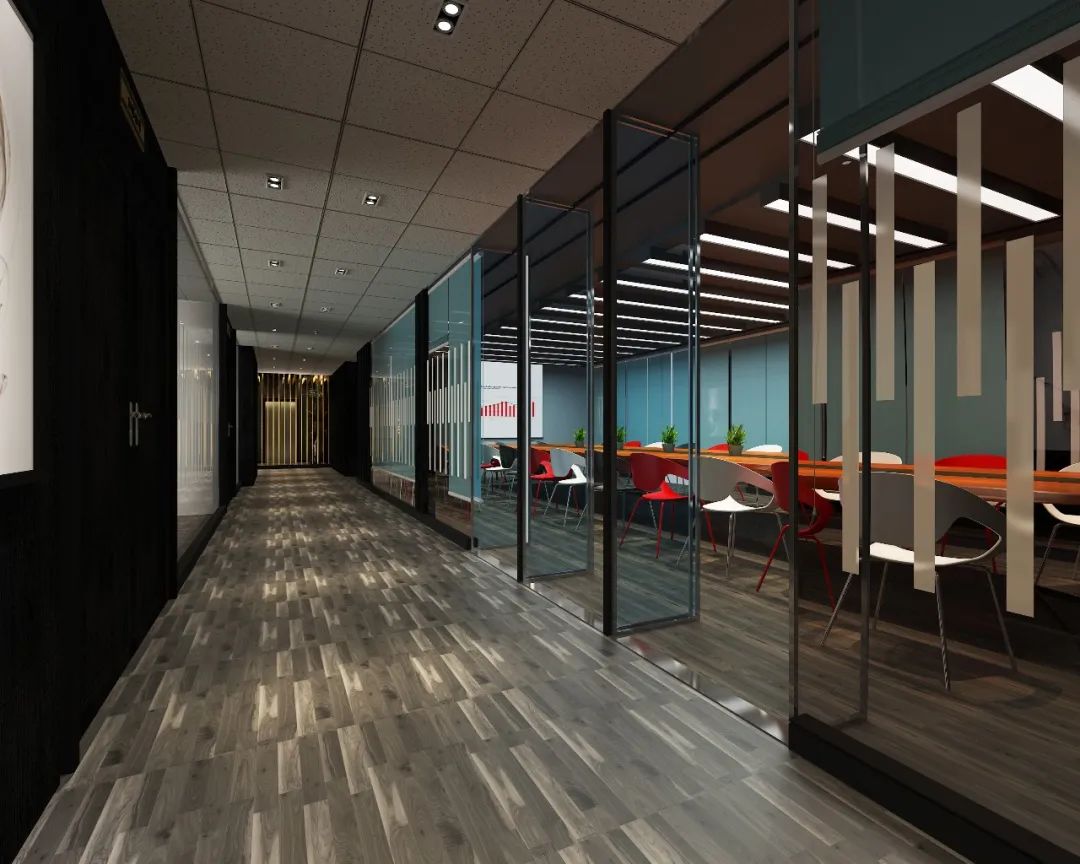 以白色木饰面为主要材质,用金属条把木饰面分割,营造出层次分明的效果,适当的盆景让空间达到一种醇香,自然的意境。设计师在办公区考虑到可能员工在工作时会视觉疲惫,整个氛围沉闷,通过颜色的对比,墙面材质的不同以及墙绘等带动空间的活跃感。会议室和经理办公室以木饰面为主要材料,针对办公对象和环境,在这些空间中是体现了沉稳,严肃的气息。