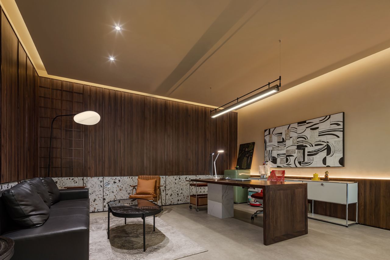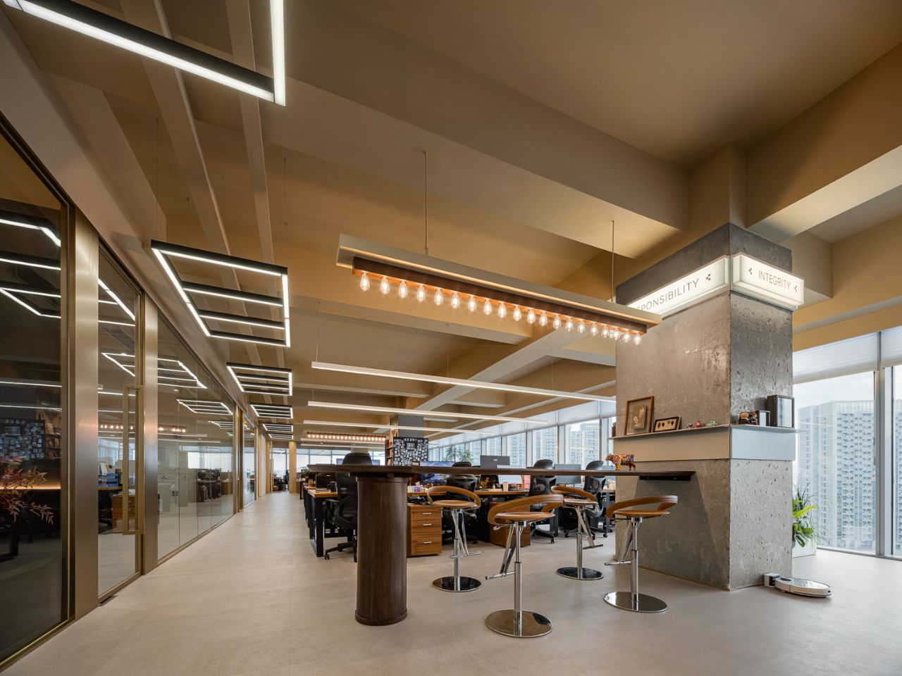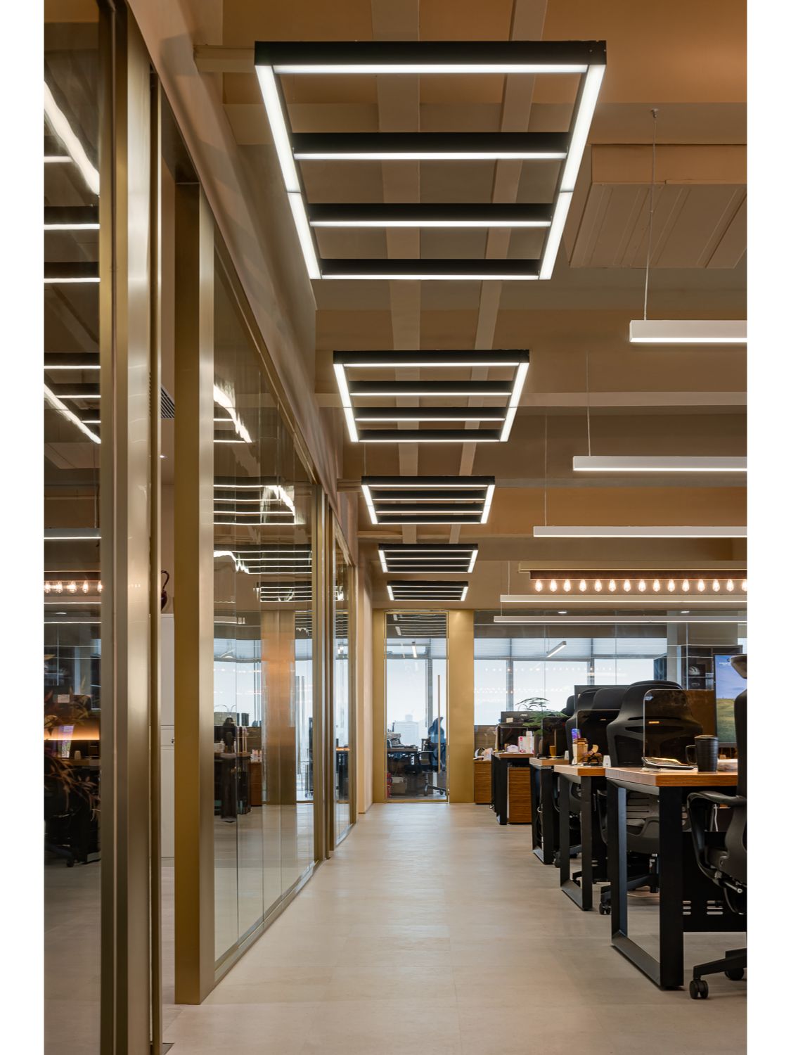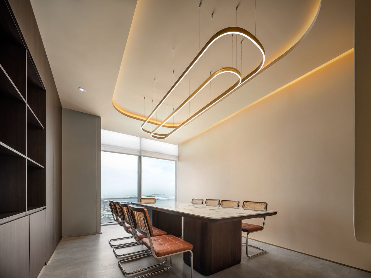 以白色木饰面为主要材质,用金属条把木饰面分割,营造出层次分明的效果,适当的盆景让空间达到一种醇香,自然的意境。设计师在办公区考虑到可能员工在工作时会视觉疲惫,整个氛围沉闷,通过颜色的对比,墙面材质的不同以及墙绘等带动空间的活跃感。会议室和经理办公室以木饰面为主要材料,针对办公对象和环境,在这些空间中是体现了沉稳,严肃的气息。