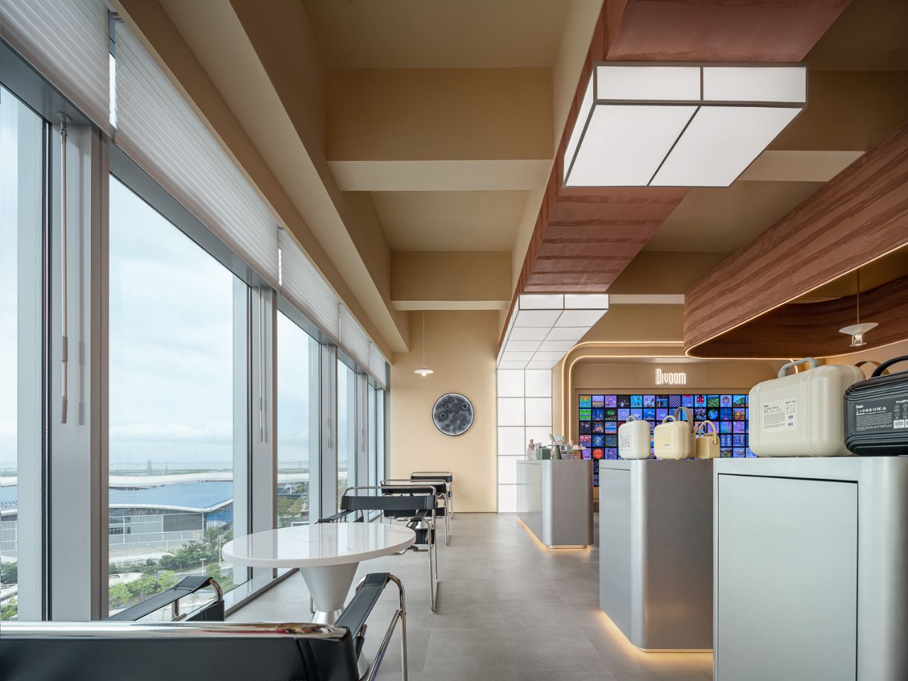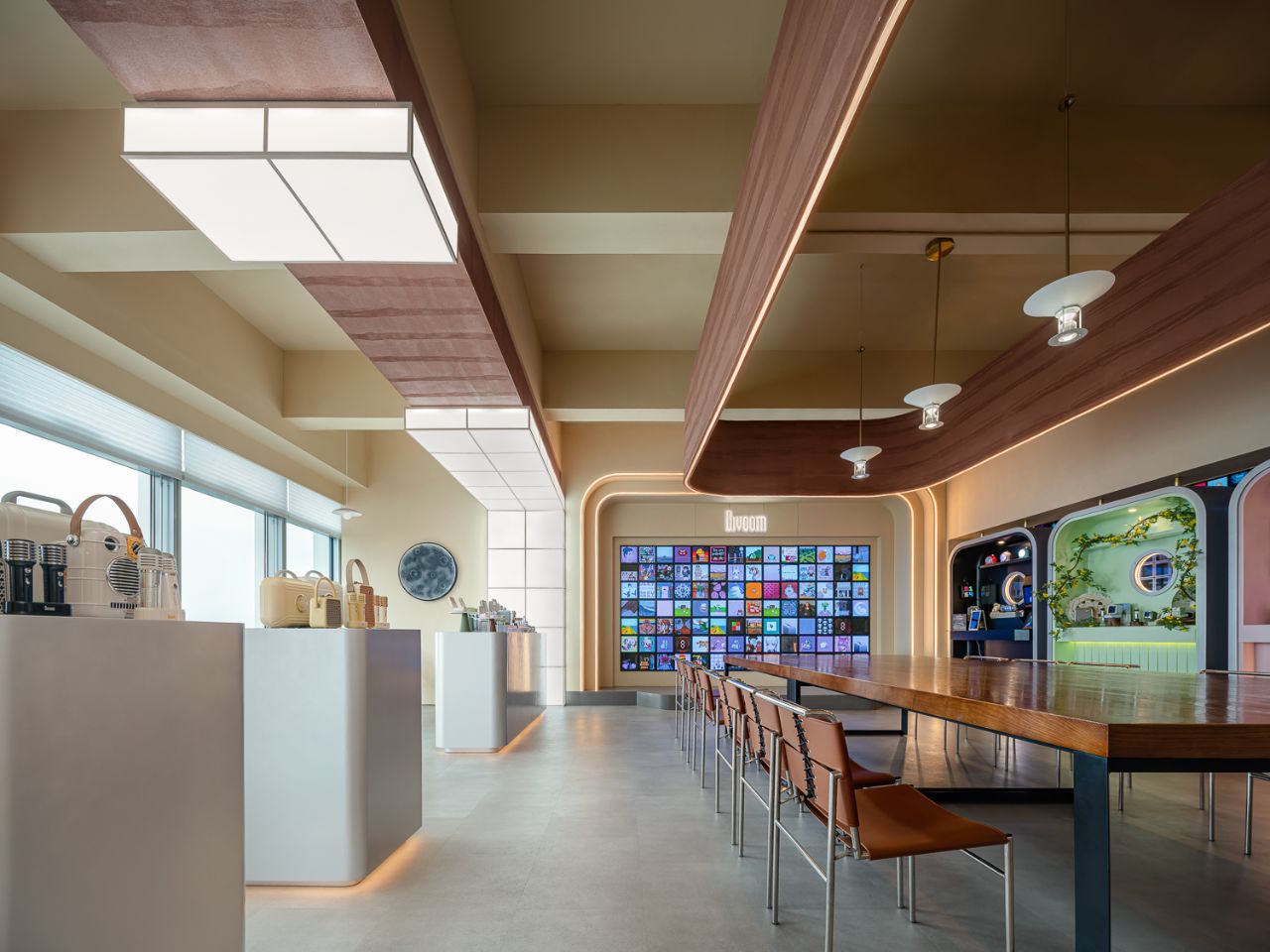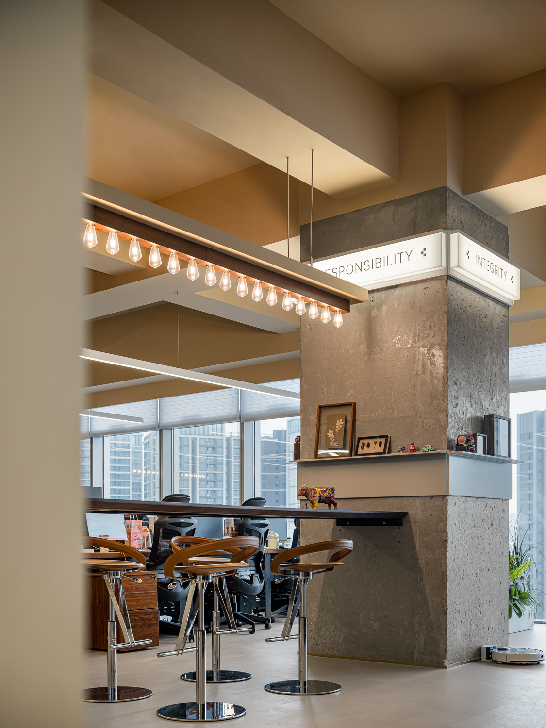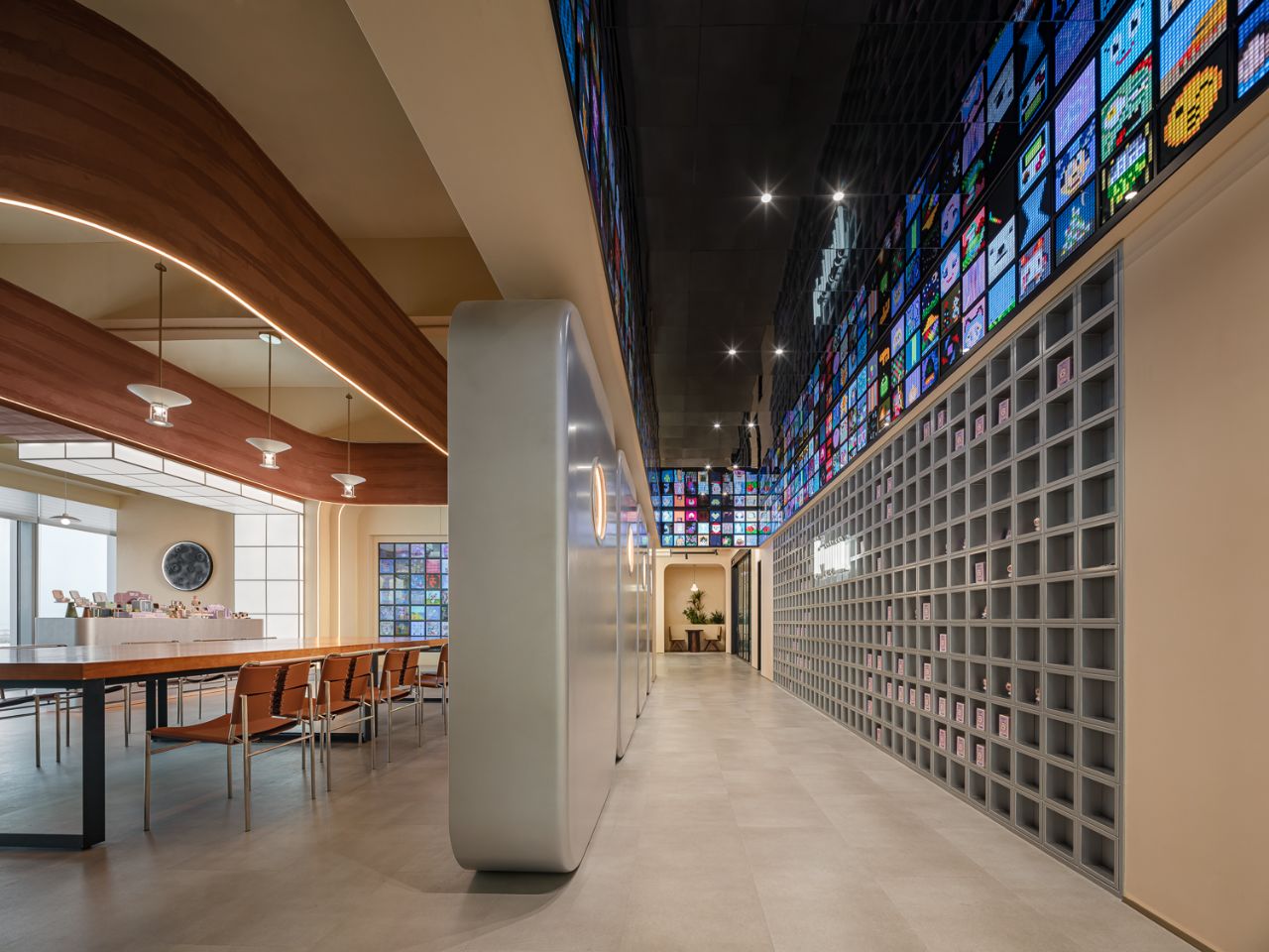 以白色木饰面为主要材质,用金属条把木饰面分割,营造出层次分明的效果,适当的盆景让空间达到一种醇香,自然的意境。设计师在办公区考虑到可能员工在工作时会视觉疲惫,整个氛围沉闷,通过颜色的对比,墙面材质的不同以及墙绘等带动空间的活跃感。会议室和经理办公室以木饰面为主要材料,针对办公对象和环境,在这些空间中是体现了沉稳,严肃的气息。
