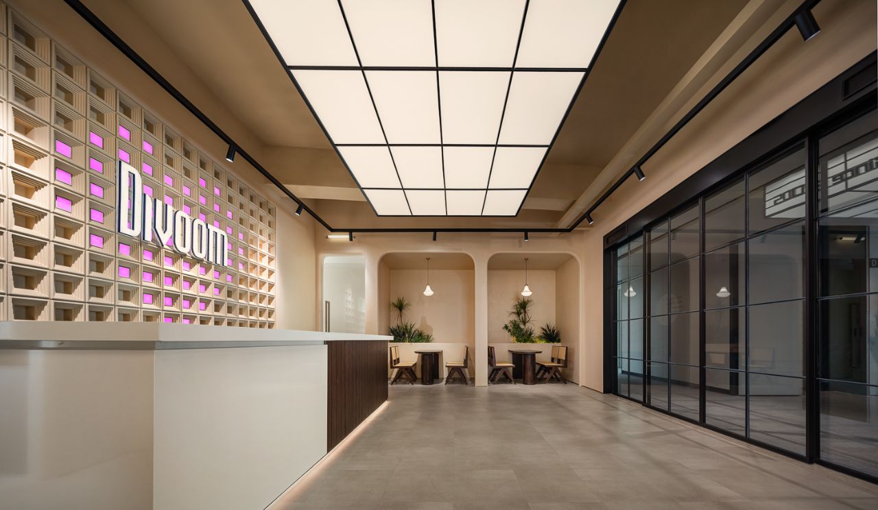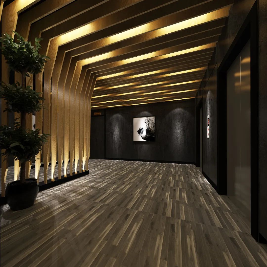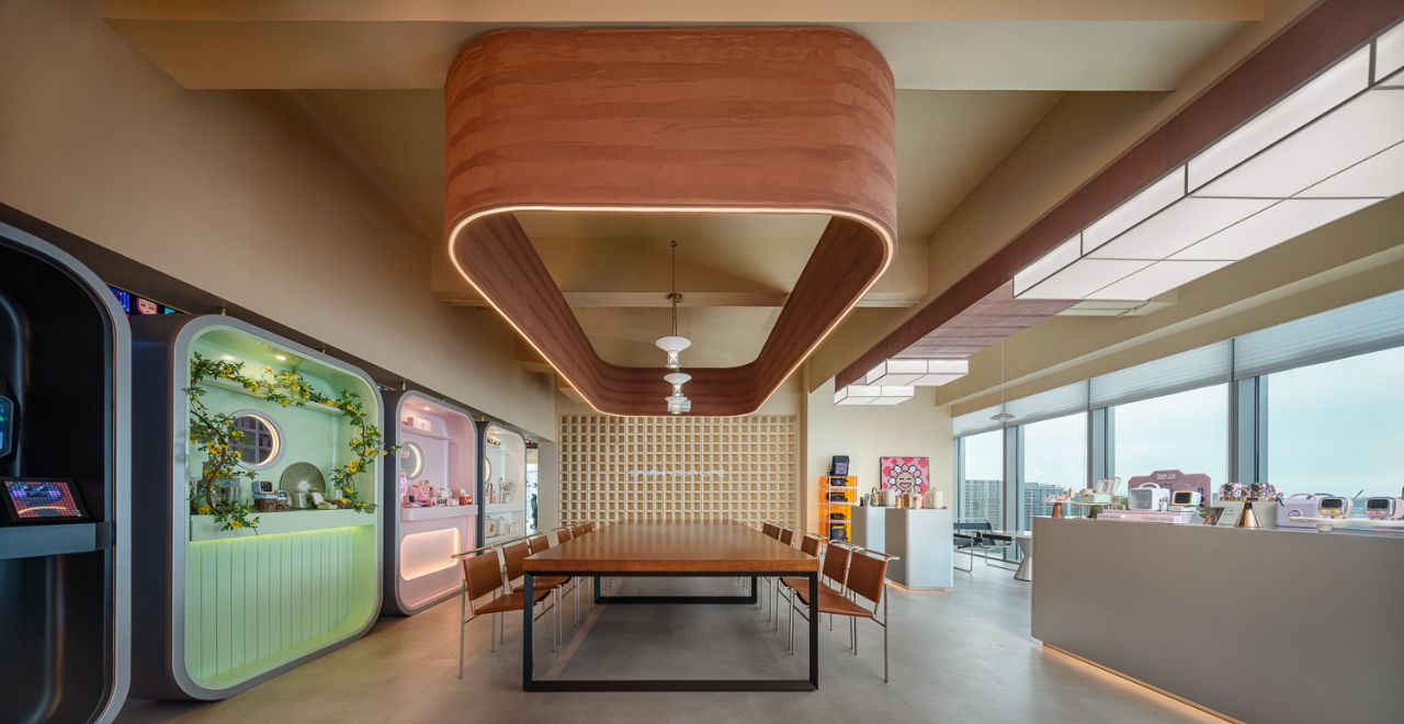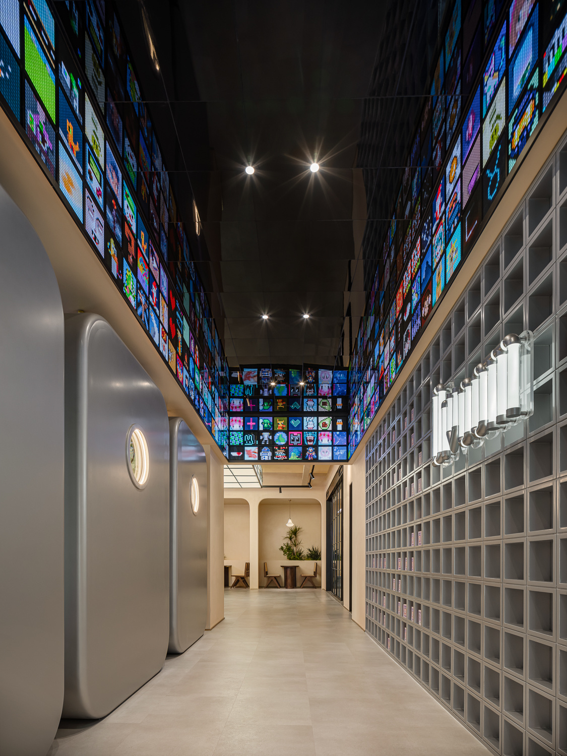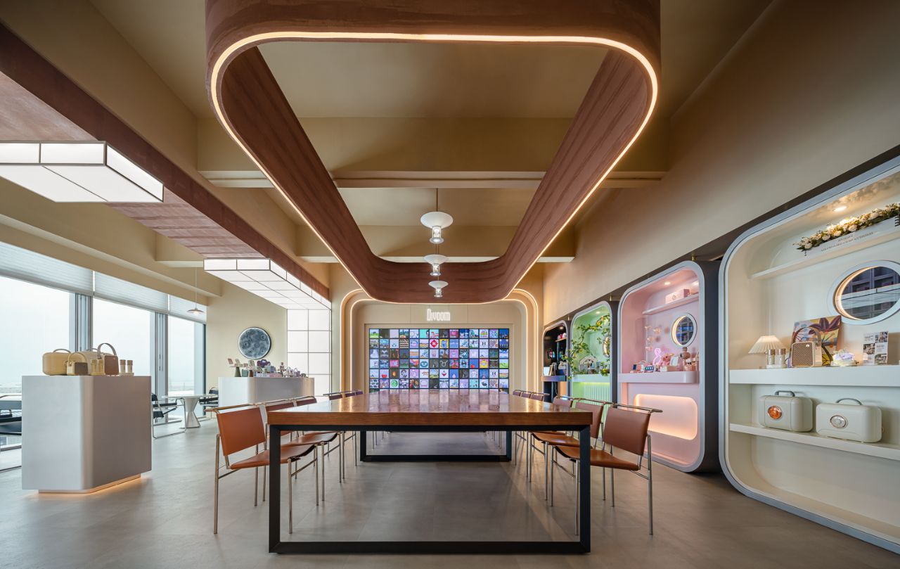 以白色木饰面为主要材质,用金属条把木饰面分割,营造出层次分明的效果,适当的盆景让空间达到一种醇香,自然的意境。设计师在办公区考虑到可能员工在工作时会视觉疲惫,整个氛围沉闷,通过颜色的对比,墙面材质的不同以及墙绘等带动空间的活跃感。会议室和经理办公室以木饰面为主要材料,针对办公对象和环境,在这些空间中是体现了沉稳,严肃的气息。