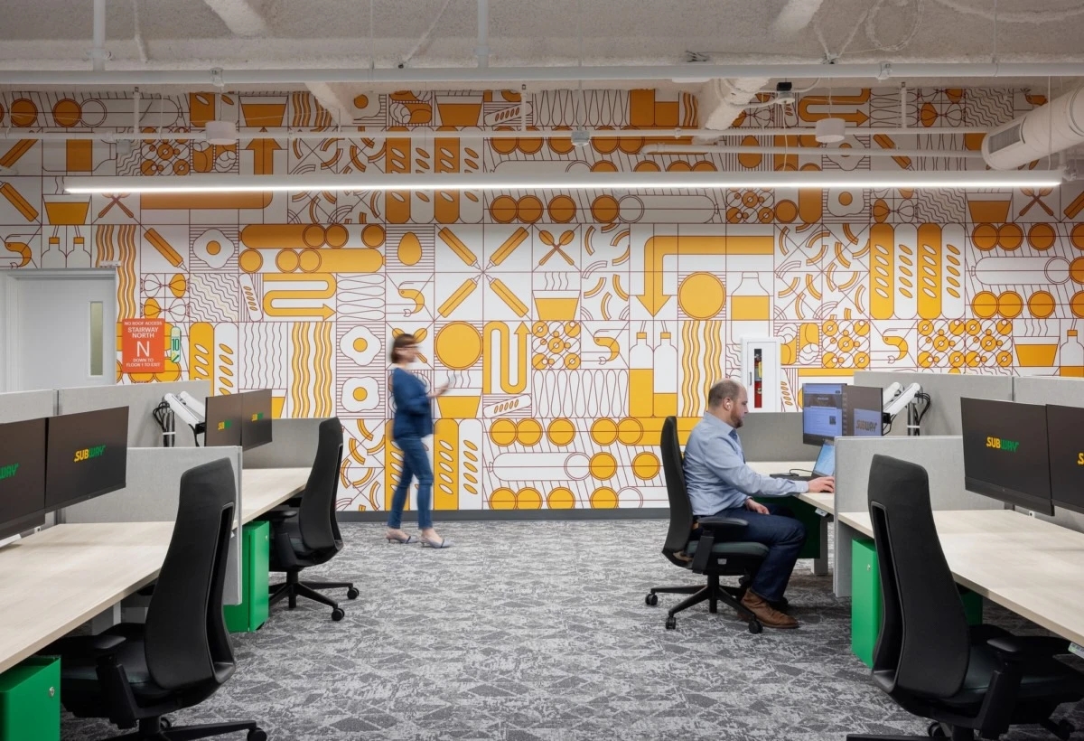 从踏入总部的那一刻起,赛百味绿®与赛百味黄®的标志性色调便如同温暖的拥抱,瞬间将访客包裹其中。这两种色彩不仅是赛百味的品牌标识,更成为了整个空间的基调,营造出一种既专业又不失温馨的氛围。基于品牌特色的六种口味,设计团队巧妙地运用颜色编码寻路策略,不仅为访客提供了清晰的导航指引,更在每个转角处巧妙地融入品牌特有的味道元素,让人在行走间就能感受到赛百味独有的风味魅力。深入总部内部,以生菜、黄瓜、菠菜、鳄梨和辣椒等赛百味经典食材为灵感的设计元素随处可见,它们被艺术化地融入墙面装饰、家具设计乃至空间布局之中,为这个现代办公环境增添了一抹清新与自然。特别值得一提的是,以食材为主题的食品储藏室,不仅展示了赛百味对食材品质的严格要求,更成为了一个寓教于乐的空间,让每一位员工都能在日常工作中深刻体会到品牌对新鲜与质量的执着追求。