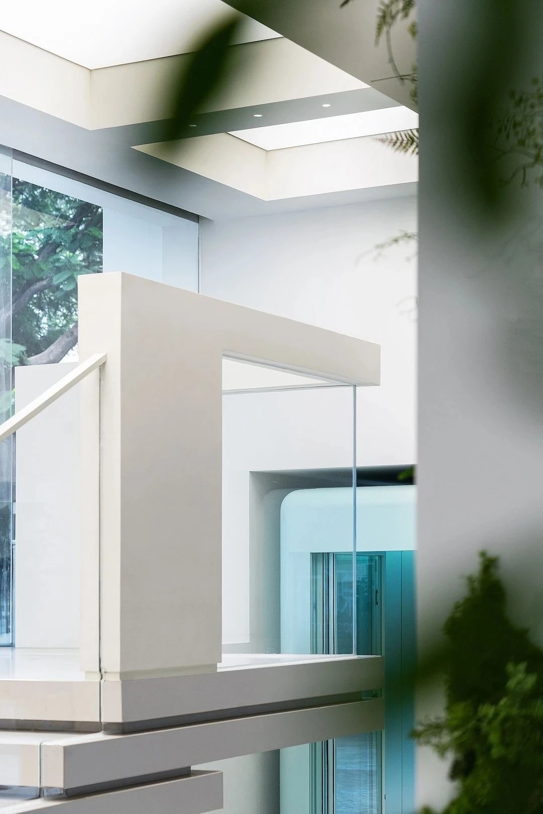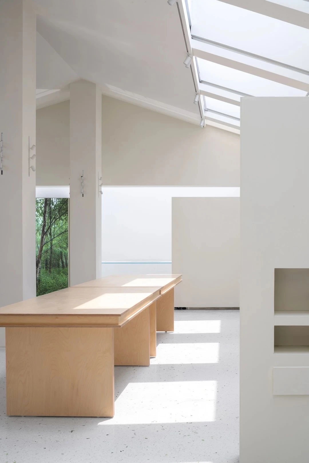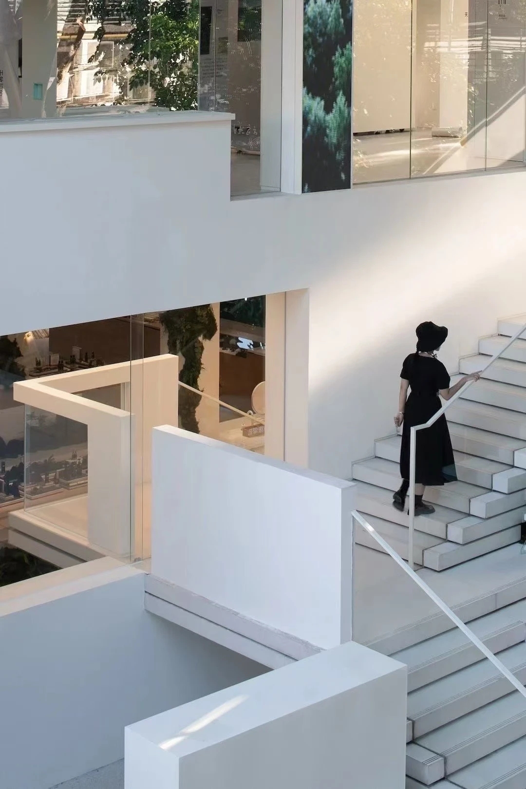 重复排列的方块和对称的结构线条组成了这个大空间,在这里,到来的朋友可以安静的聆听她的故事,聆听我们内心的本真。抛弃了复杂多变的设计,保留最原始的线条结构,大面积白色砼泥和层次光影变化传达出地是她的“真”和“纯”。