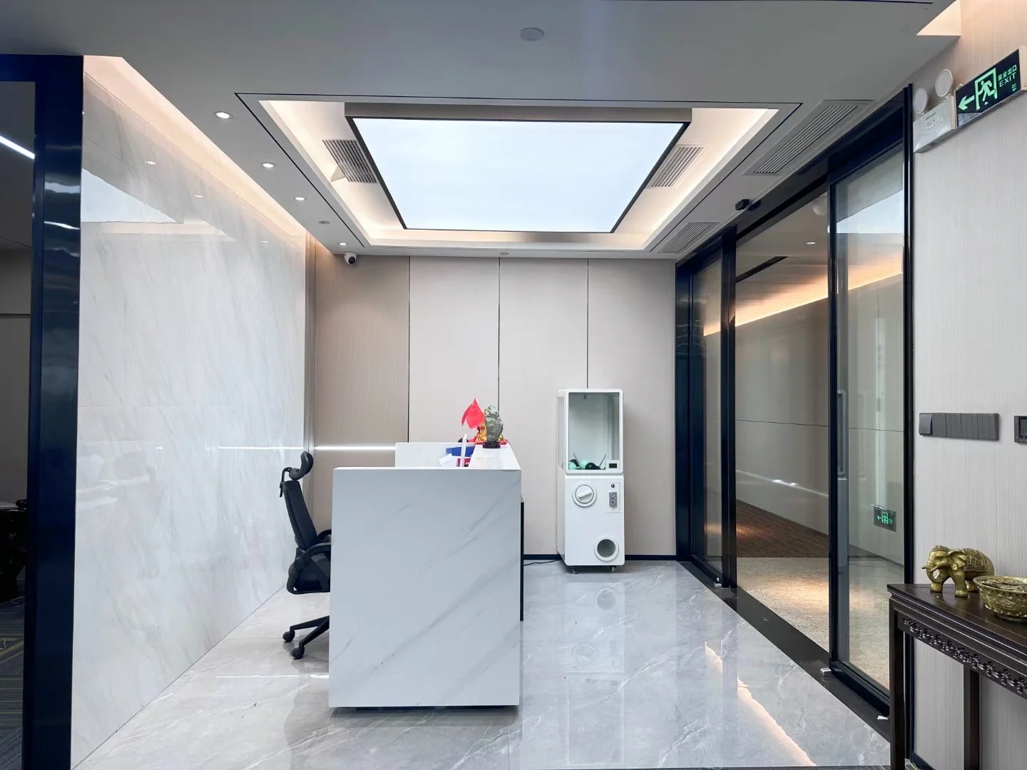 大堂承载对外展示接待和企业数百名职工的交通停留等复合功能,立品采用精炼留白的空间节奏来处理此区域。挑空的恢弘空间将制造业的专业性转化为结构性的简洁明了,黑白主色调的结合营造严谨的企业文化气质。5米长的悬挑前台与天花体块连接,形成视觉的整体感和延伸效果。