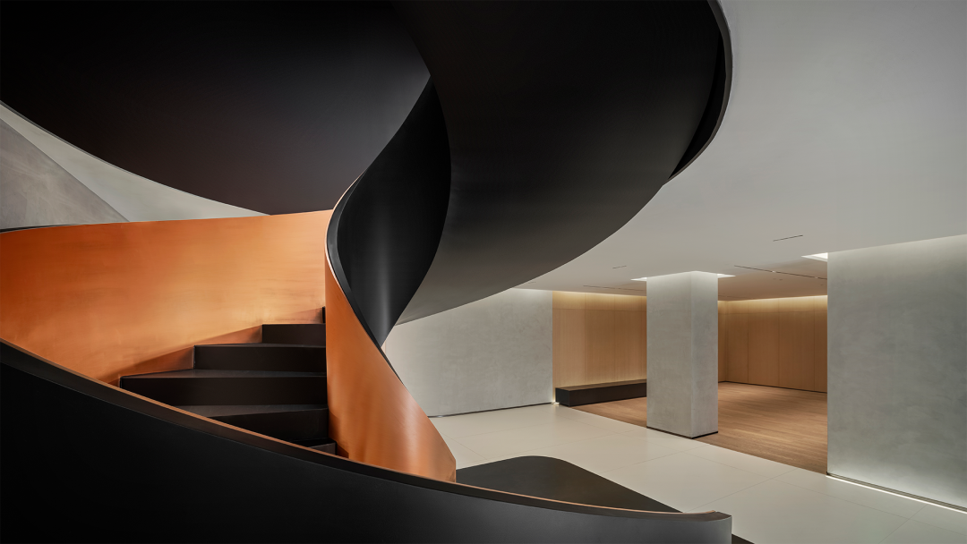 红铜材质的选择与温暖明净的木质地板和水泥墙面形成强烈的对比,带来一种糅合理性和感性的形式之美,以及空间情绪的变化,从而将用户从办公场景引入五楼的轻松接待场景。