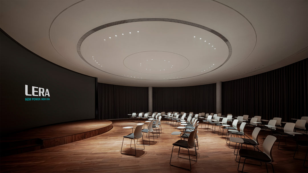 四层与五层之间通过旋转楼梯连接,是更为私密的商务接待动线。五层是企业会所,拥有开放式接待区和私密接待空间,同时设置可容纳几百人的产品发布厅,与一层的企业展厅呼应,来全面满足企业的核心实力展示。