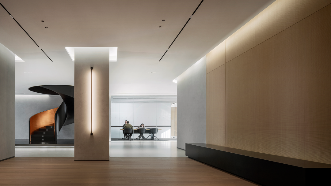 可持续的空间格调是理性的,带着冷静的思考,但某种故意而为之的冲突又反而带来惊喜。在四层的高管办公区域,立品尝试在空间中加入艺术性的塑造,使旋转楼梯成为空间视觉焦点。